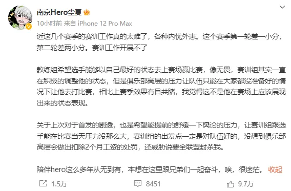 Hero尘夏在深夜发文,根本上是和俱乐部撕破脸,表现无畏上场是俱乐部高层欺压的,把hero的内部标题公之于众。 尘夏说如今的赛训工作开展不了,原来锻练组盼望等无畏状态规复,以最好的状态上场。但管理层等不及了,强行让无畏上。结果就是无畏本身没预备好,锻练组也没预备好,结果天然也好不了。而一些粉丝还不绝和尘夏久哲对立,只活在本身的天下里。 别的尘夏还透露前次提前放出首发名单根本没想到俱乐部会扣2个月工资,以致威胁要在全同盟封杀他。作为一个从建队之初就在的宿将,被本身的母队这么对待,确实心寒了。 尘夏说这些着实也是在转达久哲的意思。久哲和尘夏是一条线上的,如今的久哲显着已经对hero失去了控制。此前总有传言说久哲被排挤了,如今看来也不是空穴来风。AG月光还曾站出来声援了一波久哲。 想想从前的久哲说一不二,想怎么轮换就怎么换,如今他以为无畏还须要调解一下,但俱乐部高层一声令下,也只能服从。 久哲此前开直播时也说他和本身息争了,大概也是以为反正本身也没有话语权了,干脆就妥协算了。近来热播的战巅2当中,久哲有大量的镜头,也是唯一全程到场录制的现役锻练。大概久哲也想明白了,反正如今队伍话语权不大,能打成什么样努力就好,倒不如录录节目赚点外快。 尘夏是hero的功勋,当年的他也是为了队伍本身甘愿从选手转到锻练组的。如今落得这般地步,确实很惨,这个内容发出来以后继续待在hero就很难了。尘夏以为本身在低谷时陪同hero多年,会迎来属于本身的光辉,但发现如今的hero早就不是他想象中的战队了。 无论是久哲,尘夏还是无畏,着实都是俱乐部干初赛训的断送品。俱乐部加入赛训肯定不会有好结果,estar能创下王朝,正是由于何猷君把全部的信托都给了SK,不做任何关预。 如今hero高层强行让无畏上场,但没有调解好状态,久哲也没有了当年的铁血,尘夏的下一站在哪都不知道。只能说如今的hero,太乱了。 各人对于hero尘夏这波控诉有何看法呢?接待在品评区一起讨论吧。 |