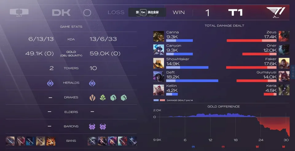 LCK夏季赛季后赛T1和DK的角逐,两边大战4局之后,T1乐成以3-1的战绩降服DK,晋级下一轮。 第一局DK上单鳄鱼,打野猪妹,中单沙皇,下路卡莎加洛;T1上单剑魔,打野大树,中单杰斯,下路霞加牛头。8分钟,Deft卡莎大招切Faker杰斯拿下一血。14分钟showmaker沙皇单杀Faker杰斯。前期DK经济领先1K。中期22分钟T1拿下听牌龙,之后选择打大龙,Keria找到机会开到showmaker沙皇,T1打出美满团战击杀DK四人后,拿下第一条大龙。27分钟T1拿下水龙魂。29分钟T1拿下第二条大龙,之后直接从野区杀到高地,击杀DK四人后,T1拿下第一局的胜利。首局输出最高的是Deft卡莎。 第二局DK上单奎桑提,打野猪妹,中单沙皇,下路卡莎加洛了T1上单鳄鱼,打野大树,中单杰斯,下路霞加布隆。4分钟Oner抓下击杀Deft,T1拿到一血。前期DK经济领先1K。中期19分钟DK拿下听牌龙。25分钟两边中路拉扯,gumayusi霞被斲丧成残血,DK拿下炼金龙魂。26分钟T1偷下第一条大龙,但是Zeus鳄鱼被DK赶来击杀。后期31分钟两边夺取太古龙,DK击杀T1四人,但是oner大树抢下了太古龙,不外退却时还是被DK击杀,DK团灭T1后,拿下第二局的胜利。POG给到了Kellin洛。 第三局T1上单剑魔,打野波比,中单飞机,下路霞加大树;DK上单奎桑提,打野芮尔,中单沙皇,下路韦鲁斯加洛。2分钟canyon芮尔抓中,击杀Faker飞机,DK拿下了一血。6分钟下路2V2对拼,keria大树被对线击杀。前期DK推掉了中路一血塔,经济领先1K。中期21分钟DK拿下第一条大龙,T1赶来后击杀DK双C两人。后期30分钟两边大龙团,大龙团,T1打出2换3后拿下第一条大龙,随后拿下听牌龙。34分钟T1拿下火龙魂,之后直接开团击杀DK四人,拿下了第三局的胜利。 第四局DK上单奎桑提,打野猪妹,中单杰斯,下路厄斐琉斯加露露;T1上单剑魔,打野芮尔,中单安妮,下路霞加洛。7分钟canyon猪妹抓上,击杀Zeus剑魔,Canna奎桑提拿到了一血。10分钟Zeus剑魔在上路单杀canna奎桑提。前期DK推掉了下路一血塔,经济领先2K。中期28分钟T1选择打大龙,DK赶来后赶走了T1,之后T1又赶来,DK也选择退却,T1拿下第一条大龙后,Oner剑魔天神下凡,共同队友击杀DK四人后,推掉了DK上路高地。后期35分钟DK在中路失误,Kellin露露率先被秒,T1击杀DK四人后,拿下了角逐的胜利。 那么,对于这场角逐,你们有什么想说的吗?欢迎在批评区留言探究。 |