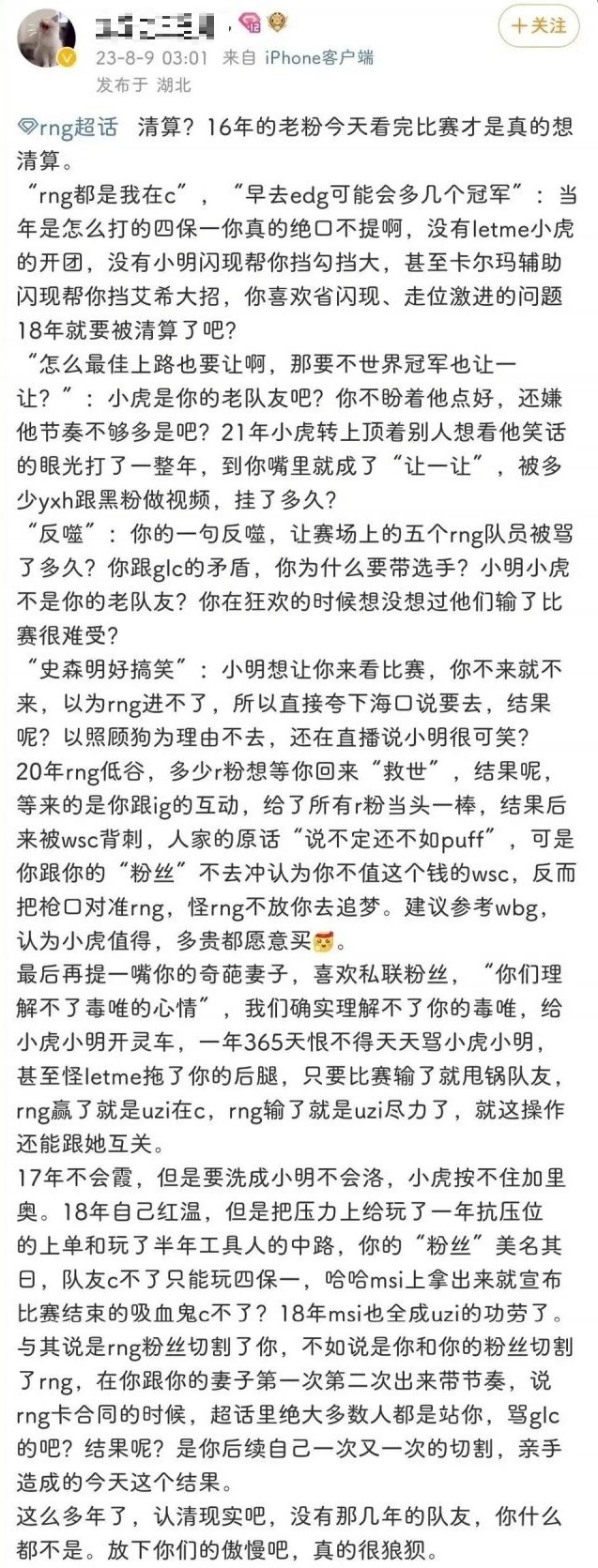 各位LPL的观众和豪杰同盟召唤师各人好,这里是天鄙俚戏汇。 LPL地域资格赛的比赛全部竣事,Uzi和EDG差一步没能晋级天下赛,在这之后关于Uzi话题的讨论热度居高不下,也出现了黑子和RNG粉丝大规模整理Uzi的事故。 此中RNG超话有粉丝发长文,罗列出了Uzi的八大斑点。 RNG粉丝整理,罗列Uzi八大斑点斑点一,RNG都是我在C。 这句话的原版本是“皇族都是我在C”,是Uzi加盟OMG之前说的话,当时还没有RNG,固然可以说RNG继续皇族,整理Uzi也替皇族整理一波,但毕竟来说,Uzi说这句话确实不太妥当,固然说当时Uzi确实是队内的绝对核心。 斑点二:早去EDG大概多拿几个冠军。 Uzi在本年3月讲授EDG比赛时间的原话,着实这句话更多是吹EDG而不是吹本身,固然这句话简直有暗示RNG不如EDG的意思。 斑点三:怎么最佳上路也要让啊,要不天下冠军也让一让。 Uzi原话,2021年颁奖仪式,当时小虎拿了最佳上路,圣枪哥没有拿到奖,Uzi说了这么一句,但在说这句话之前,Uzi狂吹了一波小虎,说小虎真的很强,不光拿下了最佳中路,转位置之后又拿到了最佳上路,如许的成绩除了小虎之外应该没有人能完成了。 背面EDG选手上台之后,Uzi直言圣枪哥有点尴尬,然后说了一句最佳上路让出去了,要不天下冠军也让了,着实团结当时的直播,这句话更多是在讥讽官方,但很多小虎听到之后就以为不惬意了,选择性忽略了前面夸的部分。 Uzi没在RNG复出,也是斑点斑点四:反噬 Uzi和RNG闹翻之后,讲授RNG比赛,RNG输了之后说了一句反噬,着实指的是俱乐部反噬,紧张针对的是俱乐部,但RNG粉丝以为是在针对他的老队友,着实当时看Uzi讲授的观众都知道,Uzi着实是支持RNG选手的,但讨厌俱乐部。 斑点五:鸽史森明不去现场 著名斑点就是Uzi之前立下FLAG说小明进决赛就去现场,效果没去,说是家里的宠物狗没人照看,这个是妥妥的斑点,简直是没能实现本身的信誉,来由也很离谱。 斑点五:没有在RNG复出 RNG粉丝指出,在RNG最困难的时期,很多RNG粉丝都等待着Uzi复出救济队伍,但Uzi没有在RNG复出,和IG各种互动,王思聪说他大概不如Puff,毕竟是无法确定Uzi当时是否告竣复出的条件,粉丝认定Uzi当时就可以复出,厥后RNG有了GALA。 王思聪说他大概不如Puff是原话,但王思聪想要引入Uzi是确认的毕竟,但是引入不了,由于条约很复杂,末了就算了,以为说Uzi大概还不如Puff。 斑点六:Uzi老婆与毒唯 第六个斑点直指Uzi老婆与毒唯粉丝接洽精密,毒唯曾经詈骂小虎小明。 斑点七:S7不会霞 Uzi在S7拿不出霞,RNG粉丝质疑,后续说洗成了Ming不会洛,属于粉丝言论,别的风哥透露说S7小虎会霞,Uzi拿不出霞大概是斑点,但洗Ming不会洛和Uzi本人无关。 Uzi斑点总结,有但是真不多总结RNG粉丝给出的七大斑点,个人以为此中有很大一部分都值得商讨,固然此中也有比力明白的可以称之为斑点的Uzi本人的举动或言论,包罗另有Uzi老婆奥咪咪。 但总体来说Uzi的斑点说真话真不多而且就这些加起来都不算严肃,幼年浮滑,性情欠好,有的时间为了直播的节目效果说出一些不太符合不太妥当的话,相比于其他斑点选手来说算是小巫见大巫了。 在LPL现在动辄就是PC,YP,涉赌,到场假赛,劈叉,打胎等牛鬼蛇神被曝光的环境下,Uzi的这些斑点根本不值一提。 赛场评价可以说Uzi打得确实是挺菜的,但他的职业态度说真话还真没得黑,对待老队友这一块,很多方面都是由于俱乐部的缘故原由,很难举行更多的互动,导致很多观众脑补一些决裂的剧情,着实没什么须要。 |