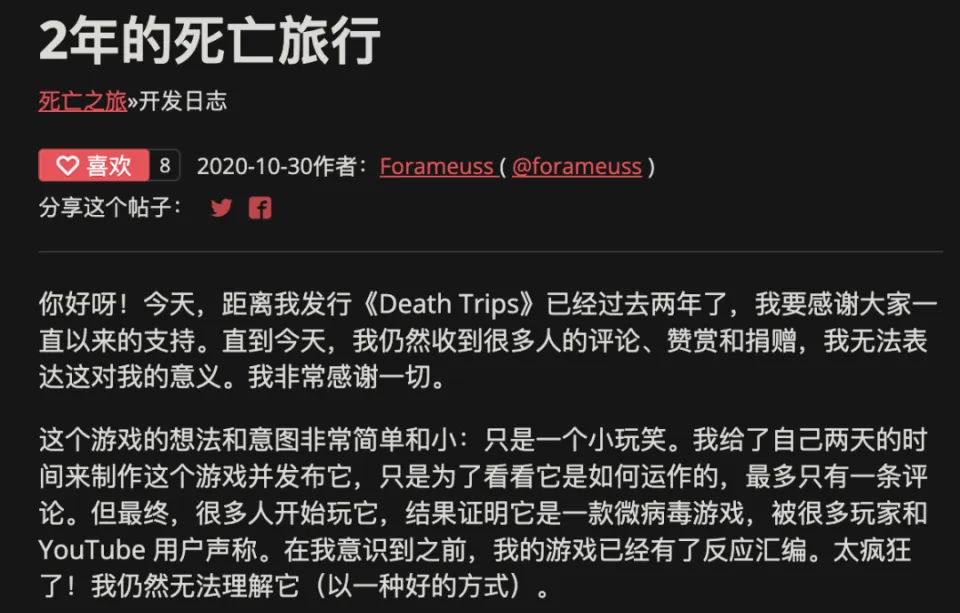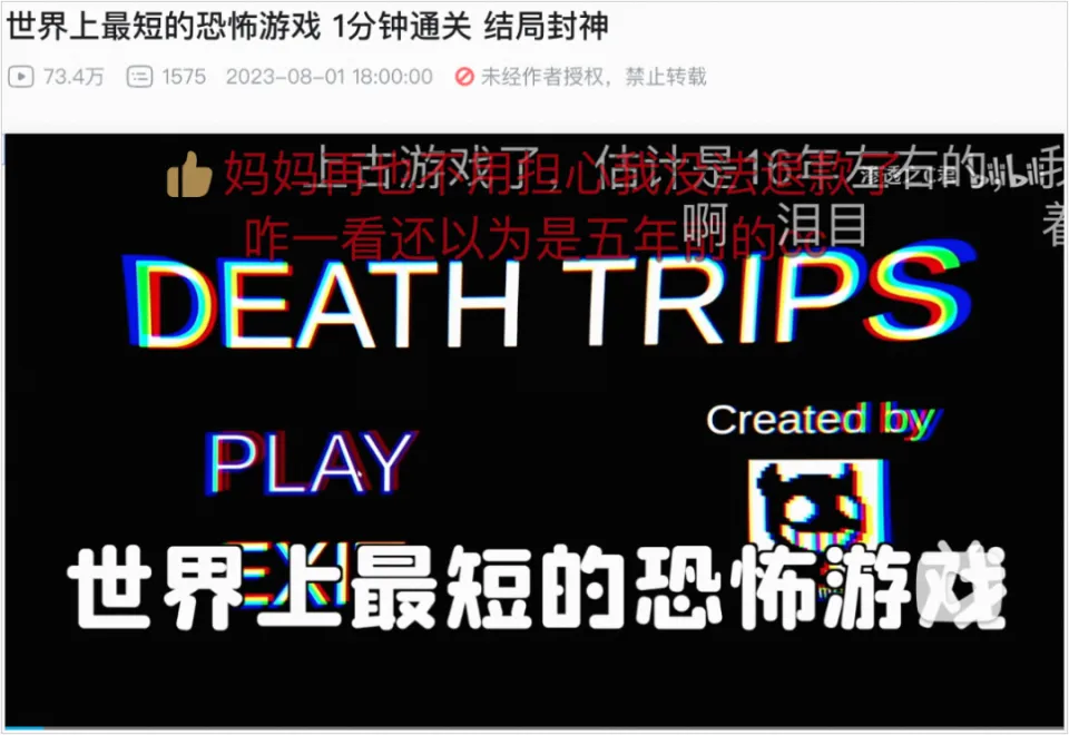 是如许的,近来逛B站时,看到一个热度很高的视频,标题叫《天下上最短的可骇游戏 1分钟通关 了局封神》。 你知道,每次看到“天下上最”“封神”如许略带浮夸的字眼时,内心总难免嘀咕:这是真这么神,还是说假如点进去就会成为标题名誉滑坡的下一个助力者? 然而花了一分半钟(此中半分钟是游戏先容)看完视频后,我想为刚才的想法狠狠道个歉。 对不起,是我浮浅了。 它是真的可以封神。 这是一款叫《Death Trips》的游戏,流程是如许的:点开游戏后,一开始是一个全玄色的屏幕,几行淳厚的白字浮现,为玩家报告这个游戏的故事配景。 “探长M. James正在观察一个名叫‘殒命密斯‘的污名昭著的杀手,末了一个受害者在一家自制旅店被发现。探长前来旅店观察,但不幸的是,凶手仍旧留在这儿......” 简便的三句先容后,画面一转,镜头来到了一家旅店的大堂,这就是我们开始探索的地方了。 大堂右边是一扇门,左边是一大堆装饰,墙上挂着一副很有逼格的画,以及一扇看起来有点可疑的窗户。 你可以在这里开动大脑使用以往的解谜游戏履历探索线索,不外到反面就会知道如许做毛用都没。 查察一番无果后我们乘坐反面的电梯往上走,电梯门打开,面前一片黑暗,来了来了可骇游戏进入正题了! 请留意,这时间——没有任何夸大身分——游戏流程已颠末去了一半。 摸黑往前走,走廊的灯突然打开,附近一片亮堂。没有jump scare,也没有什么可骇的音效。 正当松了一口吻的时间,远处出现了一个黑影: 它——朝你奔过来了: 那么我们的第一反应固然就是往回退: 却发现没办法转头逃跑,也没有办法做其他任何的使用。 眼看着对面一起狂奔过来。 好可骇,好有克制感。 你不要过来啊! 然而,眼瞅着它越来越近...... 来越近...... 越近...... 下一秒: 接着屏幕一黑,作者的名字出如今了公屏上,接着开始谢幕。 对,游戏到这儿就竣事了,整个嬉戏过程大概1分钟。 现在,观众的心情belike: 我的心情belike: 一个原来筹划吓你的鬼,在追你的过程中被花瓶绊了一跤,然后就这么摔死了......一个人上网偶然间感觉很无助啊! 看到这里,我终于反应过来为什么它可以只有短短1分钟,以及它为什么可以有上百万的播放。这反转,这幽默,先吓你再让你捧腹大笑,这可骇游戏秒变搞笑游戏的天才反转! 天下,很神奇吧? 究竟上,《Death Trips》不是一款新游戏,早在3年前就小火了一把,老玩家们大概对它尚有印象。 2018年,Alberto Navarro为了庆祝万圣节,花两天时间制作了一个小游戏(我猜制作最多半天,想剧情用了一天半),编码、音乐和音效由他本身计划,3D模子则使用的是Unity市肆和opengameart的免费开源素材。 一开始他没什么生理预期,就是个无厘头的打趣嘛,最多大概会有一位善良人士途经,然后留下一个安慰性的友好品评? 让他没想到的是,当游戏被分享到外交网站后,很快引起了人们的爱好。它短小、妨害、有梗,符合微病毒游戏的全部特性,大伙儿纷纷被它的神了局震撼,然后哈哈大笑着扩散转发。终极游戏下载人数凌驾了10万,相比制作资本而言堪称爆炸式的收益。 游戏是免费的,但也肯定有人为本身的开心脱手打赏 直到如今,每周尚有新玩家入坑,惊叹它是一个“天才般的创意”。 人们讽刺绊倒的鬼,歌颂游戏美满的氛围铺垫,然后徐徐地,一种声音冒了出来。 这只鬼看起来好可笑又好可怜,有没有人乐意去救救它啊? 一场大张旗鼓的“救鬼”活动在主播界睁开。 起首是“找线索”法。旅店走廊里那么多房间,说不定有一扇能打开;大概作者实在暗藏了什么玄机,只要让“我”大概鬼改变举措路径,大概就能让它绕开谁人殒命花瓶? 没有效,怎么找都没有效,一扇扇房门紧闭,静静地讽刺着倘佯在走廊里无助的玩家。 其次是“踢翻花瓶”法。罪魁罪魁就是花瓶你小子是吧?那只要我先冲已往砸花瓶就没有鬼会受到伤害! 于是: up:与山0v0 鬼是没有再折于花瓶,而是被玩家绊倒了。 那假如打坏花瓶后就赶紧退到一边呢? up:黑镖客梦回 这跤您优劣摔不可吗? 乃至尚有“认知改变法”,只要让韶光倒流,空间归位,这家伙不就不会死了吗! up:绮缘Rm 人们殚精竭虑,苦思冥想,但无论怎么闪避或引路...... up:一木牛 却只能看着这个家伙一次次跌倒在脚下。 这个最搞笑的鬼,也成了最让各人纠结的鬼。 直到2019年1月,一位名叫“PLATELET血小板”的up主上传了一个视频。 视频里,up主这次推着花瓶后,没有闪到一边,而是选择直直地站在走廊中心。“砰!”它来了,撞上了,诶......它没有跌倒,越过up主跑已往了? 2019年8月,up主“-Yu酱-”乐成在b站第二次复现了这个过程。 当复现乐成的一瞬间,观众和主播一起发出了惊叹声,视频瞬间被密密麻麻的弹幕覆盖。 乐成了!那只总是跌倒的笨鬼救出来了! 几个月来,它在数万人的屏幕里不停重复倒下,而这次,它的反面终于显如今玩家们面前。 “这只鬼不摔跤了,这是人类游戏史上的一大步“! 不外,事变到这里还没竣事。 还记得游戏作者Alberto Navarro吗?在2020年10月,游戏制作出来的两年后,他公布将游戏发布在Windows、Mac和Linux平台,方便更多人玩到,同时还做了一些(非常小的)关键调解,这个小小的调解直到6个月后才被玩家发现。 在那之前,各人已经默认这只鬼将作为鬼界的羞辱,在可骇游戏中留下笑柄。而2021年3月30日,b站up主“夜雨墨尘_”却公布,他找到了这个游戏的潜伏了局。 视频里,夜雨墨