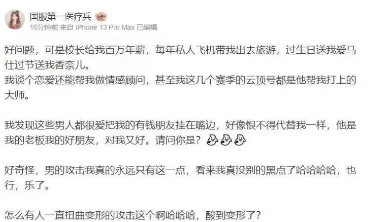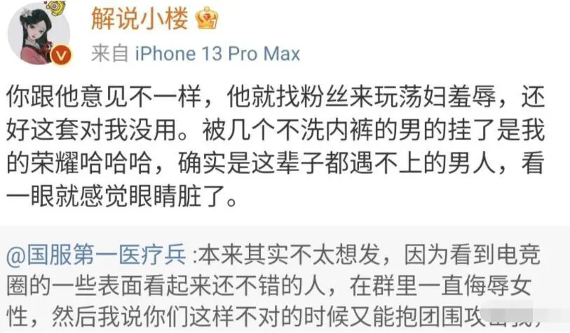 近来电竞圈的消息许多,我们知道如今电竞圈的比赛已经告一段落了,想要看到我们赛区的战队再次征战,那要比及S13天下赛才可以,而近来天下赛又还没开始,由于要比及其他赛区的夏日赛竣事才华打天下赛。 由于比赛还没有开始,以是各人看到电竞圈的八卦越来越多了,也是由于各人没有比赛看,以是八卦的内容一出现,热度直线上升,近来节奏非常多,比如有一位电竞圈的女讲授,同时也是主播的人出来博眼球了。 这个人就是小楼,各人对她应该很熟悉了,从前经常出如今讲授席,近些年新人辈出,小楼逐步淡出讲授圈,不外还是在直播,而且到场一些直播平台的节目,而且经常在交际媒体上说一些话,引起不少的节奏。 变乱是如许的,近来小楼被曝光和比本身小9岁的aki谈爱情,但是之后由于圈外人的出现,两个女的撕起来了,但是并没有引起太大的节奏,于是过了一阵子,她突然用小号开始打女拳,而且一边吐槽男性,一边又跪舔老板王思聪。 在近来她表现本身的老板王思聪每年给她百万年薪,还带本身到处旅游,言语之间满是崇敬,这还没完,小楼又出现希奇语录,用小号公开表现电竞圈满是油腻男,还吐槽男方给不起彩礼就别娶妻子。 其时她的原话是:彩礼高你可以不付,房子贵你可以不买,简而言之,就是没钱就不要完婚。结果引起了轩然大波,原来只是吐槽电竞圈的选手广泛油腻、素质差,结果说着说着开始攻击全部男性了,真不知道她在干什么。 许多人也吐槽,表现她之以是能得到王思聪的青睐,重要是由于她是“炮兵团团长”,这个意思各人本身去领会,总之,她这一些言论说出来,不会让各人以为她很锋利,而是会让各人以为她才是最没素质的人,对此你们有什么想吐槽的吗? |