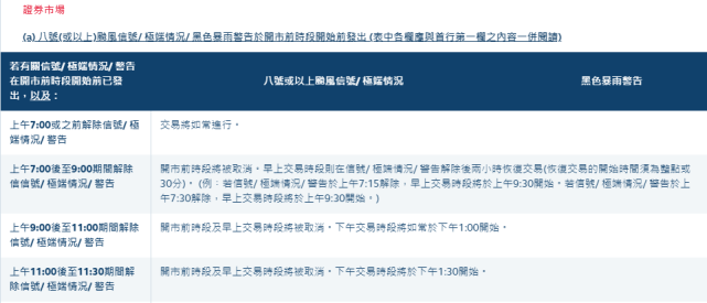 财联社8月25日讯(编辑 童古),据香港天文台发布的最新风暴信息,自周四9点20分起改为三号强风信号,香港交易业务所证券及衍生产物市场的产物将于下战书规复交易业务。 固然台风“马鞍”正阔别香港,风力将渐渐削弱,但因制止9时,香港仍维持八号狂风信号,香港交易业务所取消了本日早盘交易业务。 根据港交所此前发布的交易业务规则,如香港天文台按预期的在9至11时之间改发三号强风信号,则港股下战书交易业务时段将如常于下战书1:00开始。 图注:港股在8号以上台风信号时的交易业务规则 |