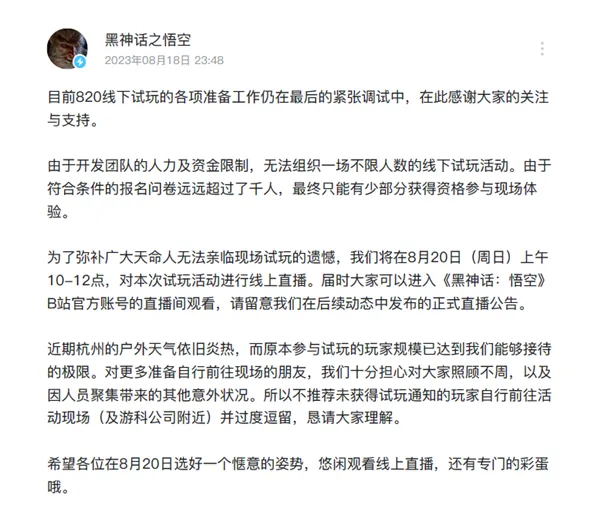 快科技8月19日消息,来日诰日就是《黑神话:悟空》一年一度公开新消息的日子了,本年则有些与众差别。 此前官方已经筛选出了一波试玩资格,将会在杭州举行线下试玩,固然中签的只有一小部门,但官方已经正式公布,将于来日诰日上午10-12点在B站举行线上直播这次的试玩运动。 官方还夸大,除了全新的游戏内容,另有专门的彩蛋公布。 根据试玩运动先容,每位玩家的上机试玩时间约45分钟,试玩内容将包罗多个首领寻衅以及独立的关卡片断。 《黑神话:悟空》是游戏科学公司制作的动作脚色扮演游戏,基于虚幻引擎5开辟,被不少网友誉为“国产3A游戏之光”。 游戏以“西游记”为被页粳“悟空”为故事主线,还原玩家心中不停存在的东方魔幻天下。 官方此前已公布定于2024年夏日发售,筹划登岸PC+主流主机平台,固然也将碰面向PS5、Xbox Series X等优化。 |
