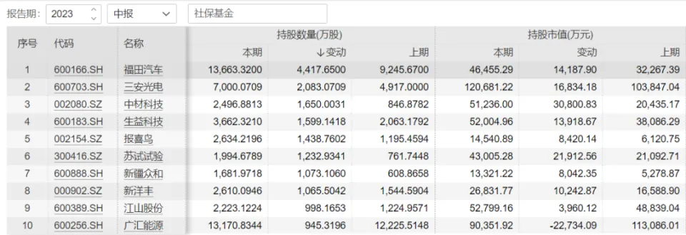 具体来看,天下社保基金113组合、天下社保基金112组合分别持有复兴通讯4704.05万股、2628.05万股,占复兴通讯流通股的比例分别为1.17%、0.65%。 菲利华被天下社保基金406组合、天下社保基金420组合、天下社保基金113组合所持有,持有股数分别为2276.26万股、1491.69万股、1435.04万股,占公司流通股比例分别为4.86%、3.18%、3.06%。 值得注意的是,二季度,天下社保基金对菲利华的持股力度有所加大,天下社保基金113组合新增持股1435.04万股,对菲利华合计持股市值达7.0604亿元,成为菲利华的第五大流通股股东。 资料表现,菲利华驻足于石英玻璃范畴,专注开辟气熔石英玻璃、合成石英玻璃、电熔石英玻璃与石英玻璃纤维及制品。本年二季度,菲利华股价表现较好,涨幅达12.07%。 福田汽车被大幅加仓 数据表现,二季度,社保基金对福田汽车、三安光电、中材科技、生益科技、报喜鸟等58只个股举行了加仓。 福田汽车被社保基金合计增持了4417.65万股。此中,天下社保基金107组合新进持股4866.16万股,成为福田汽车第九大流通股股东;天下社保基金118组合减仓448.51万股,由一季度末的第四大流通股股东变为第五大流通股股东。 天下社保基金103组合对三安光电的持股数量也有所增长,二季度新增持股2083.07万股,由此前的4917万股新增至7000.07万股。中材科技被天下社保基金113组合、1106组合新进持有,持股数量分别为1994.81万股、502.07万股。 社保基金增持数量最高的10只个股
