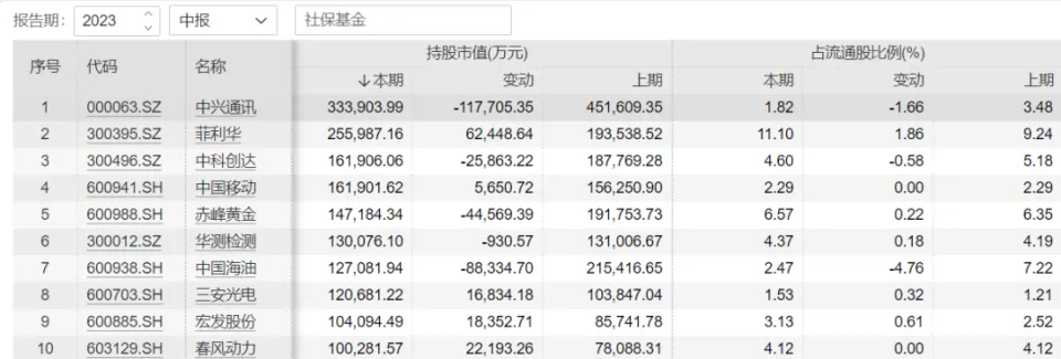 随着上市公司半年报的一连披露,社保基金的最新持股情况也浮出水面。 数据表现,停止8月20日,已有136只个股的半年报中,前十大流通股东名单出现了社保基金的身影。社保基金合计持仓市值为474.15亿元。 数据表现,停止二季度末,社保基金持仓市值超10亿元的个股有10只。此中,复兴通讯被持股市值最高,达33.39亿元。 复兴通讯被持股市值最高 从个股来看,停止二季度末,社保基金对复兴通讯、菲利华、中科创达、中国移动、赤峰黄金的持股市值居前,分别为33.39亿元、25.60亿元、16.19亿元、16.19亿元、14.72亿元。 社保基金持股市值最高的10只个股