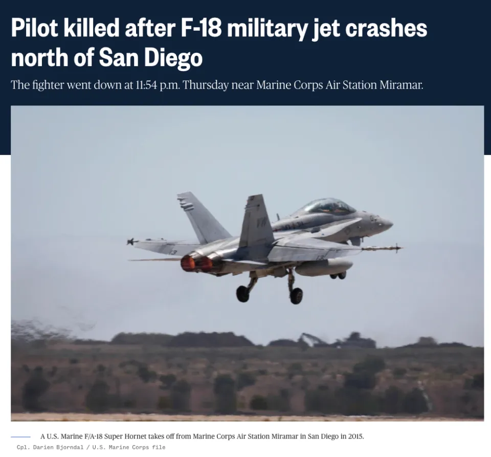 据美国广播公司等美媒报道,美国水师陆战队称,周四深夜11点54分,一架战斗机在圣地亚哥北部坠毁,机上唯逐一名飞行员丧生。 美国水师陆战队第2水师飞机联队周五发表声明体现,这架F/A-18 “大黄蜂”战斗机于沉寂洋标定时间11:54分在水师陆战队米拉马尔空军基地附近坠毁。搜刮和救济职员已经找到了当时执飞的美国水师陆战队飞行员,已证明他已在变乱发生时就地殒命。“怀着极重的心情,我们向这位水师陆战队员的家人体现哀悼。” 据报道,坠毁的飞机附属于总部位于南卡罗来纳州博福特的水师陆战队全天候攻击中队224,当时在加州实行练习使命。 根据网络到的音频,飞行员在飞机坠毁前试图跳机逃生。 如今还不清楚坠机的缘故起因,也没有迹象表明地面上有产业丧失。 木木 |