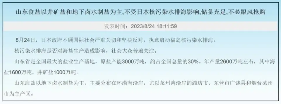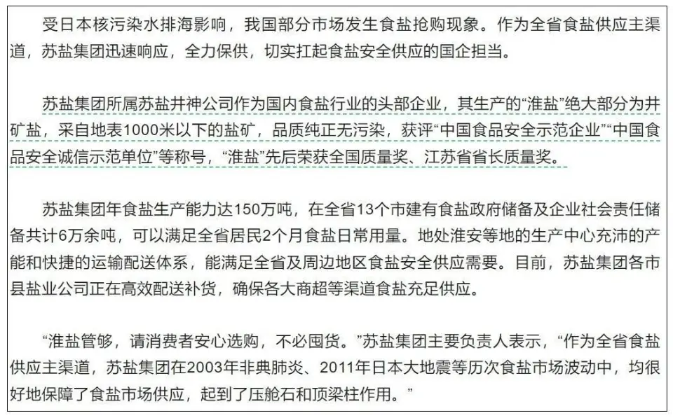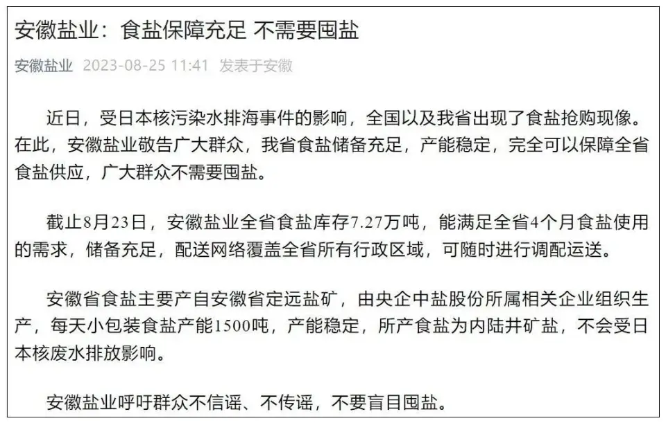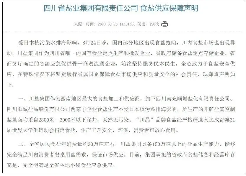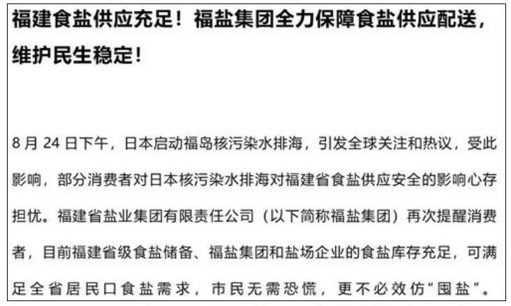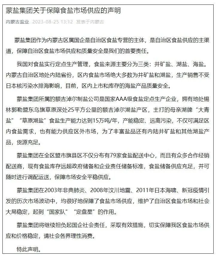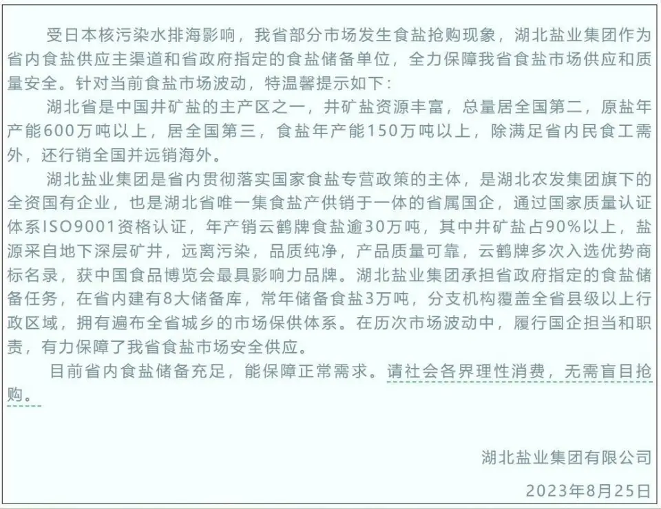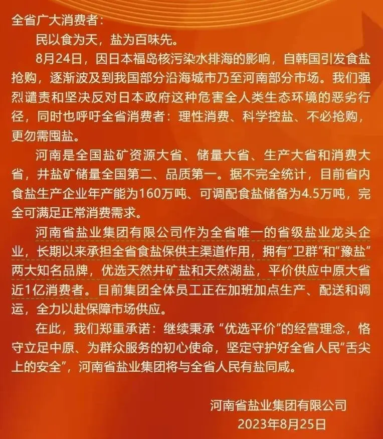 克日,受日本核污染水排海影响,部门市场出现抢盐、囤盐征象。对此,中国盐业团体、川盐团体、福盐团体、江盐团体、安徽盐业团体等多地盐业公司发文称,食盐储备供应富足,下令社会各界理性斲丧,不要盲目抢购。 茶卡盐湖食用盐储量够天下吃70年 8月25日,青海省盐业股份有限公司发布声明称,该公司拥有“茶卡”“柯柯”两个自然湖盐采矿权,同时具备两个食用盐定点生产资质和天下食盐定点批发企业证书,可开采湖盐储量约14亿吨,“茶卡”牌食用盐产能为30万吨/年,食用盐储量可供天下人民食用70年。 青海省盐业股份有限公司负担着青海省内食盐应急碘盐储备任务,现在储备富足,能满足本省斲丧者至少6个月食用盐需求。 公司具有完备的产物格量管理体系和食盐安全追溯体系,食盐产物可以做到源头可追溯,质量安全有保障。包管食用盐贩卖代价稳固有序,公司正在积极以赴保障食用盐市场供应,请社会各界理性斲丧,不要盲目抢购。 中盐及多地盐业公司发文 中盐团体 24日,中盐团体发布关于保障食盐市场供应的声明称,当前我国的食盐产物布局占比为井矿盐87%、海盐10%、湖盐3%,井矿盐和湖盐生产均不受日本核污染影响。中盐团体是天下最大的食盐生产企业,食盐产能凌驾1000万吨/年,食盐储备供应富足。下令社会各界理性斲丧,不要盲目抢购。 川盐团体 25日,四川省盐业团体有限责任公司发布食盐供应保障声明:川盐团体作为西南地区最大的食盐加工和供应商,旗下四川南充顺城盐化有限责任公司、四川顺城盐品股份有限公司两家子企业食盐生产不受日本核污染排海影响,所生产的井矿盐真空制盐盐卤均采自2800米—3000米以下深井,自然无污染。四川全省住民食盐年斲丧量约30万吨左右,川盐团体具备150万吨以上的盐品生产本领,可以大概完全满足川内斲丧者餐桌用盐需求,包管市场供应。 安徽盐业团体 25日,安徽盐业团体发文表现,安徽省食盐储备富足,产能稳固,完全可以保障全省食盐供应,广大群众不须要囤盐。停止8月23日,安徽盐业全省食盐库存7.27万吨,能满足全省4个月食盐利用的需求,储备富足,配送网络覆盖全省全部行政地区,可随时举行调配运送。安徽省食盐紧张产自安徽省定远盐矿,由央企中盐股份所属相干企业构造生产,天天小包装食盐产能1500吨,产能稳固,所产食盐为本地井矿盐,不会受日本核废水排放影响。 江盐团体 江盐团体25日发布声明称,江盐团体系江西省内最大的盐资源综合开发利用企业,制盐产能凌驾265万吨/年,食盐产物以自采井矿盐为底子生产,盐卤净化源自封存于千米的地下盐层,阔别污染,品格纯净。在江西省内拥有美满的产销一体布局和覆盖城乡的市场网络,食盐储备供应富足,产物源头可追溯,质量安全有保障。公司将致力为斲丧者提供安全、稳固、高品格盐产物,积极以赴保障市场供应。敬请社会各界理性斲丧,不要盲目抢购。 河南盐业团体 25日,河南盐业团体发布致全省食盐斲丧者的一封信:河南是天下盐矿资源大省、储量大省、生产大省和斲丧大省,井盐矿储量天下第二、品格第一。据不完全统计,现在河南省内食盐生产企业年产能为160万吨、可调配食盐储备为4.5万吨,完全可满足正常斲丧需求。现在团体全体员工正在加班加点生产、配送和调运,积极以赴保障市场供应。 蒙盐团体 25日,蒙盐团体发布关于保障食盐市场供应的声明:内蒙古自治区地处本地省份,区内食盐市场绝大多数为井矿盐和湖盐,生产贩卖不受日本核污染水排海影响,现在,区内上市和库存的海盐产物格量安全。蒙盐团体所属的额吉淖尔制盐公司是国家AAA级食盐定点生产企业,拥有地处锡林郭勒盟东乌旗草原深处25平方公里的额吉淖尔湖盐产区,主打的母亲湖牌“大青盐”“草原湖盐”食盐生产本领到达15万吨/年,产能稳固、阔别污染,不但可满足区内食盐需求,也有本领供应区外市场,为了丰富盐品另有本地井矿盐和其他湖盐产物,货源富足。蒙盐团体在全区盟市旗县区不但分布有79家食盐配送中央,而且有浩繁相助经销配送商,现有食盐库存远超政府储备和企业责任储备尺度,食盐储备供应富足,并可随时举行调配运送,保障市场安全安稳供应。 湖北盐业团体 湖北盐业团体25日发布温馨提示:湖北省是中国井矿盐的主产区之一,井矿盐资源丰富,总量居天下第二,原盐年产能600万吨以上,居天下第三,食盐年产能150万吨以上,除满足省内民食工需外,还行销天下并远销外洋。湖北盐业团体年产销云鹤牌食盐逾30万吨,此中井矿盐占90%以上,盐源采自地下深层矿井,阔别污染,品格纯净,产物格量可靠。湖北盐业团体负担省政府指定的食盐储备任务,在省内建有8大储备库,常年储备食盐3万吨,分支机构覆盖全省县级以上行政地区,拥有遍布全省垣乡的市场保供体系。现在湖北省内食盐储备富足,能保障正常需求。请社会各界理性斲丧,无需盲目抢购。 苏盐团体 苏盐团体24日发布声明称,苏盐团体所属苏盐井神公司生产的“淮盐”绝大部门为井矿盐,采自地表1000米以下的盐矿,品格纯正无污染。苏盐团体年食盐生产本领达150万吨,在全省13个市建有食盐政府储备及企业社会责任储备共计6万余吨,可以满足江苏全省住民2个月食盐一样平常用量。地处淮安等地的生产中央充沛的产能和快捷的运输配送体系,能满足全省及周边地区食盐安全供应须要。现在,苏盐团体
