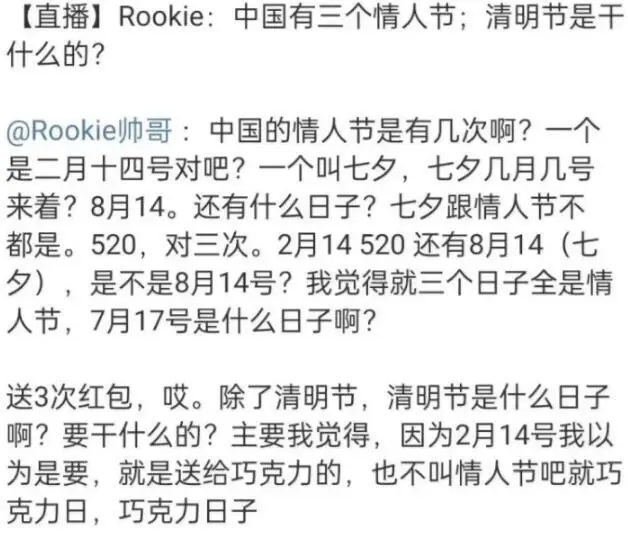 迩来电竞圈的消息许多,固然现在没有角逐,但是关于电竞圈的话题照旧非常多的,好比迩来我们看到许多所谓的圈内人出来爆料,大多数是说转会期的内容,许多内容真真假假,真的不好判定。 为了博眼球故意开释假消息,这种活动确实很可恶,除了这些人突然出现之外,我们看到迩来许多职业选手也出如今直播间了,他们都来补时长了,着实这是很常见的情况,每次转会期都有大量选手出来直播。 由于他们在签署选手条约的时间,他们是有规定必要直播的,一样平常一个月是40小时的直播时长,平常要角逐以是没办法直播,于是他们就会囤到转会期的时间一起直播,天天直播个几小时,很快就可以补齐了。 于是各人看到迩来许多选手在直播,由于他们是公众人物,以是说的一些话很容易就引起热议,好比迩来我们看到Rookie就在直播,他的直播真的很风趣,不像有一些选手,直播的时间很高冷,全程玩游戏,话都没说几句。 Rookie可不会,他在直播的时间是很喜欢跟粉丝们谈天的,迩来他在直播的时间,就吐槽中国节日太多,表现光恋人节一年就3次,要送3次红包,自己有点无法明白,说到这个,确实是我们的标题标,感觉什么节日都要给女朋侪送礼物。 其时rookie的原话是:中国的恋人节是有频频啊?是二月十四号对吧?一个叫 ,七夕几月几号来着?8月14。另有什么日子?七夕跟恋人节不都是520,对三次。2月14520另有8月14(七夕)是不是8月14号?我以为就三个日子满是恋人节,7月17号是什么日子啊?送3次红包,哎,除了清朗节,清朗节是什么日子啊?要干什么的?重要我以为,由于2月14号我以为是要,就是送给巧克力的,也不叫恋人节吧就巧克力日,巧克力日子。 可以看到这些日子都要把rookie逼疯了,这么多节日都要送礼物,自己又不太相识这些日子,偶尔间如果忘记了,估计小钰是要发飙的,以是他在直播间内里吐槽,而且也问问各人,清朗节要不要送礼物,对此你们有什么想吐槽吗? |