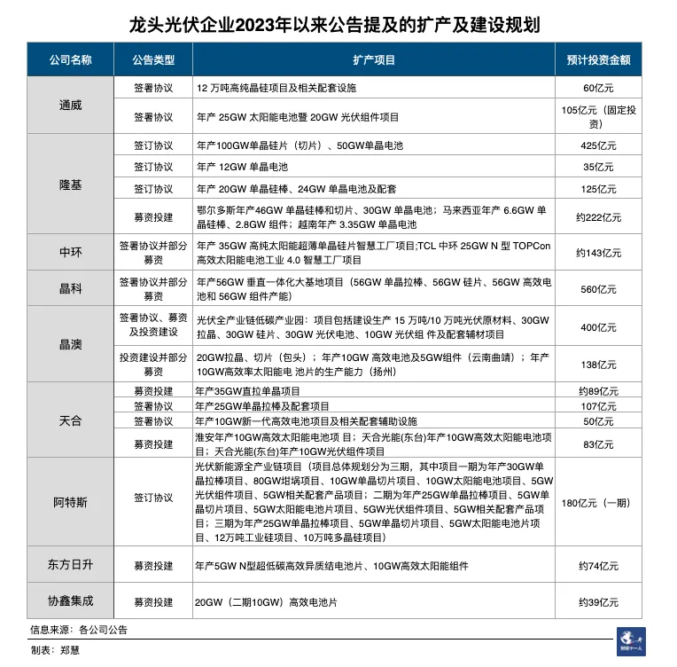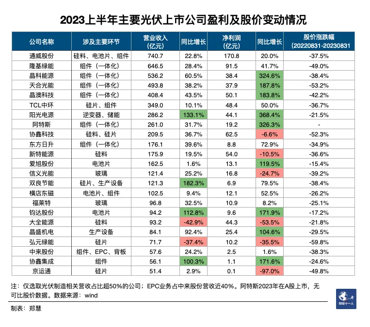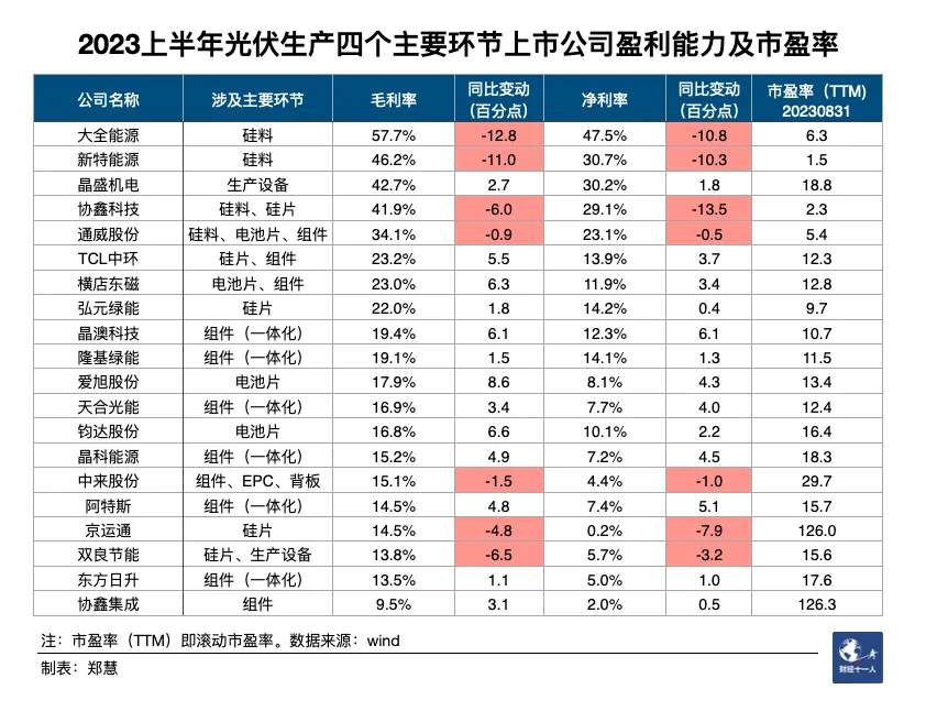 光伏龙头企业一边警示产能过剩风险,一边猛烈扩产,仿佛过剩与己无关 文|郑慧 编辑| 马克 2023上半年,光伏行业仍旧火热,供需两头高速增长,唯有股价一起下跌。 国家能源局数据表现,上半年天下累计新增光伏装机到达78.4GW,同比增长154%,靠近 2022年整年装机程度。年初,各大机构推测本年环球光伏装机约为350GW,陪同着产业链代价降落,该预期不绝上调,如今推测有望突破400GW。 据中国光伏行业协会(CPIA)统计,光伏制造四个重要环节,即多晶硅、硅片、晶硅电池、晶硅组件,上半年产量分别超60万吨、250GW、220GW、200GW,同比增长幅度均凌驾60%。 上半年,光伏产业链中有23家上市公司营收凌驾50亿元。此中16家公司营收同比增长凌驾20%,9家公司实现净利润同比翻番。 光伏企业赚到了钱,但二级市场的股价却一起下跌。以半年报发布制止日(8月31日)为观察时点,可以看到,大部分上市光伏企业的股价相较客岁同期大幅下跌(见上图)。 以晶科能源、天合光能、晶澳科技为例,三家公司的净利润同比增长分别高达324.6%、187.8%、183.8%,但股价较一年前跌去了38.4%、53.2%、42.2%。而同时期,沪深300指数的跌幅仅为7.62%。 二级市场的投资者们不再信托“光”了吗?当前,行业短期产能过剩、出口形势复杂等因素带来的担心,克服了看好光伏行业长期需求的信心。 龙头企业则一边警示产能过剩风险,一边纷纷抛出融资、扩产规划,试图在技能迭代的趋势中巩固自身职位,以接待下一轮产业周期。 全产业链猛烈扩张两年多后,中国光伏走到了新的节点。谁有充足丰富的家底应对寻衅? 全行业大贬价,电站最受益 综合各机构推测数据,2023年底,环球硅料、硅片、电池片、组件四个环节的产能将凌驾800GW。如果全部扩产公告根本按期实现,硅料、电池片环节产能将凌驾1100GW,硅片、组件环节产能将到达900GW。这将远超2023年、2024年480GW~550GW的组件需求。 而根据CPIA数据,中国近两年在全部环节的产能占比均凌驾80%。 产业链各环节,尤其是硅料环节的产能跃进,带来了供需关系的变革,2023上半年,硅料代价猛跌,鄙俚环节也随之贬价。 硅业分会6月末的数据表现,硅料环节,国内单晶致密料成交均价为6.57万元/吨,较客岁30万元/吨以上的高位跌去八成;硅片环节,M10 单晶硅片(182mm/150μm)成交均价为 2.80 元/片,G12 单晶硅片 (210mm/150μm)成交均价为 3.75 元/片,较客岁高点跌去六七成。 光伏咨询机构PVInfoLink数据表现,6月尾,P型182mm/23.1%电池成交均价0.7元/w,210mm/23.1%电池成交均价0.73元/w,较客岁高点跌去四五成;组件环节,182mmP型组件成交均价1.40元/w,210mmP型组件成交均价1.41元/w,较客岁高点跌去三成。 受代价下跌的影响,不少企业计提的资产减值丧失较客岁同期大幅增长。 此中,隆基绿能上半年计提了19.9亿元资产减值丧失,靠近2022年整年程度,此中17.5亿元为存货跌价丧失。别的,通威股份、晶科能源、TCL中环、天合光能等头部公司的减值预备也大大增长。 通威股份、协鑫科技、大万能源、新特能源,以及未上市的东方渴望,是硅料环节五大巨头。上半年,几家上市公司仍旧保持着较高的毛利率,但相较客岁同期显着下滑(见下图,标红为毛利率净利率低沉的公司)。 此中,通威股份同时也是电池片环节的龙头,并于客岁开始加码组件业务。结构鄙俚产业链,使得通威的毛利率比其他硅料企业更低,但也分散了单个环节利润颠簸的风险,毛利率低沉的幅度更小。 中国有色金属工业协会硅业专家组副主任吕锦标曾对《财经十一人》表现,硅料环节前期投资大、生产机动性有限,最受不了过剩。不外,本年的贬价更多是基于供给增长后供需关系的扭转,以及对未来过剩的预期,而非真正的过剩。 吕锦标指出,本年硅料并未显着过剩,一些新进入的企业提产速率不及预期,预计总产量约150万吨(折合约600GW),真正的过剩将发生在来岁,尤其是一季度。 据硅业分会统计,2023年底,硅料产能将到达285.2万吨。新增产能中,约75万吨将在四序度投产,由于这部分产能须要时间爬坡,假设2024年不再扩产,2024整年硅料产量将到达230~250万吨(折合约920GW-1000GW)。2023年12月单月硅料产量或将到达20万吨,思量到年底各环节企业都须要清库存,如果来岁一季度再遇上需求淡季,届时供求抵牾将非常突出。 投资者对于硅料环节的“过剩”预期已经反应在了股价上。从当前市盈率(8月31日)来看,四家公司硅料环节上市公司的市盈率在2.3倍~6.3倍不等,显着低于其他环节10倍以上的估值。 硅片环节则在渐渐分化。TCL中环、隆基绿能、弘元绿能、双良节能、京运通是硅片环节的重要上市公司。2023上半年,中环、隆基、弘元绿能的毛利率均有所进步,而双良、京运通的毛利率则显着降落。别的,弘元绿能的营收、净利规模较客岁同期显着下滑。 总体而言,硅片环节的两大巨头中环和隆基上半年保持了不错的业绩。不外,上半年硅片相干营收仅占隆基团体营收的22.5%左右,而隆基并未详细披露分环节毛利率。中环的硅片业务约占团体营收77%左右,毛利率24.88%,较客岁同期提升6.44个百分点。 上游硅料代价回归,有利于鄙俚利润的修复。上半年,电池、组件环节及一体化企业,毛利率也有所提升。 不外,吕锦标指出,如今光伏鄙俚非一体化的硅片产能过剩严厉,硅料开释的利润,未来很难在硅片端停顿,电池往N型提效过程中享受肯定的利润,但终极重要流向终端电站,利好需求端。 通