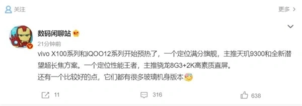 快科技9月9日消息,vivo副总裁贾净东预报,iQOO 12发布会越来越近了,定位是“性能王者”,给iQOO用户带来更多惊喜和创新。 博主数码闲聊站透露,iQOO 12首批搭载高通骁龙8 Gen3移动平台,同时接纳2K高素质直屏。 此中高通骁龙8 Gen3基于台积电N4P工艺制程打造,CPU部门由1*3.19GHz X4+5*2.96GHz A720+2*2.27GHz A520构成,GPU是Adreno 750。 对比高通骁龙8 Gen2,骁龙8 Gen3多了一颗性能核心,少了一颗能效核心,而且超大核升级为Cortex X4。 据悉,Cortex X4是Arm迄今为止最强横的性能核心,与Cortex-X3相比,Cortex-X4 ALU数目从6个增长到8个,性能进步了15%,同时新的节能微架构使得雷同频率下节省了40%的功耗。 别的,iQOO 12快充至少是百瓦起步,值得等候。 |