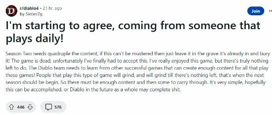 《暗黑粉碎神 4》第二赛季将会是暴雪这款新作的最紧张时候,在履历了强劲的开局后,游戏的玩家数量和直播收视率已经逐步降落,社区玩家们以为《暗黑粉碎神4》第二赛季必要提供大量的内容来制止游戏“殒命”。 我们知道,开辟职员正在幕后疯狂地工作,以开辟游戏的年度扩展,这简直是一件功德,但玩家们更关注的显然是即将推出的内容。 Reddit用户SieberZg发文怒喷游戏:“第二季必要四倍的内容,如果这都做不到,那就把它留在坟墓里埋了吧!很遗憾,这款游戏已经死了,我终极不得不担当这个毕竟。我非常喜欢这款游戏,但它确实已经无事可做了。《暗黑粉碎神》团队必要向其他乐成的游戏学习,为全部玩这款游戏的玩家创造充足的内容。” 赛季与扩展的争论再次成为焦点,一些玩家以为赛季并不是扩展,只是在现有游戏的底子上增长了一些新的主题玩法。然而,一些玩家以为赛季性内容不敷以满足他们对 D4 新玩法的渴望,但玩家们也对必须为扩展付费感到不满。 “你不付费就得不到任何有影响力的内容,他们已经说得很清楚了”一名玩家表现,“你会让自己扫兴,任何赛季内容都不会让底子游戏内容翻倍。” |