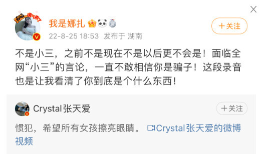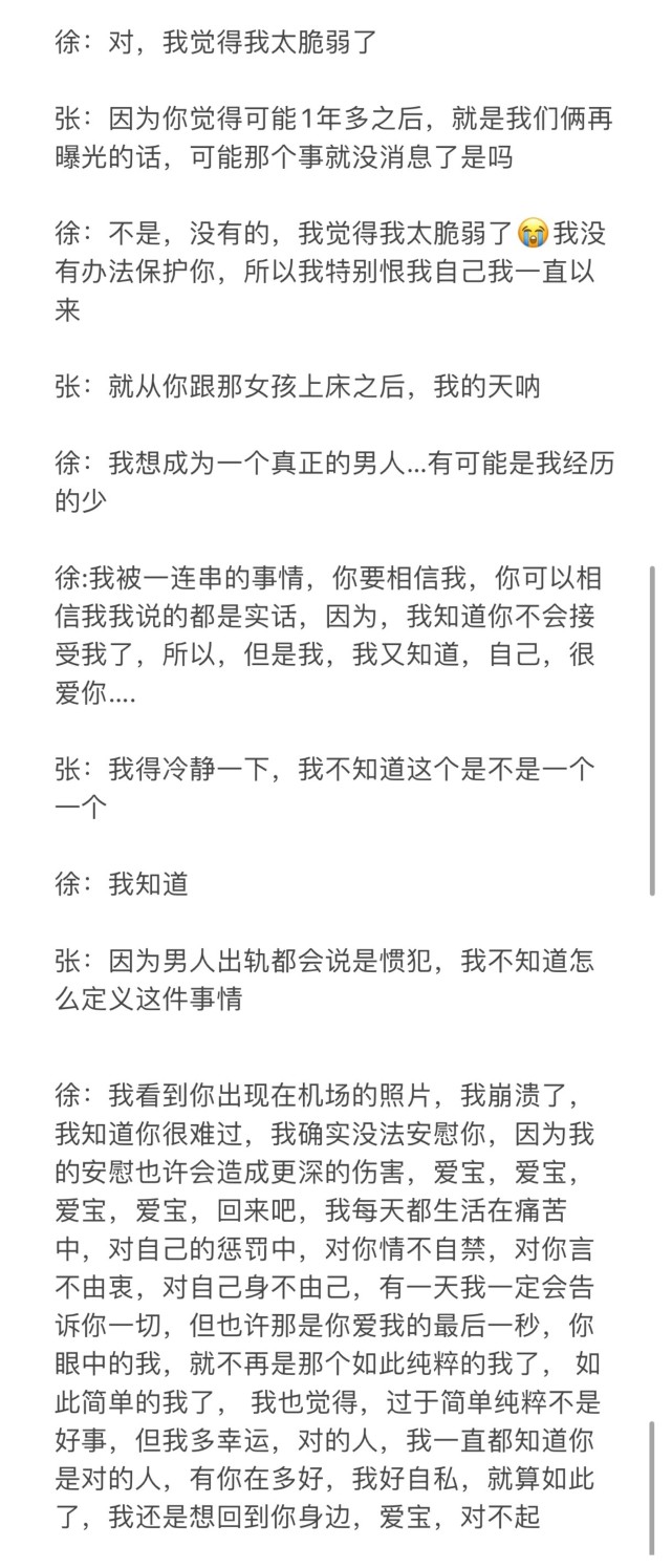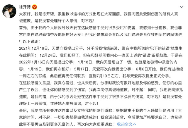 视频:张天爱晒徐开骋坦白灌音,全程7分33秒:张天爱泣不成声,徐开骋苦苦哀求似念台词,时长约7分32秒 8月25日晚,张天爱在个人交际账号晒出与徐开骋通话灌音往返应俩人感情一事,张天爱怒斥发文:“惯犯,渴望全部女孩擦亮眼睛”。 灌音中徐开骋说:“我好惆怅,我去了一个朋侪家,到了那我不绝喝不绝喝,我喝多了。”徐开骋直言本身不再是张天爱心中谁人纯粹的本身了,自称“酒后乱性”,跟一个男生朋侪叫的一个女孩发生了关系,由于喝太多都不知道本身怎么走的,承认都是本身的题目,这个错误不绝折磨着本身。 张天爱表现根本不是什么爱情合约,不能曝光恋情。徐开骋透露本身每天都在写日志,就算张天爱不包容本身,本身也会把他们要做的事都做完。徐开骋畏惧曝光恋情,直言担当不了如许的本身,作为爱人不能包容本身,离开不了张天爱。 徐开骋不绝不公开爱情并非公司要求,会影响其发展,而是本身太脆弱,没有办法掩护张天爱,不绝以来很恨本身,想成为一个夫君。徐开骋渴望张天爱不绝信任本身,本身也很爱张天爱。 张天爱哭着表现本身想要岑寂一下,表态夫君出轨都是惯犯,不知道徐开骋是怎么界说这件事的。徐开骋称本身看到张天爱机场的照片就瓦解了,知道对方很惆怅,本身没法安慰张天爱,由于本身的安慰大概会造成更深的伤害。 徐开骋恳求张天爱返来,本身每天都活在痛楚中,对本身的处罚中,表现本身有一天会告诉张天爱统统,但到时间本身就不是谁人纯粹的本身了。徐开骋向张天爱致歉,表现对不起。 徐开骋的渣男语录也被网友吐槽为:《我太脆弱了》《我想成为一个真正的夫君》《我不再是你眼中纯粹的我》《我好自私》《对你不由自主,对你心口不一,对本身身不由己》《爱宝,爱宝,爱宝》,请欣赏笔墨版: 25日稍晚些时间,徐开骋发文回应,称没掩护好张天爱,同时也让娜扎受到不须要的伤害。 徐开骋致歉全文: 各人好,我是徐开骋,很歉仄以如许的方式出如今各人面前。我要向因此受到伤害的全部人朴拙致歉,是我没有处理处罚好个人感情,对不起! 起首,由于我的个人缘故原由导致天爱在这段感情中受到许多委曲和伤害,我感到非常歉仄,我也非常自责在这段感情中没能掩护晴天爱!但我还是想就灌音以及我们这段关系存续期间的时间线举行以下分析: 2021年12月16日,天爱向我提出分手,分手后我感情瓦解,灌音中我所说的“犯下的错误”就发生在此期间; 12月24日,我们和洽了,但在和洽期间我心田不绝因上述的“错误”备受煎熬,于是在2022年1月16日向天爱提出分手; 1月18日,我向天爱坦白了统统,也就是她微博中灌音的内容; 1月19日,我们再次和洽; 5月17日,天爱再次向我提出分手; 6月6日开始,我们有过一连一周左右的联结,以后便再无任何接洽; 直到7月10日左右,我与天爱再次提出正式分手。 在这段感情关系里,我至心爱过,也从未悔恨。分手时我没有很好地顾及你的感受,使你的内心产生了误会,也让你的情绪受到了伤害,我再次向你朴拙地致歉,对不起! 同时,我也要向娜扎致歉,是我的错,由于我的缘故原由让她在这件事中受到了许多不须要的伤害,对不起!是我没有处理处罚好上一段感情,致使她无辜被造谣,对不起! 末了,我要向全部关注这件事以及支持我的朋侪们致歉!很歉仄由于我的个人感情题目占用了各人的时间,对不起!统统伤害都是由我造成的!我会深刻反省,以后更加严酷要求本身,也渴望此事不要再波及到更多无辜的人。再次向各人谨慎致歉! 8月24日,有八卦媒体晒出多次拍到徐开骋深夜前往古力娜扎地点小区画面,而且,在本年七夕徐开骋还带着礼品去往娜扎家中。紧接着,又有爆料称徐开骋和张天爱在6月中旬就已经分手,然后无缝对接古力娜扎。而古力娜扎和徐开骋在本年4月份互助拍摄《恋恋凡间》这部剧,而且在7月份迎来达成。 值得一提的是,就在当天张天爱经纪人的一则朋侪圈截图也被曝光,经纪人分享了一篇“渣男十个共同特性”,算是锤了徐开骋和古力娜扎爱情毕竟。 张天爱的视频发布后,与徐开骋传出恋情的古力娜扎也发文举行了回应,转发张天爱动态并写道:“不是小三,之前不是如今不是以后更不会是!面临全网“小三”的言论,不绝不敢信任你是骗子!这段灌音也是让我看清了你到底是个什么东西!” 而说到徐开骋和张天爱,两个人在2019年9月被拍到密切画面,恋情疑似曝光,虽说他们不绝没有公开,不外在本年对于到场录制浪姐的张天爱,徐开骋有公开给她打call,对此不少网友以为是官宣恋情,没想到这么快就被曝劈叉。 如今张天爱已正式开锤徐开骋,不知道稍后男方会不会做出回应呢? 【免责声明:文中图片泉源网络,如有版权请接洽删除】 |