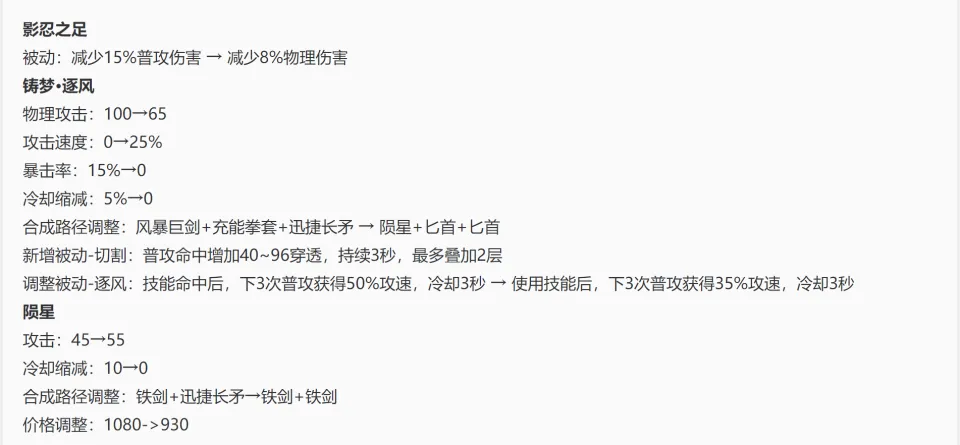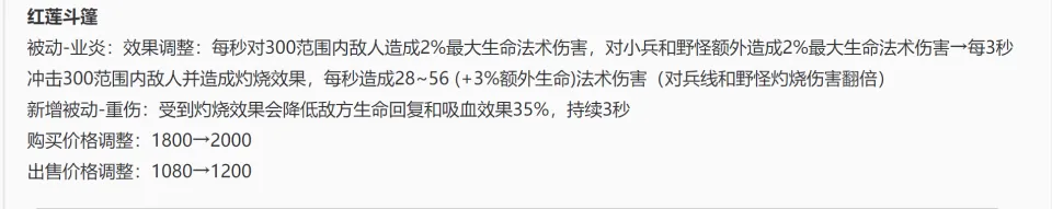 陌陌聊游戏,给您带来最新最快的王者资讯! S33新赛季已经在体验服正式更新了。按照以往的惯例,体验的这个版本应该就是S33新赛季正式服的终极版本了!因此,各人可以体验相识一下,新赛脊室饽些版本“神器”。如许的话,在新赛季上分的时间,就能吃掉版本的红利,上分就容易了! 火甲 火甲,在S33新赛季,得到了史诗级的加强! 被动-业炎:效果调解:每秒对300范围内仇人造成2%最大生命法术伤害,对小兵和野怪额外造成2%最大生命法术伤害→每3秒打击300范围内仇人并造成灼烧效果,每秒造成28~56 (+3%额外生命)法术伤害(对兵线和野怪灼烧伤害翻倍); 新增被动-重伤:受到灼烧效果会低沉敌方生命复兴和吸血效果35%,连续3秒!固然了代价增长了,提升到了2000金币! 火甲加强之后,可以说一下子就成为了版本的神器之一。对于夏侯惇,铠,这些坦克打野豪杰来说,黑白常利好的!重做上架之后的典韦,也会由于这件装备非常强势! 不但仅是打野的坦克豪杰,边路得当出火甲的豪杰,也吃到了这件装备的版本红利! 除了火甲之外,另有一件装备由于重做成为版本的“神器”,这件装备就是逐风!新版的逐风属性是:物理攻击:100→65 攻击速率:0→25% 暴击率:15%→0 冷却缩减:5%→0 合成路径调解:风暴巨剑+充能拳套+迅捷长矛 → 陨星+匕首+匕首 新增被动-切割:普攻掷中增长40~96穿透,连续3秒,最多叠加2层 调解被动-逐风:技能掷中后,下3次普攻得到50%攻速,冷却3秒 → 使用技能后,下3次普攻得到35%攻速,冷却3秒! 调解之后的逐风,得当非常多的豪杰,特殊是那些对暗影战斧非常依赖的豪杰!可以用逐风来更换了! 除了上述的两件装备之外,制裁和梦魇也调解了!梦魇:根本属性:5%冷却缩减 → 10%冷却缩减;重伤被动调解:低沉生命复兴和吸血50%,连续3秒→低沉生命规复和吸血35%,连续3秒! 制裁:根本属性:500生命→15%攻速;重伤效果调解:低沉生命复兴和吸血50%,连续3秒 → 低沉生命规复和吸血35%,连续3秒! 辅助装备也举行了优化升级,升级之后的辅助装备,合成的途径就非常简单了,玩家不须要再浪费时间在看辅助装备的合成上了! S33新赛季,由于火甲和逐风的重做,许多降服豪杰都能吃到版本的红利!S33新赛季,会不会是兵士光彩的一个版本呢? |