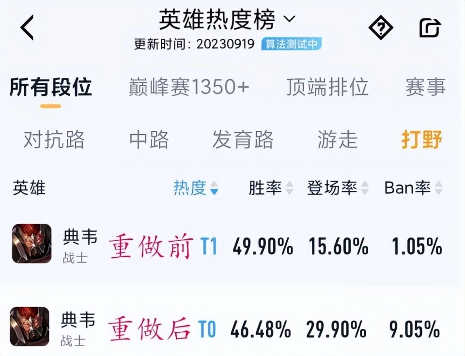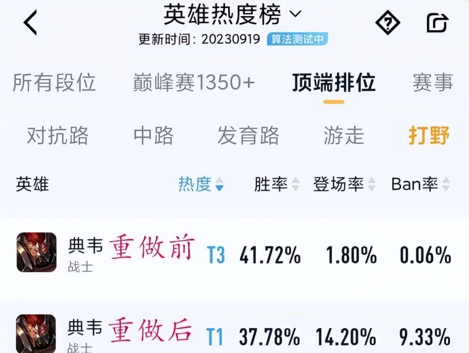 王者光彩自公测到现在已经七年多,现在也来到了S33赛季了。S33赛季更新后照旧让人比力不测的,显着体验服有两个新好汉,但新赛季更新之后,却没有新好汉上线,因此,S33赛季最让人期待的也就是典韦的重做了。 典韦作为老牌打野,在近来几个赛季的体现也是不尽人意,由于自身简单的技能机制,也让他很难有所发挥,而在S33赛季,典韦也终于迎来了重做。 起首是被动,重做之后,典韦的全部技能都能解控了,这也让典韦不再恐惧那些小控制了。同时,在解控之后,典韦还会得到额外的物理攻击,另有普攻射程,最多能提拔180点物理攻击和210码的普攻射程,如许纵然在逆风的情况下,典韦也不消担心伤害会过低,同时普攻射程的提拔,也让典韦不那么恐惧被风筝了。 接着是二技能,底子蓝耗低落15点,品级加成低落5点:65(+10/Lv) → 50(+5/Lv),蓝耗低落,也进步了典韦的续航了。 末了是三技能,先是优化了大招跳劈和受击的体现,同时也加强了打击感,另有寻敌间隔优化。别的,三技能的伤害,底子伤害和品级伤害加成都进步了,但本来的AD加成却变成了额外AD加成:300(+50/Lv)(+0.9Ad) → 320(+160/Lv)(+0.9额外Ad)。 从重做的情况来看,典韦照旧得到了不小的加强的,起首是全部技能都能解控,同时被动提拔的普攻间隔也让典韦不再那么恐惧被风筝,不外典韦在顺风的情况下,伤害也没有之前那么高的。看似加强,然后重做后的典韦仅仅一天,胜率就垫底了。 在全部段位中,典韦的胜率从原来的49.9%降到了46.48%,登场率从15.60%提拔到了29.90%,同时ban率也从原来的1.05%进步到了9.05%。 在顶端排位赛中,典韦的胜率从41.72%低落到了37.78%,登场率从1.80%提拔到了14.20%,而ban率更是从原来的0.06%提拔到了9.33%。 由于首日顶峰赛许多还没开启,以是顶峰赛的数据也没有发生厘革。看得出,典韦的登场率和ban率都得到了很大的提拔,但胜率却都低落了三四个百分点,特殊在顶端排位,胜率更是直接跌到了37.78%,这个胜率,都相称于新好汉上线了。那为什么重做后的典韦看似加强,胜率却连续下跌呢? 起首是铭文出装的改变,重做后,典韦前期的伤害会比力低,以是在铭文方面,我们可以10隐匿+10鹰眼+10祸源,如许典韦在前期是伤害就会得到很大的提拔了。 而在出装方面保举:肉打野刀+疾步之靴+红莲斗篷+反甲+魔女斗篷/永夜保卫,末了补纯净苍穹。 而在玩典韦的时间,固然他的三个技能都有解控结果,但我们最好照旧要留一下一技能,如许有利于后续的追击大概逃跑。重做后的典韦伤害紧张源于大招,以是在没有大招的情况下,我们照旧要只管少打架。固然了,由于没有主动位移技能,以是典韦看起来照旧比力粗笨,以是在面临机动的好汉时,也会比力难熬了。 以上就是小精灵对于重做后的典韦的先容了,话说,小搭档们,你们以为典韦重做后什么样呢?欢迎留言讨论! |