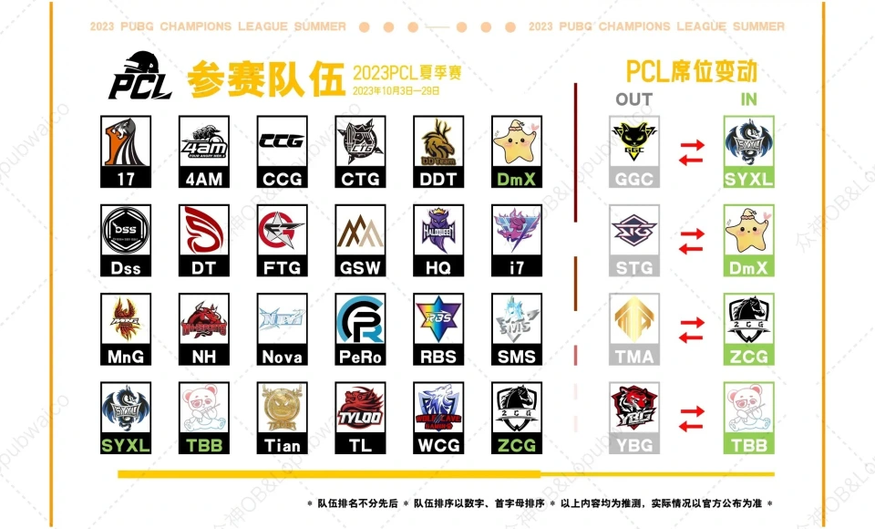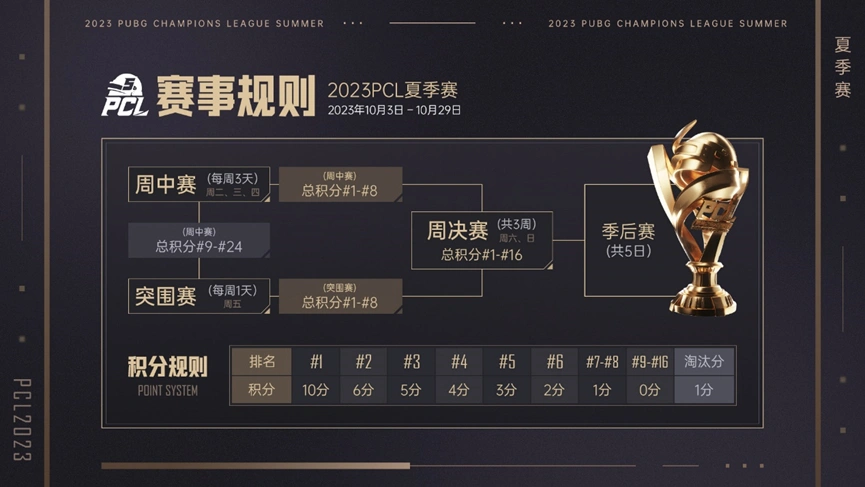 前言:等了这么久终于等来了官宣,PCL官方在微博公布了2023PCL夏日赛的详细赛制赛程,着实前段时间早就有外网博主爆料过了,小梦只是奇怪咱们赛区的消息每次还都得靠别人来爆料,真是能磨人啊。和以往一样,本次夏日赛的通例赛每周将以“周中赛+突围赛+周决赛”的情势举行,周二、周三、周四为周中赛,周五为突围赛,周末两日为周决赛,每个比赛日设有6局对决,舆图次序为米拉玛、米拉玛、泰戈、维寒迪、艾伦格、艾伦格。 通例赛(10月3日—10月22日) 24支PCL俱乐部将分在艾伦格、米拉玛和维寒迪三个赛区,每个赛区8支俱乐部。每周二、三、四举行单循环的周中赛,比赛采取积分赛制,周中赛效果排名前8的战队将晋级当周周决赛。剩余的16支战队到场每周周五的突围赛,当天积分排名前8的战队晋级当周周决赛,每周比赛竣事后,当周周中赛积分清零,不累计到下一周周中赛。 别的3次周决赛积分将举行累积,直至通例赛竣事,周决赛积分排名前16位俱乐部,将晋级季后赛,积分垫底的3支俱乐部将降级。注意这里和以往有些差别,官方没有分析周决赛积分将顺延至季后赛,只是说了周决赛累计积分前16的队伍晋级季后赛。 季后赛(10月25日—10月29日) 季后赛的规则就更简朴了,季后赛将于10月25日至10月29日举行,16支战队将举举动期5天,每天6场的比赛,同样采取积分赛制,比赛竣事后排名第一的战队将得到2023PCL夏日赛总冠军。 末了是季后赛的奖金分配环境,和春季赛千篇同等,总奖池300w,冠军可拿到整整100w,第二名60w,第三名30w,第四名20w,剩下队伍的排名奖金都不到10w,尚有单设的两个季后赛MVP和联赛战神个人称呼,每个可得到5w奖金。 现在PUBG的赛制已经越来越成熟,各人更关心比赛日程和参赛队伍,现在赛程已经确定,而关于参赛队伍,之前好像从众神OB那放出过一张图片,上面体现原来4支PCL队伍GGC,STG,TMA和YBG把他们的联赛名额卖了出去,由SYXL,DmX,ZCG和TBB取而代之。老队伍出于各种缘故原由临时拜别,一些观众在之前BOSS杯和天命杯的比赛就见地过这些新队伍的气力,只是杯赛和联赛的对局完满是两种节奏,不知道他们到了夏日赛能否打出本身的一片天。 |
