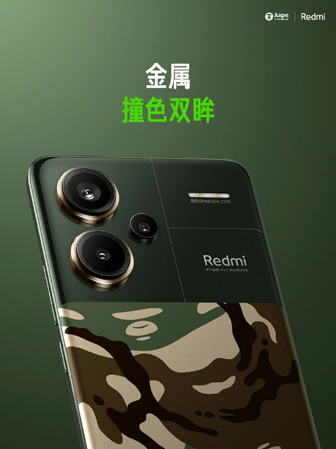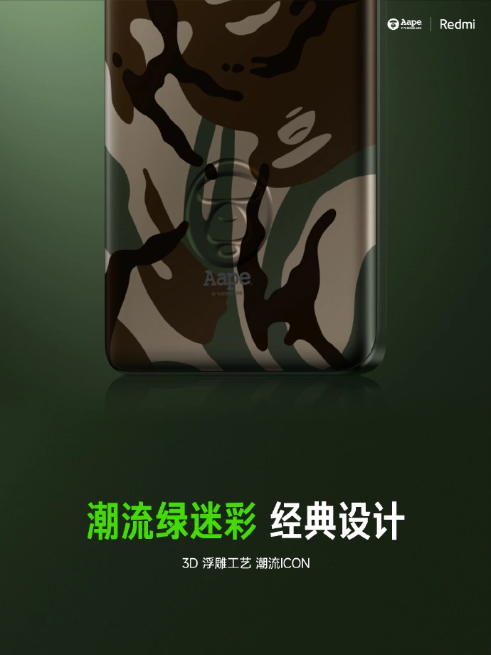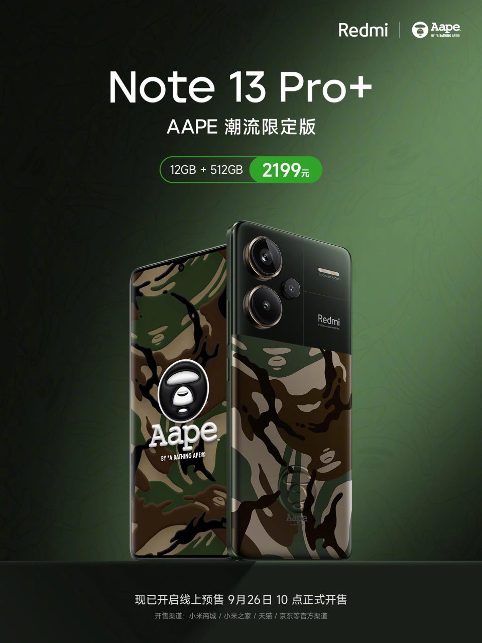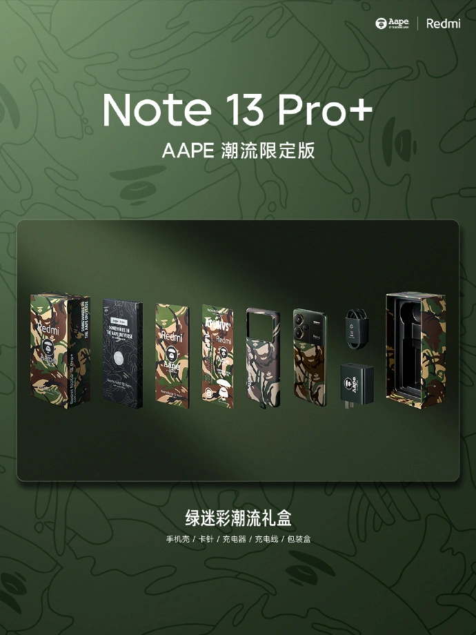 IT之家 9 月 21 日消息,今晚 Redmi 还推出了一款 Redmi Note 13 Pro + AAPE 潮水限定版手机,采取迷彩风计划,手机后盖采取立体的浮雕 logo,售价 2199 元(12+512GB)。 表面方面,Redmi Note 13 Pro + AAPE 潮水限定版采取潮水迷彩机身,3D 浮雕工艺 ICON,金属撞色计划 + 中框 / 按键 一体绿;深度定制四色品牌主题,定制迷彩相框,绿迷彩潮水礼盒,迷彩手机壳、卡针、 充电器等均深度定制。 Redmi Note13 Pro+ AAPE 潮水限定版别的设置跟寻常版雷同,现腋妞售,9 月 26 日 10 点首卖。 |