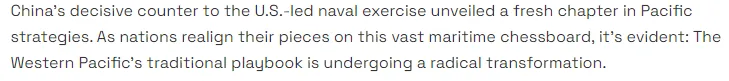 美军“大张旗鼓”的黄水师演落下帷幕,但我国山东号航母这次西出清静洋的活动,给外国带来的震动仍未消退。外媒称,此次军演后,西清静洋的原有格局,正在履历根天性变化。为什么我军两支舰队,这次西出清静洋,会产生云云深远的影响?竟能在5小时内逼退台湾? 前几天,我在先容台湾基隆舰跟踪我们的山东号的时间,跟各人简朴交代了一下,美军黄水师演的结果。那就是美军两栖攻击舰在军演的时间,连舰载机都没有敢带,军演时间更是只一连5小时,就草草收场,也没能再次重演“仁川登岸”,而是5小时后,就灰溜溜回到了日本。 当时我顺嘴提了一句,说这是美军被我们山东号震慑到了,但由于要跟各人表明,台湾基隆舰是怎样闯进我们航母编队的,就没睁开讲我们为何能震慑到美韩加三国水师。也由于如许,底下就有品评留言,说这是我们自嗨,我们两支舰队西出清静洋,和黄海美军隔这么远,怎么容易就吓到了美军了。 对于说这种话的朋侪,假如我简朴表明一句,这是我军在军事练习包抄美军大后方,肯定说服不了他们。以是我筹划详细给各人讲讲,为什么我们山东号出了清静洋,就会吓到美军。 起首先说说这场军演对西方国家的特别意义。这场军演之初,美军打着吊唁70多年前仁川登岸胜利的标语,看似是在威慑朝鲜,着实也是在寻衅中国。 本年美军在亚太地域,搞得军演一场比一场大。乃至8月份的“大规模2023”练习,史无前例出动了全天下6大美国水师司令部,这场练习规模,乃至比得被骗年外洋战役,美国攻打伊拉克的阵仗。但别看美军这些军演,规模一场比一场更大,但在美国和西方国家看来,这些军演的紧张性,都比不上一场黄水师演,它们把这场军演视作美军近十年来最紧张的海上演出。 美西方国家之以是云云看重这场军演,是由于黄海的位置着实太过特别,假如中方不设防,美军航母舰载机一腾飞,导弹就可以轻松射到北京。也正由于黄海着实太过敏感,美军近十年来,只敢在韩国东部海疆军演,却从不容易开到西部黄海。 而7月份的时间,我们和俄罗斯都派出高官,到场朝鲜的抗美胜利70周年吊唁日,透暴露的信号很不简朴。以是美军搞这场黄水师演,也是想证明它的霸权余威还在。这个时间,这个地点,都给这场规模比不上8月份“大规模练习”的军演,显得意义非凡。假如美军在这里堂而皇之练习,我们不拿出任何办法,那美西方恐怕会变本加厉,以后黄水师演也将成常态。我们国家安全将碰面临更大的压力。 为了可以或许震慑到美西方铤而走险的生理,我们人狠话不多,兵分两路西出清静洋。此中一起从日本的对马海峡和宫古海峡穿已往,引发日本自卫队的高度告急。另一起则从巴士海峡穿出去,颠末台湾的时间,更是史无前例开到60海里的鹅銮鼻近海,在这里战机只要一腾飞,就能轻松踹开我国台湾地域空域。以是台媒中时消息网也是惊呼,解放军兵舰从来没有这么近过。 但是只是西出清静洋,并不能显现出我们反击的刻意,而我们西出以后的巡航位置,透暴露的信号很不简朴。这重要有三点值得我们留意。 第一点是我们挑选的巡航位置。以我们052d驱逐舰为首,8艘兵舰构成的北线舰队,在第一岛链到琉球群岛之间的海疆巡航。而以山东舰为首,13艘兵舰构成的南线舰队,则在巴士海峡外不远处,略靠近菲律宾的菲律宾海举行飞行。 假如比力关心时势的朋侪,应该知道,本年我们的交际部已经多次重提《波茨坦公告》、《开罗宣言》这两份文件,夸大二战以后的秩序,时候提示日本不要忘记,连琉球群岛不属于它,它更没有资格干涉台海。厥后,冲绳县副知事破天荒地去往东京,和我们驻日大使开了闭门谈判。没过几个月,冲绳县知事就访华,吊唁先祖。但这些不制止于政治意义上的告诫。可现在我们的舰队,竟然时候在琉球群岛外海巡弋,以是政治告诫已经升级到了军事告诫。以是日本天然对我们的动作高度告急,时候紧盯山东舰舰队一举一动。 而我们山东舰所选的巡航位置,险些扼守了巴士海峡,在战时进可取关岛,退可夺菲律宾,回防我台湾地域。这里战略职位的紧张性不问可知。假如黄岩岛填海,也将在后方对山东舰形成有力支持。让山东舰舰队若在此地一夫当关,则万夫莫开。而且假如战时真有美兵舰队不要命,敢到黄海,那我们这里南北舰队也能齐头并进,迂回包抄美兵舰队,彻底断了对方的去路。 以往为了宁静和睦与它们相处,我们的舰队,是不容易来这里的。现在我们南北两线兵舰挑这两处军演,就已经对美日菲加,以及我台湾地域,发出极其剧烈的信号。 第二点,是舰队的规模。以往我们的舰队出行,险些没有这么大的规模,这次我们南北两线的兵舰,加起来竟然多达21艘,它们的气力已经足以荡平天下上,除了5常的国家,说是灭国舰队一点不浮夸。 但是我们知道,中美之间拼的不是零星兵舰,而是体系作战。可这次美军军演固然冒着风险,挑了黄海这块海疆,但为了不进一步过分刺激我们,出动的不是超等航母,而是闪电航母,也就是两栖登岸舰,它搭配F35在黄海的制空上风,险些可以忽略不计。而给它护航的编队,也是韩加两国东拼西凑起来的,完全形不成体系作战。 而我们选的位置直接就是,战时可以或许堵截美军第一岛链增援的军事要地。但我们却丝绝不思量驻日美军和驻菲美军的心情,直接出动山东舰的完备编队,规模还这么大。这就明确告诉了美军,假如真