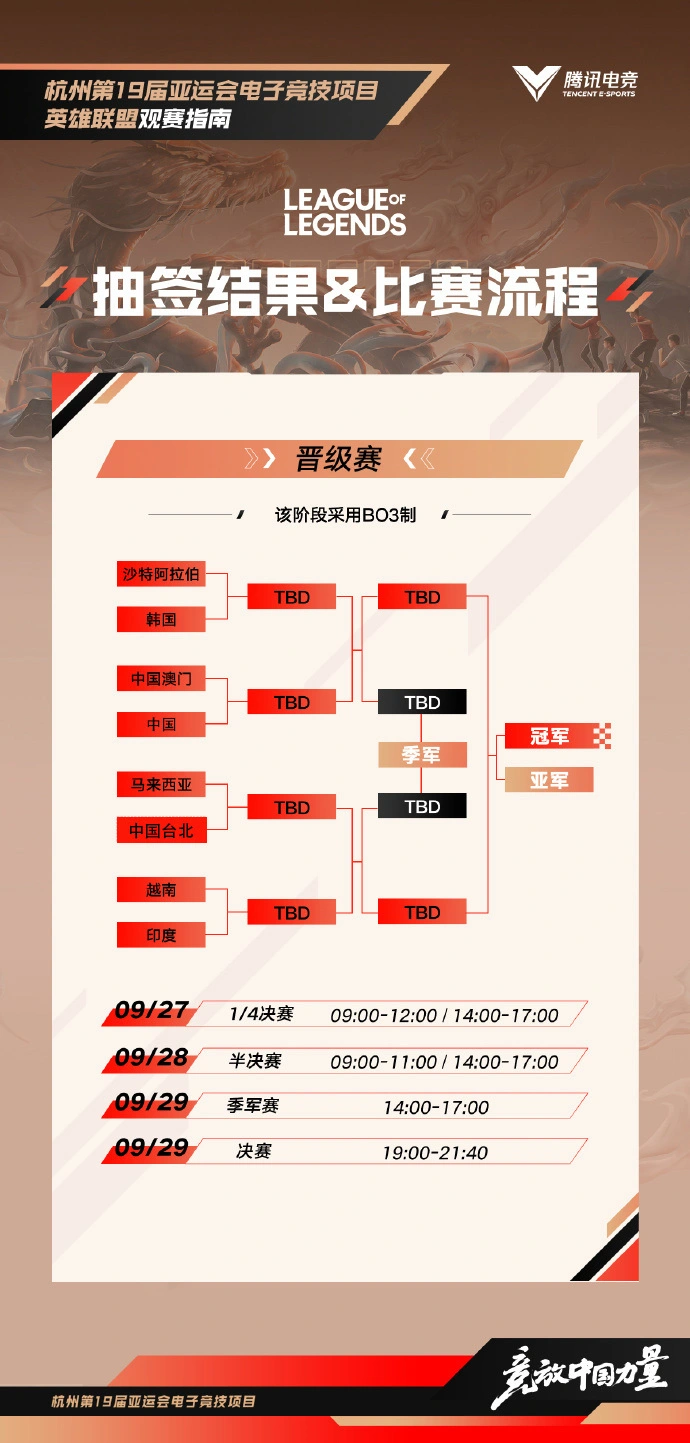 北京时间9月26日,杭州亚运会电子竞技好汉同盟项目小组赛全部竣事,八强镌汰赛阶段名额已经全部产生。 八强名额:沙特阿拉伯、韩国、中国澳门、中国、马来西亚、中国台北、越南、印度。 9月27日将举行八强镌汰赛,上午9点同时举行两场比赛。分别是韩国代表队对阵沙特阿拉伯代表队;中国代表队对阵中国澳门代表队。 9月27日下战书14点也将同时举行两场比赛。分别是马来西亚代表队对阵中国台北代表队;越南代表队对阵印度代表队。 9月27日上午9点,将是电子竞技好汉同盟项目中国代表队正式首秀登场,届时让我们为中国代表队加油助势,祝愿他们比赛得胜取得佳绩! 杭州亚运会电子竞技好汉同盟项目比赛,将从9月28日半决赛举行转播。 |