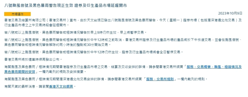 中新经纬10月9日电 港交所9日早间发布公告称,由于天文台现已发出八号台风信号及玄色暴雨告诫,本日(星期一)证券市场(包罗沪深港通北向生意业务)及衍生产物市场之上午生意业务时段会延伸开市。 港交所网站截图 港交所体现,若八号或以上台风信号、玄色暴雨告诫或非常情况告诫于早上9时仍旧收效,早上将停息生意业务。 若八号或以上台风信号、玄色暴雨告诫或非常情况告诫于中午12时或之前取消,香港生意业务所证券及衍生产物市场的产物将于下战书规复生意业务,并会在台风信号、玄色暴雨告诫或非常情况告诫排除约两小时后的整点或30分开始生意业务。 若八号或以上台风信号、玄色暴雨告诫或非常情况告诫于中午12时仍旧收效,证券及衍生产物市场将会整日停息生意业务。 据香港天文台9日破晓4时发布的玄色暴雨告诫,香港广泛地区已录得或预料会有每小时雨量高出70毫米的豪雨,且雨势大概一连。 别的,香港天文台9日6时45分更新的热带气旋告诫体现,八号东北烈风或狂风信号,现正收效。体现本港吹东北风,均匀风速每小时63公里或以上。台风小犬已削弱为剧烈热带风暴。在上午7时,小犬集结在香港之西南约110公里,即在北纬21.7度,东经113.3度附近,预料向西或西南偏西移动,时速约10公里,横过广东西部沿岸。(中新经纬APP) |