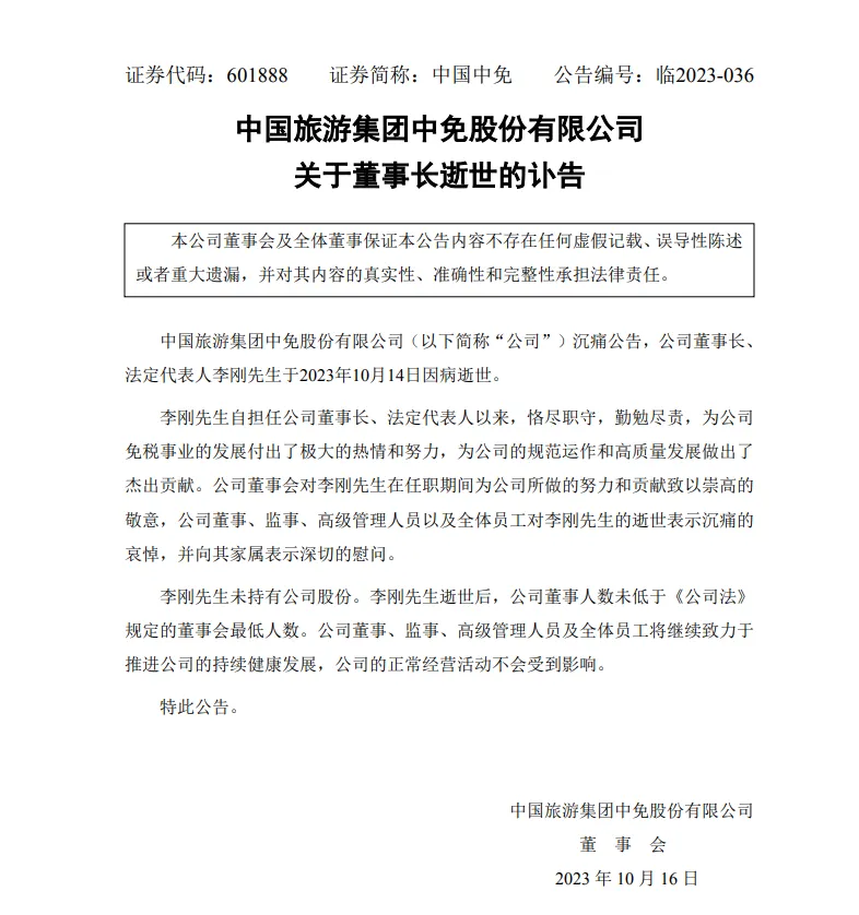 金融界10月15日消息 市值超2000亿元的“免税茅”中国中免发布公告称,公司董事长、法定代表人李刚于2023年10月14日因病逝世。 中国中免在公告中对李刚工作给予高度评价。中国中免,李刚自继承公司董事长、法定代表人以来,恪尽职守,勤勉尽责,为公司免税奇迹的发展付出了极大的热情和积极,为公司的规范运作和高质量发展做出了精良贡献。公司董事会对李刚在任职期间为公司所做的积极和贡献致以高贵的敬意,公司董事、监事、高级管理职员以及全体员工对李刚的逝世表现沉痛的哀悼,并向其眷属表现深切的慰问。 对于李刚逝世对公司的影响,中国中免表现,李刚逝世后,公司董事人数未低于《公司法》规定的董事会最低人数。公司董事、监事、高级管理职员及全体员工将继续致力于推进公司的一连康健发展,公司的正常筹谋运动不会受到影响。 别的李刚任职的中国旅游团体有限公司也讣告称::国旅游团体有限公司副总司理、党委委员李刚同道因病于2023年10月14日在深圳去世,享年56岁。 值得留意的是,李刚于本年才刚刚上任中国中免董事长一职,任职时间不到9个月。本年2月,中国中免公布董事长彭辉因退休缘故原由,李刚从中免控股股东中国旅游团体的副总司理一职上赴任中国中免,接任公司董事长、法定代表人。 据据中国中免2022年年报表现,李刚,现年54岁,任公司董事长,中国旅游团体副总司理。曾任国家旅游局人事劳动教诲司科员、副主任科员、直属构造党委团委书记;中免公司信息管理部副司理、发展管理部副总司理、总司理办公室主任、营运部总监、总司理、董事、党委副书记;中国国旅团体有限公司董事、党委书记;中国国旅(公司前称)副总司理、总司理、董事、董事长、党委副书记、党委书记等职务。 中国中免是举世最大的旅游零售运营商,重要从事以免税为主的旅游零售业务,包罗烟酒、香化、佳构、服饰、电子产物等免税商品的批发、零售等业务。 在彭辉继承中国中免董事恒久间,中国国旅更名“中国中免”,中国中免随着白马股的行情,股价一起暴涨,在2021年2月18日创下400.48/股的汗青高点,市值飙升至7000多亿元。 10月8日晚间披露的业绩快报表现,中国中免前三季度实现业务总收入508.37亿元,同比增长29.14%;实现净利润51.99亿元,同比增长12.33%。 停止10月13日收盘,中国中免A股股价报97.18元/股,总市值为2011亿元。 |