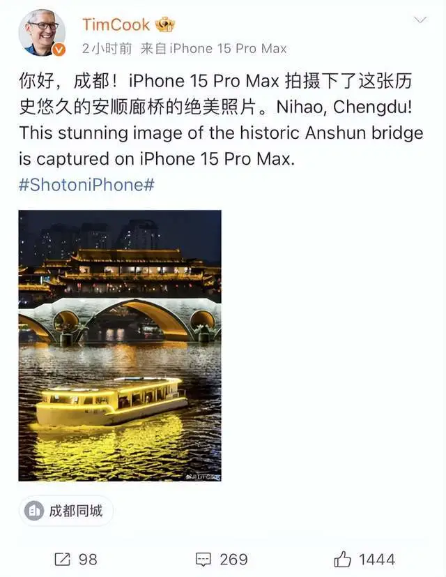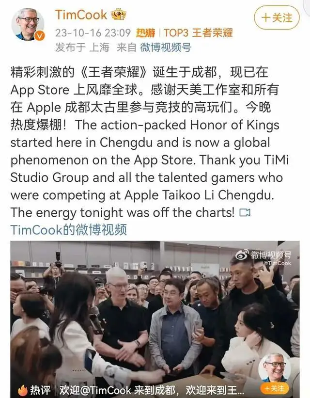 10月16日晚,苹果CEO库克现身成都太古里。红星资源局在现场留意到,库克在苹果旗舰店围观了一场王者光彩演出赛。 库克在微博中发布视频并提及,“精彩刺激的《王者光彩》诞生于成都,暇?孚App Store上风靡环球。” 在抵达太古里1小时前,库克还在微博发布了一张iPhone 15 Pro Max拍摄的安顺廊桥,并表现你好,成都! 苹果在本年 9月13日推出iPhone 15系列新机,并在9月22日正式开售。据财联社援引CINNO Research陈诉数据,由于消耗需求一连疲软,叠加智能手机功能越来越完满、遍及率越来越高,换机周期拉长,猜测iPhone 15系列在2023年销量结果或将在1000万部左右,对比上一代iPhone 14系列同期销量结果下滑22%,淘汰约290万部。 在库克的微博批评区下,有网友批评称,“在成都太古里看到他了”。 同时,有不少网友晒出了自己用华为、vivo等手机拍摄的照片。也有人晒出自己用iPhone 13 mini拍摄的照片。 红星消息记者 强亚铣 郭晶晶 综合北京商报、网友批评 |