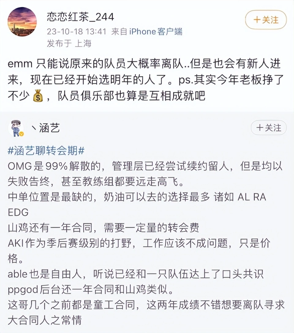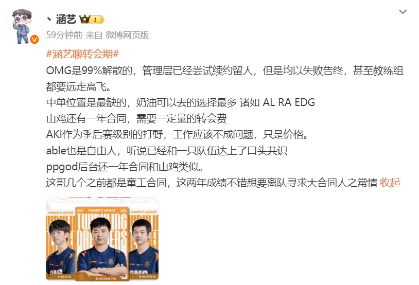S13天下赛瑞士轮的比赛即将开始,除了到场天下赛的4队之外,其他LPL战队已经在为来岁的春季赛做准备了,由于天下赛后就是转会期,以是许多战队开始筹办转会期的操纵。而作为LPL着名爆料人的涵艺,也在18号中午爆出猛料,直言OMG战队有99%的大概性要驱逐了。 涵艺爆料的内容如下,他上来就直言:OMG是99%会驱逐的,管理层想要和选手续约,但是全部失败,连锻练组都要走了。之后简朴论述了一下OMG各位选手的合约,体现:shanji和PPgod都另有一年的条约,脱离须要转会费,Aki是季后赛打野,只要代价没题目不愁找不到工作,Creme可以去的战队许多,Able听说已经和某支战队告竣了口头协议。末了涵艺也透露:OMG的几个队员之前都是童工条约,以是这次离队想要寻求大条约。 实在OMG要驱逐这个传言已经传了许多年了,紧张是OMG似乎也遇到了经济题目,以是这几年每次转会期都有OMG要驱逐的消息。而针对这次涵艺的爆料,作为Able铁粉的另一位爆料人恋恋凡间也回应:是原来的队员大概率都要走了,OMG应该会买新人。 以是简朴来看应该是这套阵容的OMG要散了,各人来岁应该都会为差别的战队效力,不再是队友了,而OMG这支战队还在,只是新阵容应该都是奇怪血液了。而这些队员们,体现最精彩的应该就是creme和shanji,creme年龄小,合约也到期了,估计在转会市场上会非常抢手,须要精良国产中单的战队太多了,Creme应该会通过这次转会期身价大涨,就看他末了的选择是那边了。 其次就是shanji,shanji年龄不小了,不外这几年在LPL确实体现不错,痛惜不绝没能打进国际舞台,这次转会假如不能去一支强队,感觉背面的机遇更小了。而且shanji和OMG另有条约在身,还要转会费,上单这个位置的紧张性说真话不如中单,以是shanji还是有肯定难度的,只能说盼望这次转会期中,可以听到shanji的好消息吧! 那么,对于这次转会期的爆料,你们有什么想说的吗?接待在批评区留言探究。 |