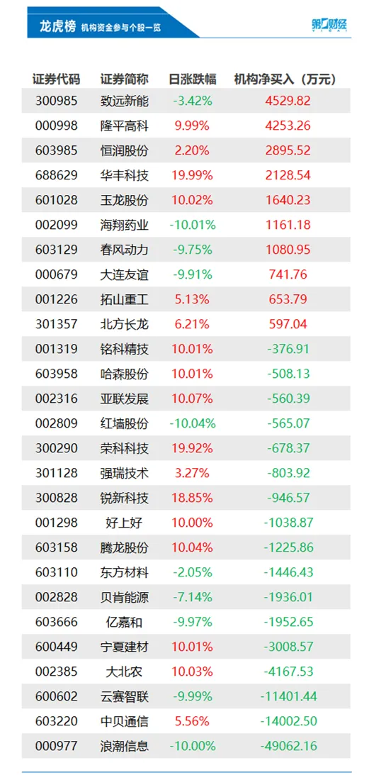 盘后数据表现,10月18日龙虎榜中,共27只个股出现了机构的身影,有10只股票出现机构净买入,17只股票出现机构净卖出。 当天机构净买入前三的股票分别是终级新能、隆平高科、恒润股份,净买入金额分别是4530万元、4253万元、2896万元。 当天机构净卖出前三的股票分别是海潮信息、中贝通讯、云赛智联,净流出金额分别是4.91亿元、1.40亿元、1.14亿元。 |