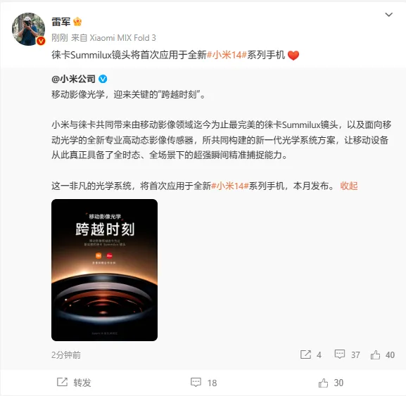 IT之家 10 月 19 日消息,刚刚 @小米公司 、@雷军 通过官方微博发文,预热将在不久之后正式登场的小米 14 系列手机。 据先容,小米 14 系列手机将初次搭载徕卡 Summilux 镜头,以及面向移动光学的全新专业高动态影像传感器所共同构建的“新一代光学体系方案”。 该镜头号称是“移动影像范畴迄今为止最完善的镜头”,这套方案能让移动装备今后“真正具备全时态、全场景下的超强瞬间精准捕获本领”。 IT之家注:昨日已有多方消息源声称小米 14 系列手机将搭载该系列镜头。徕卡利用一系列标识来区分镜头产物定位,比方徕卡自家着名的“50 2AA”镜头,即采取“Summicron”标识的“Apo-Summicron 50 F2 Asph”镜头,更夸大镜头的“锐度”,对应光圈为 F2。 在此之前,小米 12 / 13 系列及 Leitz Phone 1 / 2 等手机,便打上了干系“Summicron”标记,来证实干系手机镜头的“锐度”,而小米系列手机中,还具有一个“Vario”前缀,来证实镜头具有变焦功能。 |