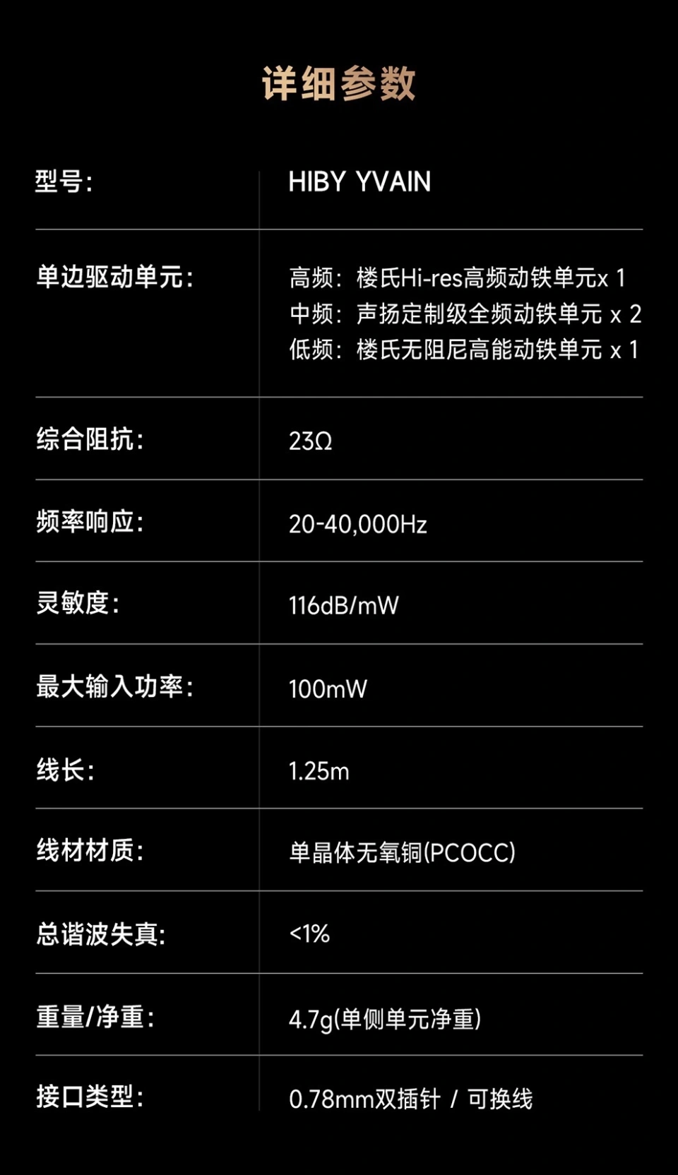 IT之家 10 月 29 日消息,海贝现上架了一款 YVAIN 四单元动铁入耳式耳机,将于 10 月 31 日 20 点开售,首发价 1688 元。 这是一款接纳定制级四单元声学架构,同时实用于音乐创作、演唱返听和安静凝听三大场景的全封闭入耳式监听耳机,具备单边四动铁扬声器、声扬定制级全频单元、楼氏 Hi-Res 高频单元、三通道独立声腔,支持高中低独立分频、楼氏无阻尼高能效低音。 它接纳了医疗级 3D 打印、CNC 精雕工艺、全封闭隔音计划,另有高纯度单晶铜、LITZ 全平衡线材、0.78 双针可换线、26dB 被动降噪。 IT之家附参数详情: |