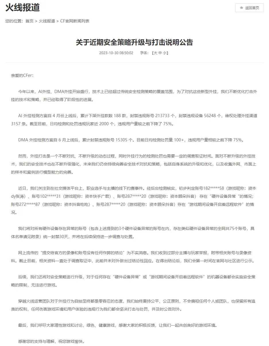 IT之家 10 月 30 日消息,在一次《穿越火线》职业选手与主播线上比赛中,有主播队伍疑似使用外挂等辅助本领赢得比赛,随后双方线下约赛被叫停。该变乱在交际媒体平台上引发争议,#穿越火线 外挂#、#广君 开挂# 登上微博热搜。 《穿越火线》官网发布《关于近期安全战略升级与打击阐明公告》,对相干变乱作出回应。 官方经配景检测核实,开端判断账号 182*****58(游戏昵称:资源 dy 张涛)、账号 102*****31(游戏昵称:资源快手广君)、账号 287*****20(游戏昵称:资源顾朵抖音) 存在“硬件装备非常”的情况;账号 272*****87(游戏昵称:资源抖音吃吃)、账号 287*****20(游戏昵称:资源顾朵抖音)存在“游戏期间装备开启着长途软件”的情况。 官方将对全部硬件装备存在非常的账号(IT之家注:包罗上述提到的 3 个硬件装备非常的账号在内,存在类似硬件装备非常的全网共 75 个账号)同一封禁 30 天,并将在后续保持进一步观察与处理。 别的,《穿越火线》还表现网上传播的“提交给官方的录像和账号没有任何作弊的结论”为不实消息。 “我们收到过部门主播与玩家举报,附带相干账号与录像资料。制止如今,相干资料不停处于观察取证中,此前并未对外作出过结论性回应。在得出结论后,我们会第一时间在官网与社区举行公示。” 《穿越火线》官方末了表现:“不会左袒任何个人或团队,也保存全部追责的权利,任何伤害游戏情况和用户体验的违规举动我们都会果断打击与处罚,并及时公告对外。” 后续,《穿越火线》官方还将对安全战略举行升级,对于任何存在“硬件装备非常”或“游戏期间装备开启着长途软件”的呆板装备都会实验安全战略的限定,无法举行游戏。 |