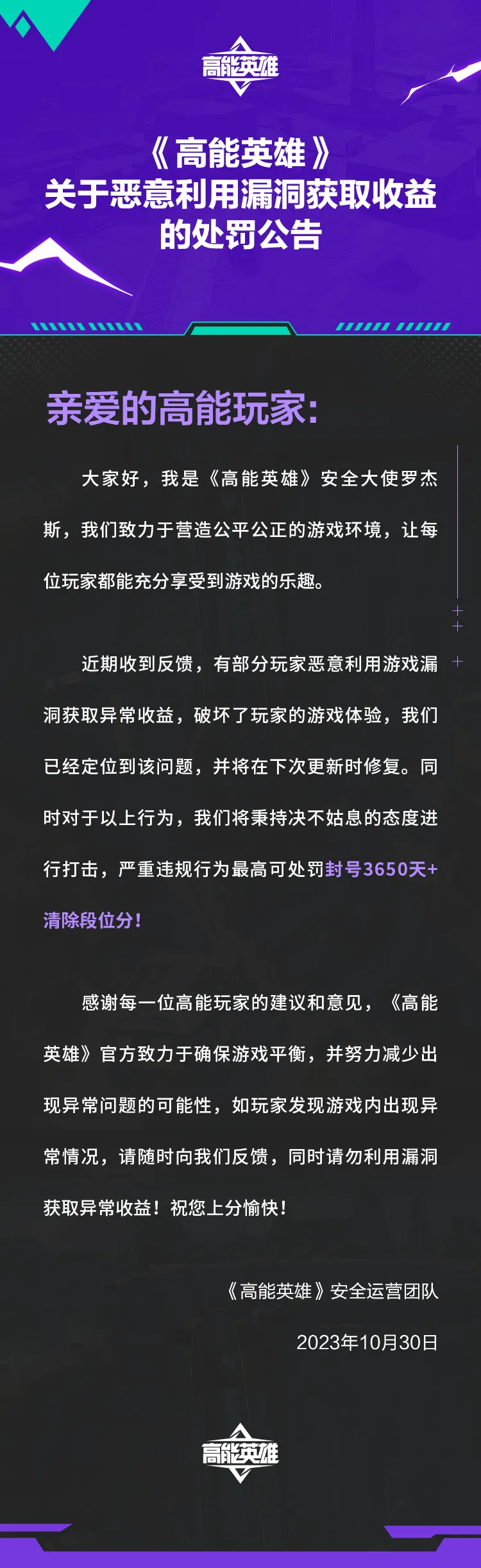 《高能好汉》关于恶意利用毛病获取收益的处罚公告