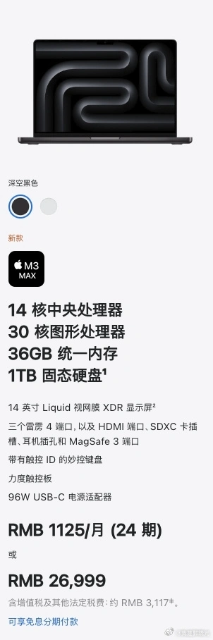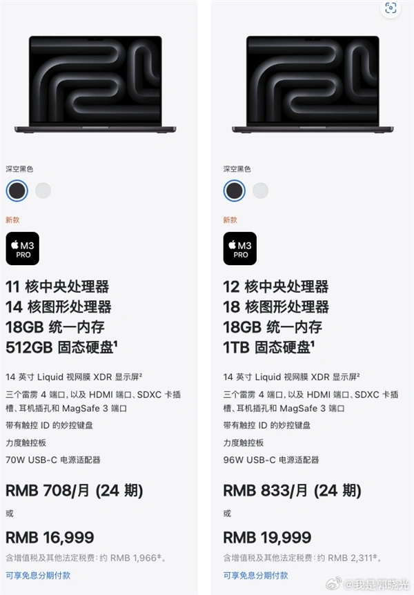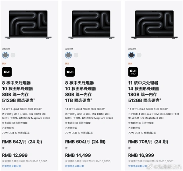 快科技10月31日消息,本日苹果举行了新品发布会,主角是Mac系列和3款3nm芯片。 先来说这次发布的新MacBook Pro,此中14英寸搭载M3系列芯片,而16英寸配备M3 Pro和M3 Max系列处理惩罚器,都是最高128GB内存。 团体外貌上和上一代没有太多差异,但苹果这次在14寸和16寸MacBook Pro机型中参加了新“深空黑”配色(玄色铝合金外貌)。 别的,全部 MacBook Pro 机型均配备Liquid视网膜XDR表现屏,可使SDR内容亮度提升 20%;内置1080p摄像头与六扬声器音响体系,并提供丰富的毗连选项。 如今国行的售价也都已经公布了,之前的9999元超等丐版没有了,12999元起步: 14寸MBP:8+512是12999元、8+1TB是14999元,而18+512(M3 Pro)为16999元;18+1TB(M3 Pro)是19999元 14寸MBP:36+1TB为26999元,搭载的处理惩罚器是M3 Max。 16寸MBP:18+512GB(M3 Pro)是19999元、36+512GB(M3 Pro)是22999元、36+1TB(M3 Max)是27999元、48+1TB(M3 Max)是31999元。 |