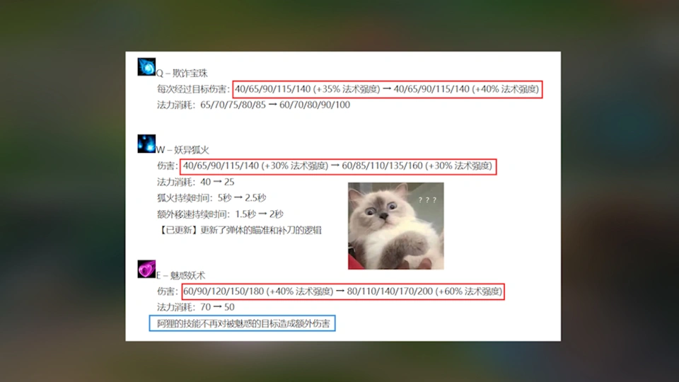 这绝对是全同盟最丢人的AP刺客,技能伤害堪比平A,被青钢影一脚踢出物理盾,乃至结合统都要讽刺她! 作为峡谷公认的刮痧女王,阿狸在玩家中的口碑,可谓是“相称好”,边玩游戏还能边看小品,其他好汉能有这体验?不外话说返来,我入坑那会(S3)阿狸可没有这酶婕爆而且还是角逐热门,计划师毕竟做了什么才让她酿成如今这副吊样呢?本日咱们就来细嗦一下阿狸。 阿狸是S2为了庆贺,棒子开服而登场的好汉,身为一个AP刺客,她有回血有清兵有控制有真伤,还带三段位移,机制在当时算是顶中顶了,不光云云,数值也好比今本心不少,尤其是W和大招,满级底子伤害加起来多了近300,这个时期的阿狸突出一个赖皮,冥火之拥一出,见人就大招开冲,即便亲嘴没亲到,摁灌伤害也能给你灌死,想反打又逮不着,别提多恶心了,我碰到这好汉,要么掏个皮厚的,好比乌鸦跟她互刷,要么就来个安妮直接自爆,大伙当时间都是用啥好汉康特的? 云云无脑的家伙,天然逃不外计划师的制裁,S3赛季末(3.13)阿狸迎来了初次重做,被动从法术吸血改成了固定回血,WR伤害大砍,E技能加了20%增伤,想秒人就必须得亲嘴,属于是巨幅削弱,直接从中路一姐给干进了下水道。 本以为已经够惨了,谁知道一年后,命根子冥火又给移除,阿狸成了终极倒霉蛋,计划师为了增补这部分强度空缺,再次对其举行了重做(5.2),而这也是阿狸从刺客向刮痧女王转型的开始,当时他们说了这么一句话,了不得的阿狸小姐,在刺客这一位置上很乐成,击杀辅助的本领很强,一开始我还以为是打趣,没想到是来真的,由于这次重做后,阿狸真的连辅助都秒不掉了。 起首Q技能多了一个加速,这个反向丢Q跑路的使用,大伙应该都念兹在兹吧?接着是WE伤害提升和E技能增伤移除,固然发作低了点,但也还能继续,接着无语的来了,这版阿狸靠着强盛的风筝本领,在中路又小火了一把,很快便迎来了告急削弱,计划师表现:全新的机动本领让阿狸变得有些太强了,于是我们决定砍她的伤害!?这一来一去,便是用冥火+E技能增伤换了个加速,划不划算我不知道,刺客之魂是肯定没了。 伤害太刮怎么办呢?水多了加面,面多了加水呗,8.8版本计划师再度回调了E技能增伤,作为代价,机动性大削、ER伤害小削,这回好了,一顿使用猛如虎,E空伤害二百五,刮痧女王实至名归,玩家们一琢磨,既然打不出伤害,那干脆当工具人得了,冰川增幅一带,冰枪双生暗影一出,直接开摆。 然而这还不是最离谱的,那会阿狸的W号称是同盟三大最废小技能之一,计划师为了堵住玩家的嘴,在10.18版本对W举行了重做,新增了移速和斩杀效果,而且CD蓝耗大幅下调,接着诞生了一个我八辈子都想不到的玩法——魔切淤泥流,靠平A和W打伤害,早先我也以为只是整活,效果越来越火,登场率一度凌驾了传统AP出装,逼得计划师连夜修改了魔切的触发机制,一个AP刺客竟然要靠,出AD装和肉装为生,可见已经烂到什么程度了。 于是才有了12.3的中型重做,E技能增伤移除,QWE伤害提…诶,等等!我怎么感觉这么熟悉呢?原来还在和面呢(和第二次重做类似),别看如今阿狸数据挺美丽,满是靠大招续杯前期打架猛,契合版本顶上去的,伤害依然刮得一批。 假如让我来使用阿狸,我倒有一个不错的想法,就是WR互换,W改成可充能位移(类似之前剑魔E),CD长点伤害低点,然后大招改成类似云顶里一段效果,对目的造成伤害和减魔抗,既办理了W拉胯的题目,又让阿狸变得更像刺客,公道! |