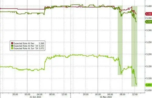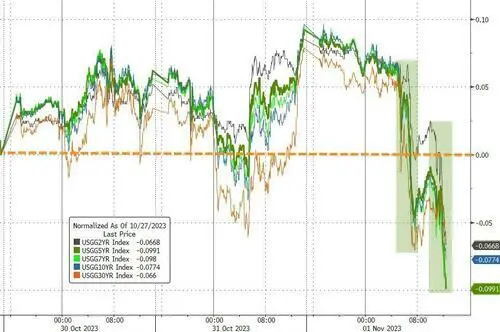 美联储准期暂不加息,决定声明新增形貌称,金融与信贷状态收紧影响到经济,这令期货生意业务员以为本年进一步加息的大概性降落至不敷20%,美国掉期互换市场还低沉了对美联储在2024年1月再度加息的预期,到2024年9月将降息50个基点的预期根本没变。 鲍威尔称,美联储的政策态度具有限定性,少数几个月的通胀数据良好,这仅仅是一个开始而已,名义薪资增速表明(就业市场)出现某些和缓迹象,根本与几周前的论调同等。由于市场信赖加息已经竣事,标普大盘、纳指和纳指100在记者会后涨幅扩大至超1%并再创日高。 美国财政部将下周的发债拍卖规模小幅上调90亿美元至1120亿美元,略低于预期,并放慢10年与30年期长债的增发速率,引发美国长债收益率从日高跳水超14个基点并抬升美股。 美国10月“小非农”ADP私营范畴就业新增11.3万人,不及预期的15万,但高于前值的近9万,薪资增速5.7%创两年新低。9月JOLTS职位空缺不测连涨两个月至955.3万人,高于预期的950万和8月前值下修后的949.7万,均表现劳动力市场仍然吃紧。 不外,美国10月ISM制造业指数超预期回落至46.7,创三个月新低且一连第12个月萎缩,就业、新订单和生产指数均降落,物价付出指数有所仰面。同月Markit制造业PMI终值创半年新高,但就业同样萎缩,均表现美国经济动能的丧失或高出预期。 美股尾盘涨幅扩大,纳指涨1.6%居前,AMD涨近10%领跑科技股,小鹏汽车涨7%11月1日周三,陪同美债收益率全线回落,美股在美联储货币决定公布前高开高走,午盘前触及日高后涨幅显着收窄。 道指最高涨近230点或涨0.7%,微软和英特尔领跑身分股,标普500最高涨0.8%,纳指、纳指100和芯片股指数均涨1%,罗素小盘股一度抹去0.7%的跌幅而转涨。 美联储决定公布后,美股变更不大,仍维持日内涨势,鲍威尔记者会后,美股相继革新日高,罗素小盘股也重新转涨。 制止收盘,道指、标普和小盘股均连涨三日,道指创10月19日以来的两周高位,上周五曾跌至七个月最低;标普自10月24日以来初次升破4200点,创一周新高,上周五曾创五个月最低;罗素小盘股继续脱离三年低位。纳指升破1.3万点也创一周新高,从五个月最低连涨四日: 标普500指数收涨44.06点,涨幅1.05%,报4237.86点。道指收涨221.71点,涨幅0.67%,报33274.58点。纳指收涨210.23点,涨幅1.64%,报13061.47点。纳指100涨1.8%,罗素2000小盘股指数涨0.5%,“恐慌指数”VIX跌7%并失守17关口。 明星科技股尾盘涨幅扩大。元宇宙”Meta涨3.5%,谷歌A涨近2%,均至一周新高;苹果涨近2%,从近六个月最低反弹四日至两周高位;亚马逊涨3%革新六周最高,奈飞涨2%至七周最高,微软涨超2%至三个月最高,特斯拉跌1.5%后转涨2.4%,从五个月新低连涨两日。 芯片股也尾盘显着走高。费城半导体指数涨2.3%,从五个月最低反弹两日。英特尔涨超2%至六周新高,AMD涨9.7%至三周高位,英伟达涨近4%进一步脱离四个半月低位,Arm转涨2.5%脱离近史上最低,高通涨1.7%,盘后再涨近4%,三季度营收超预期且下季度EPS利好。 AI概念股团体回调。C3.ai跌1.8%至一个月最低,Palantir Technologies转涨近1%暂离一个月低位,SoundHound.ai跌3%,BigBear.ai跌超5%,均革新九个月最低。 消息面上,AMD四序度营收预测不佳,但乐观预计来岁AI芯片贩卖额加快至20亿美元。报道称苹果操持来岁在智能手表推出新的付费康健引导服务,并添加血压传感器和就寝呼吸停息监测。 中概指数连跌两日但尾盘跌幅显着收窄。ETF KWEB跌超1%后收跌0.3%,CQQQ靠近抹去0.8%的跌幅,纳斯达克金龙中国指数(HXC)跌2.7%后收跌1.4%,失守6200点至一周半新低。 纳斯达克100成份股中,京东跌0.4%,百度靠近抹去1.6%的跌幅,拼多多涨1.5%。其他个股中,阿里巴巴也靠近抹去1.6%的跌幅,腾讯ADR跌超1%后收跌0.2%,B站跌近2%,蔚来涨2%,小鹏汽车涨7%,抱负汽车涨超3%。百胜中国跌21%后收跌15%,盘中创五年最大跌幅。 消息面上,百胜中国三季度营收不及预期。小鹏汽车10月交付量革新单月汗青记载。抱负汽车10月交付量初次突破四万辆大关,同比增超300%。蔚来10月交付量同比增约60%至16074辆。百度推出文心一言专业版,定价每月59.9元。 瑞银将京东ADR评级上调至“买入”,目的价39美元。瑞幸咖啡三季度净利润同比增87%并靠近9.9亿元,股价低开7.6%后转涨近2%。 银行股指三日连涨。行业基准费城证交所KBW银行指数(BKX)小幅转涨0.3%革新两周高位,上周五曾创2020年9月以来的三年最低。KBW纳斯达克地域银行指数(KRX)跌超1%后转涨0.4%,脱离上周三所创的四个半月最低,5月11日曾创2020年11月来最低。资管巨头嘉信理财一度涨近3%,媒体称将裁人5%至6%,最高涉及2154人。 其他变更较大的个股包罗: 美妆巨头雅诗兰黛一度跌超20%创史上最大跌幅,收跌近19%至2017年10月以来的六年最低,下调整年红利和收入增长指引,四序度收入或下滑约10%,市场预期为小幅增长2%。 昔日的共享办公领头羊WeWork股价腰斩、暴跌46%至汗青最低,报道称最早下周申请停业掩护。 美国在线家具零售商Wayfair跌超6%后转涨超4%,盘前一度跌12%,家居用品需求疲软令其三季度收入逊于预期,但每股亏损13美分高于预期的亏损48美分。 加拿大鹅跌近12%后收跌近9%,创汗青新低,因高端商品需求不振,大幅下调2024年的营收和利润指引,三季度在美国市场的收入同比下滑近11%。 福特汽车一度涨近2%,脱离2021年初以来低位,通用汽车则跌0.7%,重新下逼三年最低。巴克莱将两祖传统汽车巨头的评级上调至“增持”,以为10月股价下跌