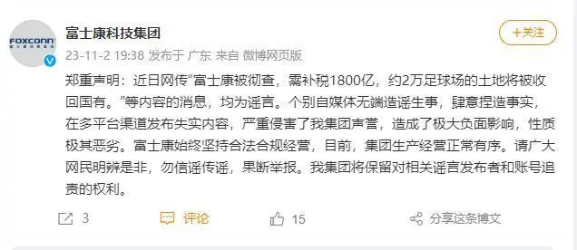 每经记者:王晶每经编辑:文多 11月2日晚间,富士康科技团体发布声明称:克日网传“富士康被彻查,需补税1800亿,约2万足球场的地盘将被收返国有”等内容的消息,均为谎话。个别自媒体无故造谣生事,肆意假造究竟,在多平台渠道发布失实内容,严肃陵犯了我团体荣誉,造成了极大负面影响,性子极其恶劣。富士康始终对峙合法合规谋划,现在,团体生产谋划正常有序。 克日,关于富士康旗下企业遭观察的消息受到外界关注。10月22日,《环球时报》记者从消息人士处获悉,税务部分近期依法对富士康团体在广东、江苏等地的重点企业举行税务稽查,自然资源部分对富士康在河南、湖北等地的重点企业用地环境举行现场观察。当日下战书,鸿海(富士康母公司)发布阐明文件回应称:“合法合规为团体在环球各地的根本原则。我们会积极共同相干单位的相干作业。” 图片泉源:新浪微博截图 逐日经济消息 |