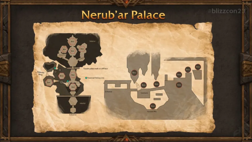 地下蛛魔帝国——尼布鲁宫殿将是《地心之战》资料片的第一个团队副本。这里将有蛛魔女王和萨拉塔斯之间的剧情,下面可以看到该团本的舆图。 |