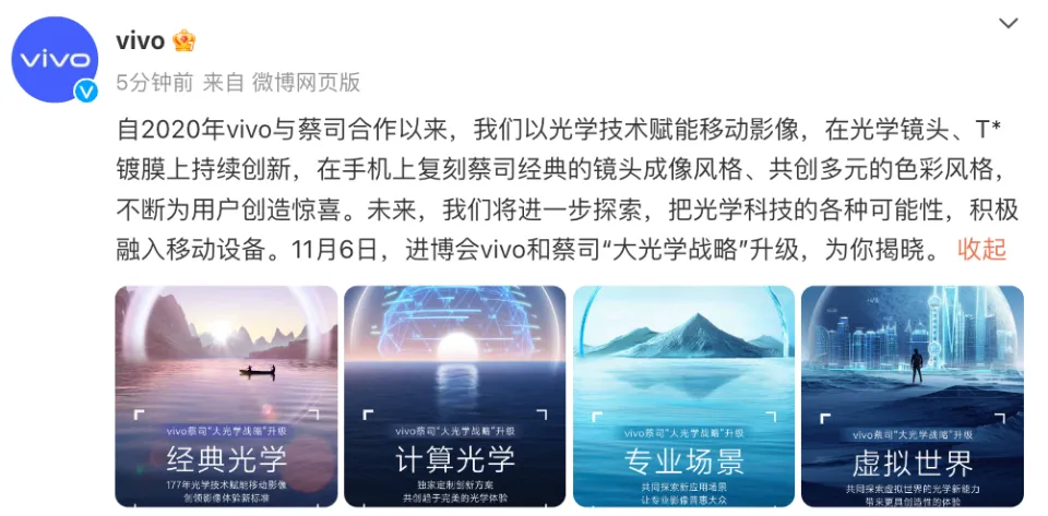 自2020年vivo与蔡司相助以来,我们以光学技能赋能移动影像,在光学镜头、T*镀膜上连续创新,在手机上复刻蔡司经典的镜头成像风格、共创多元的色彩风格,不停为用户创造惊喜。未来,我们将进一步探索,把光学科技的各种大概性,积极融入移动装备。11月6日,进博会vivo和蔡司“大光学战略”升级,为你发表。 |