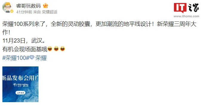 IT之家 11 月 8 日消息,光彩俱乐部本日发布 2023 光彩新品发布会招募公告,活动时间为 11 月 23 日 13:30,所在位于武汉。 ▲ 光彩俱乐部截图 据博主 @睿哥玩数码 透露,本次发布会有望带来光彩 100 系列手机,配备全新的灵动胶囊,采取更加潮流的地平线筹划,并称该产物为“新光彩三周年大作”。别的,据博主 @数码闲聊站 此前爆料,光彩 100 系列手机将于本月发布,这与光彩此次新品发布会时间符合。 据IT之家此前报道,光彩 100 系列手机有望搭载骁龙 8 系次旗舰平台,正面采取居中双孔筹划,而上一代的光彩 90 Pro 便采取了这一筹划。关于光彩 100 系列手机的设置可以参考光彩 90 Pro。 ▲光彩 90 Pro,图源官网 光彩 90 Pro 机型搭载骁龙 8 + 处置惩罚器,配备 6.78 英寸居中双孔曲面屏(2700*1224 像素),后置 2 亿像素超清大底主摄 (f / 1.9 光圈) +1200 万像素超广角微距镜头 (f / 2.2 光圈) +3200 万像素长焦人像镜头 (f / 2.4 光圈,支持 OIS 光学防抖),内置 5000mAh(典范值)并支持 100W 快充。 |