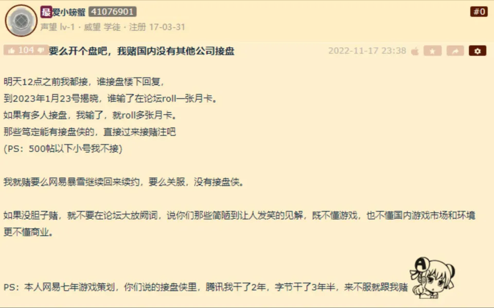 近来几天传出了一则消息,就是网易前员工表现暴雪游戏百口桶将会于来岁回归国服,而且接盘侠照旧猪厂,一开始着实并不信托这个消息,着实很简朴猪厂跟暴雪正在闹,而且是闹得不可开交的时间,以是续约大概性不大,但是农工再次发现一则消息的时间,似乎开始信托了,对于猪厂来说暴雪似乎无关紧要,但是对于暴雪来说似乎非猪厂莫属了。 本年四月份的时间,猪厂可谓对暴雪使用了重击,直接举行告状了暴雪,而告状暴雪的告急缘故因由着实就是由于暴雪拒绝负担国服玩家退款使命,并拒绝向网易付出国服退款相干的预付提成费用,涉及金额近亿元。看到这里农工只能说猪厂似乎有点本心,究竟暴雪还没有开始赔付的时间,猪厂先替暴雪把钱还给了玩家,此时猪厂在本身向暴雪举行讨债。 其他部分则是猪厂跟暴雪之间的协议,跟玩家们无关我们就吃个瓜而已,不外在九月份的时间猪厂着实打消了部分内容,而且将开庭时间延期到了24年1月份,一开始以为这个瓜应该就到这里了,但是别的一个瓜着实还在路上,而这个瓜近来是被网友们给挖了出来,而这个瓜却关乎暴雪国服能不能回归,大概说险些坐实了猪厂再续前缘。 这张图着实许多玩家应该已经看过了,各人猜的没错就是魔兽天下的商标被冻结了,按理来说最长冻结期应该是六个月,换句话说冻结期内暴雪险些没有办法举行重启魔兽天下,别的一点就是版号了,可别忘记了这玩意还在猪厂手里,以是暴雪跟猪厂闹,似乎暴雪并没有拿到多少上风,乃至在这场对决中暴雪照旧处于劣势。 以是团结这么多消息来看,暴雪似乎真的没有办法去探求新署理商,而且在微软公布完成收购暴雪之前,着实暴雪的全部精神应该放在了收购这件事变上面,而不是探求署理商,究竟署理商才几个钱,对于一个口碑崩盘的游戏来说,找到一个符合的接盘侠才告急,以是农工推测很长一段时间内着实暴雪并没有探求署理商。 一开始农工以为似乎有点不太大概,直到在某论坛望见了所谓自称网易前员工的爆料,似乎更加信托了这个说法,农工信托这个说法绝对不是由于一堆大V转发才信托的!根据该博主在客岁11月的爆料信息来看,至少有点准的,由于这个时间大部分的人着实都倾向于暴雪无缝衔接,真正爆料魔兽天下将会没有接盘侠的消息着实很少,究竟那段每隔两三天就有人说签约了,是某某,立即就签约了,效果到了如今还没有签约。 别的一个爆料信息则是24年肯定开服,而该博主给出的限期也不是2024年13月32日,而是5月12日,间隔这个时间只有六个月了,以是相对来说比力靠谱。别的一点则是猪厂告状暴雪的官司也延期到了来岁1月份,以是这些变动似乎都在暗示着魔兽天下即将回归,而接盘侠着实就是猪厂,只是如今各人还在推测大概是没有公开而已。 叠加别的一个消息,原网之易负责人张栋已经离职网易云音乐了,而且离职的时间没有挽留,作为一个云云强盛的人怎么大概会没有挽留,以是很大概就是暴雪国服要返来了,急需他回归,固然也不清除被挖走。以是农工团结如今的消息,只能推断出来暴雪大概率会和猪厂续约,那么各人以为呢? |