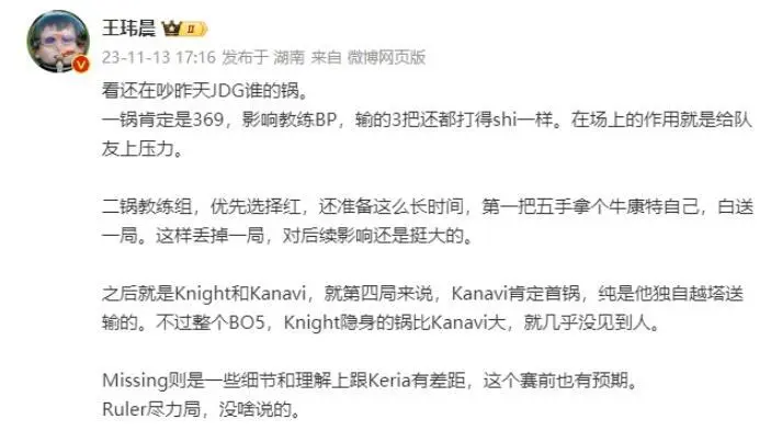 迩来S13角逐效果让人完全没想到,JDG战队不光没有拿下角逐,以致是羞辱的以3比1的效果输给了T1,这一届S13让我们体验了msi时LCK网友的感受了,在这场角逐竣过后,大量网友围攻JDG的选手。 比如一位着名圈内人出来分析了,他就是体坛周报记者王玮晨,他出来表现,JDG只有一人没责任,其他4人标题很大,没责任的就是ruler,他真的能做的都做了,无奈几位队友的活动确实让人恼火。 起首是369,他表现:第一锅肯定是369,影响锻练BP,输的3把还都打得shi一样,在场上的作用就是给队友上压力。小编也不想多说,各人去看录像好吧,他真的在拉扯了,没错,除了拉扯,其他什么都没干。 接着他表现:二锅锻练组,优先选择红,还预备这么长时间,第一把五手拿个牛康特本身,白送一局。如许丢掉一局,对后续影响照旧挺大的。除了这个之外,三放沙皇也是让人无法明白的利用。 第三是:Knight和Kanavi,就第四局来说,Kanavi肯定首锅,纯是他独自越塔送输的。不外整个BO5,Knight隐身的锅比Kanavi大,就险些没见到人。Kanavi第四局送了两波大节奏导致角逐败北,而Kanavi被对位三场MVP,真的是有够糯的。 第四是:Missing则是一些细节和明白上跟Keria有差距,这个赛前也有预期。确实,在角逐中,连续4场被ban掉洛,missing拿出射手辅助的表现很差,完全就是敌我辅助败北差距,被打的毫无性情。 固然很多人在吐槽,但是如今角逐已经竣事了,说再多也没用,如今把盼望拜托内WBG身上了,但是想要一支四号种子去挑衅T1,小编只能说输了不亏,赢了血赚,盼望他们不要有压力吧,对此你们有什么想吐槽的吗? |