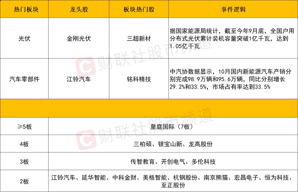 财联社11月15日讯,大盘全天高开后震荡回落,三大指数均小幅上涨。盘面上,新能源赛道股睁开反弹,锂矿、光伏方向领涨,金刚光伏、拓日新能、金圆股份、川能动力等涨停。汽车产业链个股午后走强,威唐工业、隆基呆板、铭科精技、迪生力等多股涨停。卫星导航概念股震荡拉升,湘邮科技、启明信息、华体科技涨停。钢铁、煤炭股体现活泼,杭钢股份、云煤能源涨停。下跌方面,短剧概念股睁开调解,中文在线跌近10%。总体上个股涨多跌少,超3300只个股上涨。沪深两市本日成交额9900亿,较上个生意业务日放量966亿 板块方面 本日新能源赛道方向睁开反弹,此中光伏板块涨幅居前,金刚光伏20CM涨停,海达股份、三超新材涨超10%,拓日新能、川能动力等个股涨停。消息面上中美两国发表相助应对气候危急声明,声明指出双方将聚焦能源转型,积极图取到2030年环球可再生能源装机增至三倍。 别的,工信部也对中国光伏产能是否过剩作出了回应。其以为中国光伏行业总体仍处在正常范围,其缘故起因在于:一是绿色低碳大趋势促使光伏行业大发展,得当的供大于求才气引导企业公道竞争,这是行业策划和市场竞争的正常征象;二是光伏行业总体属于泛半导体范畴,具有周期性发展特性,阶段性的震荡也是行业正常属性;三是光伏产业链条长、技能迭代快,且各环节创建周期不尽雷同,在肯定阶段大概出现结构性过剩征象。 从市场的角度来看,近期不少新能源赛道股于底部出现连续放量的情况,这或可视为部门机构资金举行仓位回补的信号,在超跌反弹的逻辑驱动下,赛道股后续仍有望反复活泼。但需注意的是,以如今市场的量能而言,仍无法支持起同时发动新能源赛道与科技两大方向,因此预计后续两大之间资金博弈或将愈发显着。 汽车产业链迎来反弹,此中华为汽车概念再度涨幅居前,江铃汽车、德赛西威、铭科精技等个股涨停,焦点龙头赛力斯也探底回升涨超3%。消息面上,工业和信息化部、交通运输部等八部门正式印发《关于启动第一批公共范畴车辆全面电动化先行区试点的关照》,确定北京、深圳、重庆等15个都会为此次试点都会,将推广新能源汽车超60万辆。 别的,11月9日,华为举行智界 S7 预发布会,11月10 日,阿维塔 在 A DAY发布会上正式表态 。智界 S7 、阿维塔12的上市不但催化市场感情,更为华为智驾 产业链厂商带来业绩收益和估值溢价的双重提拔。 卫星导航概念股震荡拉升,湘邮科技、启明信息、华体科技涨停。消息面上,马斯克旗下火箭公司SpaceX即将对其星舰体系举行第二次试飞。若试飞乐成,SpaceX大概动手实现马斯克预设的目的,即在来岁年底前用星舰发射星链卫星。马斯克在外交平台上发文表现,SpaceX的“星舰”(Starship)应该能在周五发射前及时获批。 从市场角度来看,无论是华为汽车照旧卫星导航均在此前履历反复震荡后,仍旧能维持中期向上的结构。特别在鸿蒙、算力方向于本日陷入整理的配景下再度自告奋勇,足以分析华为产业链内部徐徐形成轮动的局面,这无疑是有益于本轮华为概念炒作行情的连续,应对上,依照热门间的轮动节奏,把握低吸套利的机遇在当前的市场氛围下仍旧具有较高的胜率。 个股方面 从个股层面来看,本日市场感情连续提拔,两市近60只个股涨停,连板股数量也进一步提拔至16家。此中皇庭国际晋级7连板成为了市场高度的代表,并在动员下HBM概念股香农芯创、华海诚科也于盘中一度大幅冲高。汽车产业链同样活泼,银宝山新4连板、同一股份5天3板,江铃汽车2连板,而此前出现转弱疑虑的赛力斯也于本日盘中得到了较为显着的承接买盘,在资金回流下后续其产业链热度有望进一步扩散。别的,外贸概念股固然略有分歧但高标仍旧连续强势,此中开创电气20CM3连板、三柏硕4连板,后续这一方向或可成为较为独立的分支题材在盘中反复活泼。 后市分析 克制收盘,沪指涨0.55%,深成指涨0.72%,创业板指涨0.53%。北向资金全天净买入36.26亿元,此中沪股通净买入23.15亿元,深股通净买入13.11亿元。 本日市场固然在高开后有所回落,但克制收盘三大指数仍旧全线收涨,而且量能也进一步提拔万亿左右的水准,团体而言市场价量之间仍处于相对康健的架构之中。而从感情博弈的角度来看,本日两市的涨停以及连板股的家数进一步提拔,各大热门间也维持着相对良性的轮动局面,只要没有出现后续高标团体退潮的情况,以泛科技为主线的题材炒作风格大概率仍将连续。但需注意的是,大市值权重近期始终较为弱势,本日指数的高开回落也较洪流平受到权重股的拖累。而根据以往的履历来看一波反弹行情的连续,除了短线题材端保持活泼以外,权重搭台助攻的作用同样紧张,因此权重股可否转强同样也是后续盘面关注的重点。 本日市场感情进一步回暖,短线感情指标再度弹升至活泼区之上。 市场要闻聚焦 1、财政部:1-10月累计天下一样平常公共预算收入187494亿元 同比增长8.1% 财联社11月15日讯,财政部数据表现,1-10月累计,天下一样平常公共预算收入187494亿元,同比增长8.1%。此中,税收收入157841亿元,同比增长10.7%;非税收入29653亿元,同比降落3.8%。分中心和地方看,中心一样平常公共预算收入85870亿元,同比增长7.3%;地方一样平常公共预算本级收入101624亿元,同比增长8.8%。 2、香港特区政府:将股票生意业务印花税税率下调至0.1%的步调于11月17日起收效 财联社11