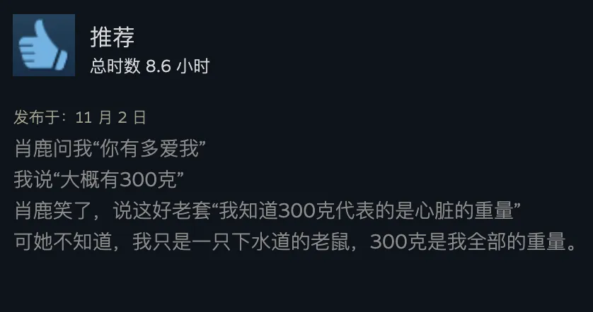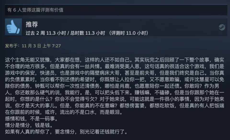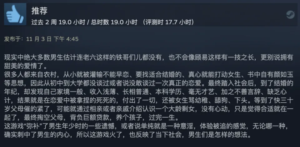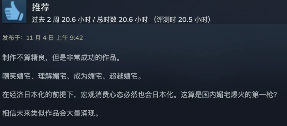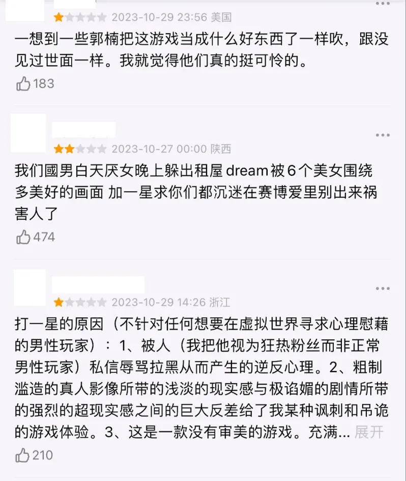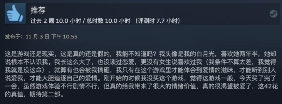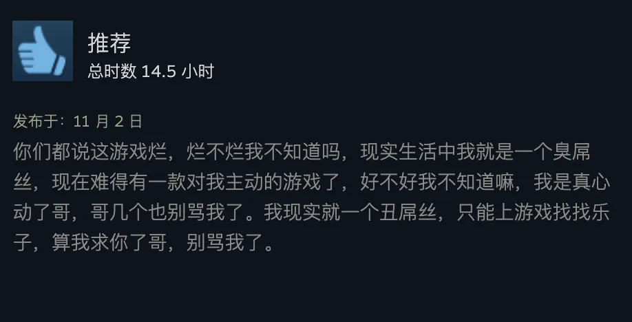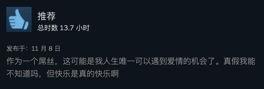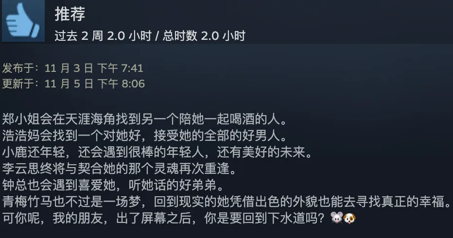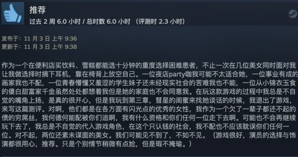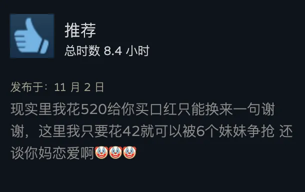出品 | 虎嗅青年文化组 作者 | 黄瓜汽水 编辑 | 渣渣郡 谁说中国没有科幻片? 游戏界最魔幻的一匹黑马,直接霸榜Steam国区排行榜,以致冲进了天下排行榜,数据好得吓人。 不是大制作也不是大IP,而是堪称粗制滥造的直男爱情模拟小游戏《完蛋!我被玉人困绕了!》。 这次,爱玩游戏和不玩游戏的人都沉默沉静了。 大胆的人先享受天下。 魅魔辣妹,清纯白花,性感辣妈,知性御姐,霸道总裁——我全都要。 制作程度拉垮,剧情毫无逻辑,UI计划像小时间玩的网页游戏。但只要敢想敢干,平替版高圆圆和迪丽热巴轮番给你洗脚也不是不大概。 你别说,《完蛋!我被玉人困绕了!》还真就做到了。 打开游戏之前嗤之以鼻,玩了6个小时之后,我的嘴角比AK还难压:这谁顶得住啊? 脑壳长着摄像机的男主顾易,被计划为让广大男性毫无代入门槛的纯血普男:创业失败负债300万,屁滚尿流来到新都会,除了会画画之外没什么闪光点,不是打杂就是端盘子。偏偏,六个花容月貌的女性,都当仁不让地爱上了他,为他费钱,为他痴迷,为他争风妒忌。 除非主角长得像吴彦祖,否则这剧情和短视频男频爽剧歪嘴龙王没任何区别。 但它就是火了。 按照玩家投票选出的热度排名,我们先来盘一盘这六个大内高手。 榜首的是魅魔辣妹郑梓妍,玩家圈子里传播着古老的歌谣:有妍选妍,无妍重开。 一头金黄色染发,俏皮火辣,蹦迪喝酒爱玩,一见面就自动约你去酒吧。第二天起床穿着男士衬衣,一副娇俏霸道的容貌让你负责,屏幕前的单纯男大弟子哪见过这种大局面? 郑梓妍的设定是不差钱的富姐,有话直说,热烈表达爱意,反复脱手自动寻求男主。 在郑梓妍的隐蔽了局里,玩家还可以体验刁蛮女友视频通话,颗粒度真实到让人以为本身真的在和郑姐谈一场胰岛素爆表的爱情。 有高端玩家以致为了郑梓妍写下万字社会学长文,拉来福柯和齐泽克二老为郑姐背书。 该作者以为,郑梓妍之以是最受男性痴迷,是由于她身上“从不规训对象”的精良风致:与实际生存中广大女性对男性施加的男德尺度相比,郑梓妍对你的唯一要求是“做本身”。 这不是女菩萨是什么? 榜二的是纯爱甜妹肖鹿。 肖鹿一张白月光毕业照,让万千直男夜半抹泪,痛哭流涕,悔不妥初。这就是全中国男性心中清纯初恋女友的容貌。 肖鹿是刚毕业的女大弟子,和顾易合租。当顾易没钱交房租的时间,肖鹿为了保住他的体面,乐意替男主垫付房租。这但是买一个两块五的头绳都会记账的寻常姑娘,本身没钱也要养男主。 如果按照肖鹿的主线玩下去,两个人终极就在合租房里过上了大部门年轻情侣向往的生存:一起做饭一起记账,一起逛公园看流星。如果你没有攒够肖鹿的好感值,她会委曲巴巴地对你说:是我配不上哥哥。 性感人妻林乐清,被玩家誉为“版本唯一真神”。 单独把绝顶身段这一项技能拎出来,就对其他几位选手形成扑灭性打击。为了均衡游戏性,制作组只能用“离异带娃”这个debuff来削弱脚色,效果没想到让一部门性癖小众的男性更高兴了。 林乐清被广大玩家密切称为“浩浩妈”,选择林乐清不是由于别的,只是想给浩浩一个家。她一出场,胸前就像装置了高光标记物一样寻常,让其他几位脚色黯淡无光。 不知道是不是由于演员神似AV从业者神木丽老师的缘故,只要有林乐清的情节,主创团队都在淡黄色的边沿浅浅摸索。摄像机的运镜从腿开始向上扫动,然后玩味地停顿在硕大的胸脯处。在衣柜里捉迷藏,男主还会和林乐清发生语焉不详的暧昧对白:“我喜好在下面”“我照旧在上面吧”。 在远景镜头,还会让林乐清通过做瑜伽等运动摆出抬高臀部的姿势,姿势背后的深意更是让男性玩家血脉贲张。性感尤物就算了,她以致还会跪下来捧着戒指向男主求婚——看得我小脑都萎缩了。 剩下的三位女性,分别是沈彗星、李云思和钟甄。 刁蛮公主沈彗星,是男主的两小无猜,正儿八经的权门令媛,但不知出于什么缘故,从小芳心只许男主,除了男主谁都不嫁。 身价不菲,但沈彗星偏偏在男主眼前是个抖M(官方认证),雷同于周星驰版《鹿鼎记》里的邱淑贞饰演的建宁公主,你越用力她越高兴。 高岭之花李云思,和男主从诗词歌赋聊到人生哲学,从毕加索聊到戴珍珠耳环的少女,甘心做男主的备胎,给男主安排工作,发自心田欣赏男主,慎重温柔。 在李云思的隐蔽了局里,她为了男主甘愿逃婚。 霸道总裁钟甄是排名末了一位的女性,可见我国男性确实对奇迹型女能人确实没爱好。 男主和钟总狗血地相遇在一场车祸中,可巧这位钟总侧脸神似高圆圆。钟总什么良好的男子没见过,但偏偏幸上了啥也不会的男主,动辄就是送银行卡送房产。 钟总乐意陪男主一起疯一起闹,一起在工地刷漆打灰,还会继承男主奉上的螺丝帽戒指,感动得像爱情脑癌。 游戏计划也很简单,简单到不少游戏老哥吐槽它又土又low又尴尬。 但他们的双手照旧很诚实地通关了。 100+条故事线,每一次选择都能指向差异的隐蔽了局。 如果一个标题答复错了,就倒归去重新选择。如果不喜好本身的了局,可以立刻重开。主打一个“不留遗憾”,一扫而空全部后宫,韦小宝一日体验卡得手。 比网飞的《潘达斯奈基》更接地气,比《底特律:变人》更有性张力。 如果说这个游戏最了不得的计划,那就是它频频将主人公放置在两难、三难、四难、五难的决定中心。 一众玉人明眸善睐,眨着眼睛撅着小