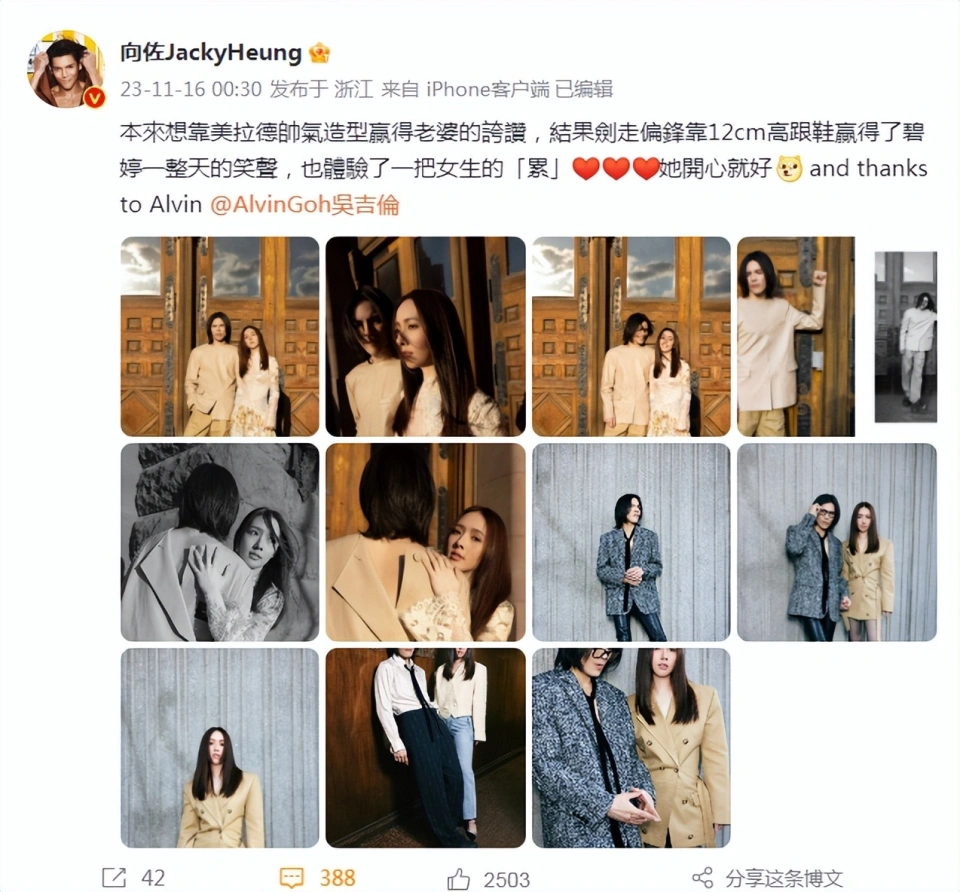 11月16日破晓,向佐在个人交际平台分享了一组和妻子郭碧婷的恩爱合照,他还发文称原来 想靠着美拉德帅气的造型赢得爱妻郭碧婷的夸赞,没想到末了竟然靠着剑走偏锋穿着12厘米的高跟鞋赢得了郭碧婷一整天的笑声。难过穿高跟鞋的向佐直呼“体验了一把女生的累”,文末一句“她开心就好”超宠溺。 晒出的照片里,向佐一如既往地披着一头齐肩长发,他穿了一件个性十足的西装上衣,搭配卡其色休闲长裤,上衣格局有点像反着穿的。别的,向佐还穿了一双12厘米高的高跟鞋,好抢眼啊有木有! 一旁的郭碧婷披着秀发,化着美妆,身穿修身格局碎花长裙,脚踩恨天高,举手投足都是满满的女神范儿。而且就这么看,郭碧婷看上去真的瘦了很多多少呀,瞧瞧这小细腰,简直美绝了有木有。 向佐上演唯美“望妻眼”,瞧瞧他一脸宠溺地看着郭碧婷,真是隔着屏幕都被夫妻二人的浓情蜜意给甜到了。 郭碧婷看着火线,被风吹乱的秀发为她增长了很多魅力,侧颜杀很绝啊。不得不承认,如今的郭碧婷固然少少出如今大荧幕上,但她的明星范儿丝绝不输从前。稍稍一妆扮,这气质以及气场就藏不住了,天生的大明星呀。 向佐继承看着妻子,而且还袒露超等辉煌光耀的笑脸。郭碧婷同样灿笑不绝,夫妻俩相处久了,这夫妻相也是愈发足啦。 另一个视角下,向佐和郭碧婷密切相拥。从这个角度看,向佐的外套真的是反着穿的诶,好有个性。郭碧婷搂着老公宽阔的背,时而望着镜头,时而看向一侧,每一帧都美得让人移不开眼。 向佐和郭碧婷还换了一套look,另一个造型里,向佐戴上了黑框眼镜,穿着西装、打着领带真空上阵,这玄色皮裤搭配玄色皮鞋着实惹眼啊。不得不说,向佐这次的造型确实是很有个性。 换下女神范儿满满的裙装后,郭碧婷穿上了卡其色风衣大玩下衣失落,她配了一条玄色丝袜,脚踩玄色恨天高,刹时女王气场爆棚。这身装扮下,郭碧婷的一双细直长腿全程抢镜,真的是又瘦又美。 向佐还分别晒出和爱妻的单人照片,夫妻二人均在镜头前展示最帅、最美的一面,无论哪个角度,都完善得无可挑剔。 末了一个造型里,向佐穿上了白衬衫和阔腿裤,配上休闲格局领带,还蛮帅的。郭碧婷穿着短款外套搭配牛仔裤,简朴搭配将她的女模样形状质完善展示,美翻众人。 别看向佐这次晒出的夫妻合照里,他和郭碧婷一个帅气逼人,一个漂亮大方,都无比惹眼。但在生存中,夫妻二人都非常接地气。 就在前一天,向佐还晒出了和郭碧婷教一岁儿子Isa打羽毛球的vlog。其时的vlog里,小可爱全程萌态百出,扎着三个小辫子还一度让网友误以为是小女孩,可爱得不得了。 而向佐和郭碧婷也没有在运动里的光彩照人,穿衣妆扮都非常接地气。特别是郭碧婷,穿着短袖短裤、拖鞋就出镜了,简直不要太抢眼。 向佐和郭碧婷完婚至今感情确实是毋庸置疑,但外界却时常质疑他们的婚姻、感情,幸亏无论是向佐照旧郭碧婷都一点没有被外界的浮名蜚语影响心情,夫妻俩仍旧低调且甜蜜地相爱着,真好。 如今两个宝贝都康健快乐发展,向佐和郭碧婷也甜蜜如初,齐备都越来越好,完善至极! 图片源于网络 |