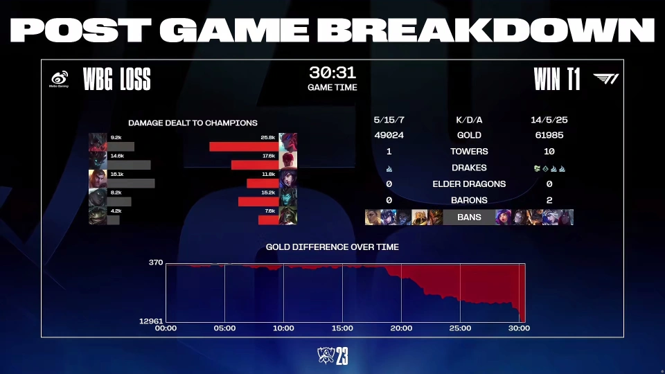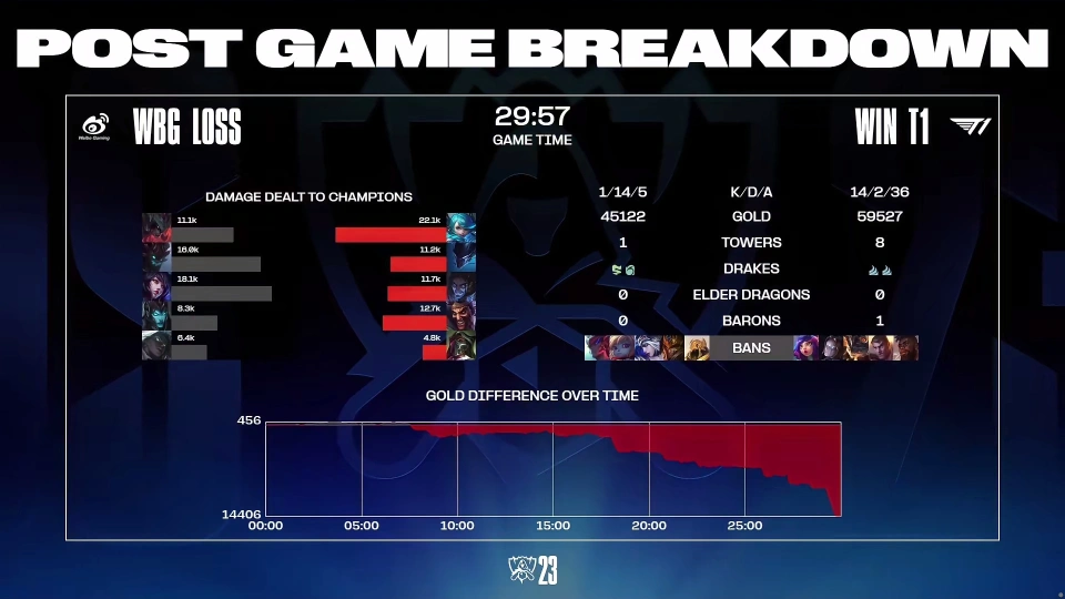 在颠末冗长的备战期之后,好汉同盟S13举世总决赛终极决赛,终于是在11月19日拉开了帷幕。究竟是Faker和T1四冠再封神,还是晒哥和WBG封神;是T1主场复兴荣光,还是WBG超过高山长河,百炼成金,就看这一战了! 坦率地讲,固然在赛前外洋电竞媒体和玩家均不看好WBG,但是囧王者作为LPL玩家,我不拒绝Faker和T1四冠再封神,但我更渴望看到WBG百炼成金! 只管WBG全队的S赛和MSI赛奖杯加起来,都抵不外Faker一人,但只要比赛还没有竣事,WBG仍旧是偶然机的。 Faker太强了,T1一穿四,横扫WBG四冠再登神!iG最快纪录,差点被破!纵观WBG和T1在本届天下赛的数据来看,两队无论是对版本的明确、还是好汉池和选手的发挥,均显现出了天下级的水准。而且本次决赛,除了小虎和faker这两名老对手的比武之外,更是有晒哥对阵后起之秀宙斯的一大看点。双方都有深不见底的好汉池,以及强横的对线本领,究竟谁能捧起召唤师奖杯,就看决赛的状态了。 第一局比赛,WBG蓝色方,禁用皇子、沙皇、塞拉斯、瑟庄妮、芮尔,选用剑魔、大树、杰斯、赛娜、塔姆;T1赤色方,禁用妮蔻、发条、兰博、艾希、韦鲁斯,选用恩、盲僧、阿狸、卡莉斯塔、烈娜塔 第一局比赛,WBG上路选择剑魔,中野茂凯和杰斯团体上半区强度很高,下路赛娜塔姆来对抗滑板鞋和烈娜塔;而T1上路选择永恩来Counter剑魔,下路也很强势,就看双方谁能在前期打出上风。 效果第一局比赛,双方在前15分钟打得比力胶着,谁也无法有用的将上风转为胜势。WBG在前期数次抓人得手,但T1仍旧是速龙战术。迁徙变化点发生在18分钟左右,盲僧中路打残杰斯后,T1以多打少的打出0换3完满团后,灵敏的将经济差距拉开到3000以上;拿的节奏的T1,在第21分钟,原地反打一波1换5大胜,斩获大龙后将经济差距拉开到8000以上,根本奠定胜局;终极30分31秒,T1再次斩获大龙后,团灭WBG,先赢一局! 第二局比赛,WBG蓝色方,禁用皇子、沙皇、寒冰,波比,选用剑魔、大树、阿狸、赛娜、塔姆;T1赤色方,禁用妮蔻、杰斯,桑奎提、发条,选用格温,塞拉斯、德莱文、烈娜塔。 先输一局的WBG,在第二局掏出了一套前期强势的阵容,阿狸和卡莉丝塔的下半区很必要上风;而则是以塞拉斯来应对,以期Faker在团战时偷茂凯大招,再加上烈娜塔的大招,团战强度直接拉满,就看双方前期谁能在下半区打出上风。 效果第二局比赛,囧王者不想过多的复盘了,WBG输得非常惆怅。T1将突破口放在了Theshy的上路,前期频仍的针对上路做变乱,但WBG控下前两条小龙;迁徙变化点发生在16分钟左右,T1打出1换4大胜后,直接一波拉开经济差距;拥有了经济上风的T1,得势不饶人,轻松克制WBG。终极在29分57秒,T1携大龙Buff推进,宙斯格温三杀一波竣事比赛,T1手握三个赛点。 T1在连赢两局之后,囧王者的心凉了——在好汉同盟举世总决赛电竞史上,此前2比0领先的队伍,终极全部都夺得了冠军。而且由于WBG输得太快,还导致了如果WBG在第三局在25分21秒内被击败的话,T1还会创造出最短S赛的决赛纪录。此前的最短S赛决赛纪录为S8决赛,当时IG仅用时85分49秒,就击败了FNC夺冠。囧王者只渴望WBG能赢一局吧,哪怕对峙过30分钟也好! 第三局比赛,WBG蓝色方,禁用皇子、艾希、烈娜塔、猴子、杰斯,选用凯南、卑尔维斯、沙皇、韦鲁斯、巴德;T1赤色方,禁用:妮蔻、发条、兰博、波比、奎桑提,选用剑魔、盲僧、阿卡丽、霞、洛 第三局比赛,背水一战的WBG掏出了一套四核阵容,搭配巴德,前期必须要围绕卑尔维斯来打上风;而上风方的T1,也是一套输出点比力多的阵容,但其阵容更偏节奏,本局双方依然要靠前期决胜。 第三局比赛,没有须要复盘了,面对强势的T1,WBG选手操纵都变形了。幸亏终极还是对峙过25分21秒,才输掉比赛,没有让T1冲破iG最速夺冠的天下赛纪录! T1轻松横扫WBG夺冠之后,他们成为好汉同盟天下赛汗青上,首支四冠王,也是首支克服同一个赛区四支战队夺冠的队伍。坦率地讲,这只能说T1和Faker太强了,横扫了整个LPL夺冠,心折口服!一名选手,十年还能拿冠军,WBG完满是被Faker一人打崩盘的。对此,囧王者只能说,这是“绝对统治”! |