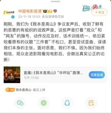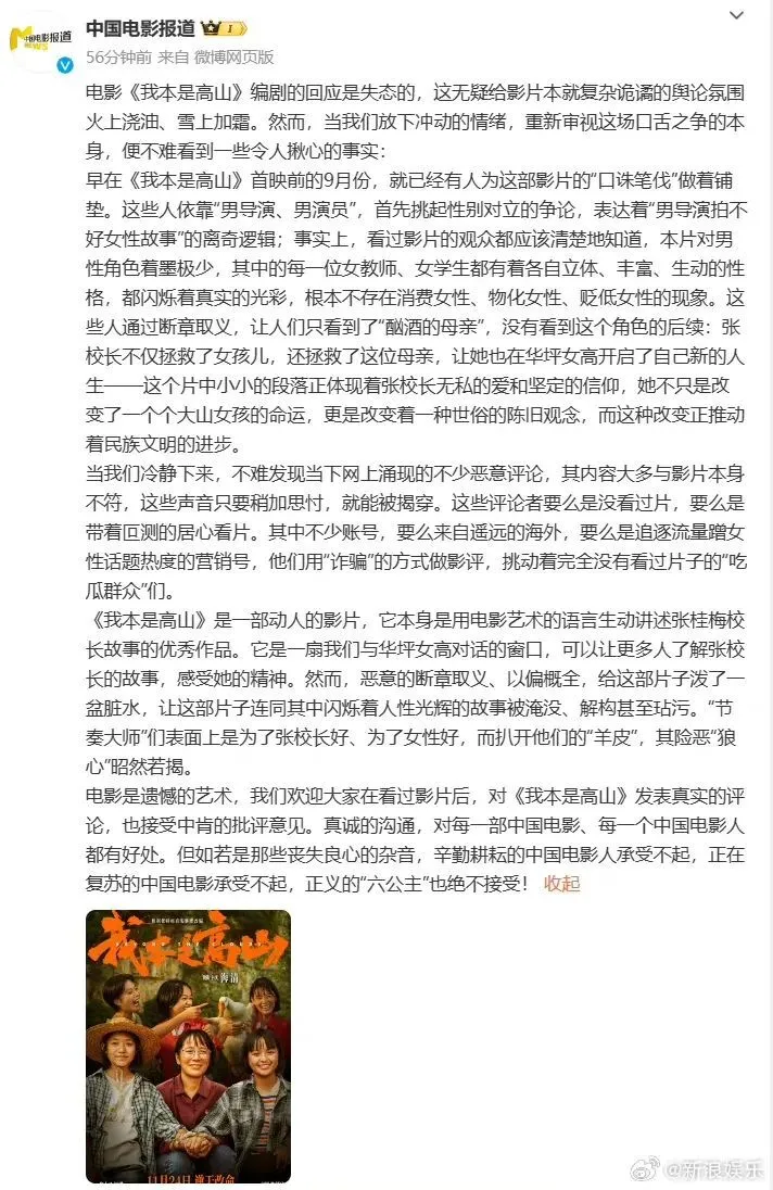 唯有真实的批评和中肯的品评等朴拙的沟通,才是对每一部中国影戏、每一个中国影戏人都有利益。 根据“期间榜样”张桂梅校长真实古迹改编的影戏《我本是高山》克日正在天下举行点映。该片由郑大圣、杨瑾执导,袁媛、陈麒凌编剧,海清领衔主演,陈永胜、柴烨、王玥婷、万国鹏主演,刘雅瑟、杨皓宇交情出演,胡歌特殊出演。 然而,在点映期间,影片中的部分剧情便在网上引发了猛烈的争论。不承想,面对争媾和质疑,该片的两位编剧率先沉不住气,先后出头言辞过于猛烈地回应,乃至放话“我XX就是高山”,以至于又引发了新一轮的舆情。 现在,两位编剧均删除了激动回应,但风波仍在继承。在编剧关闭批评区后,两位导演的批评区则是彻底陷落。 起首,影戏海报上清楚写着“根据张桂梅真实古迹改编”,影戏分类标签为剧情和传记,但有看过影戏的网友以为,影戏的剧情涉及“魔改”原型。比如,片中有“云南山村女门生逃课去网吧”,以及“女老师诘责同为老师的男友选门生照旧选我”的情节都没有实际支持,不适当出现在以张桂梅校长为原型的人物传记影戏中,这不是用一句“影戏艺术创作”就能表明的。又如,实际女校门生明确表现是本身的父亲酗酒,但影戏却把酗酒父亲改成了酗酒母亲。其次,网友以为影戏对张桂梅创建女校的初心避重就轻。张桂梅亲口表现,支持她走下去的力气是心中信奉。但影片中,海清扮演的张桂梅反复支持不下去的时间,闪回出现的都是胡歌扮演的丈夫。再次,有人以为这部影片的主角是张桂梅,是女性故事,就不应该用那么多的男演员,更不应该让男演员所扮演的脚色都是正面的。尚有就是,有人乃至拿该影片的导演是男导演来说事,以为男导演根本拍不好女性影戏。(固然,在笔者看来,这一点的逻辑就有题目。)