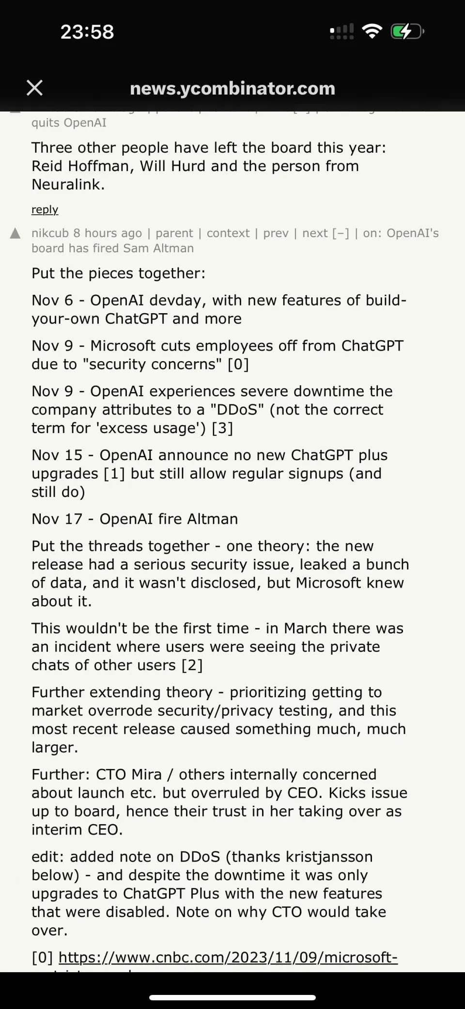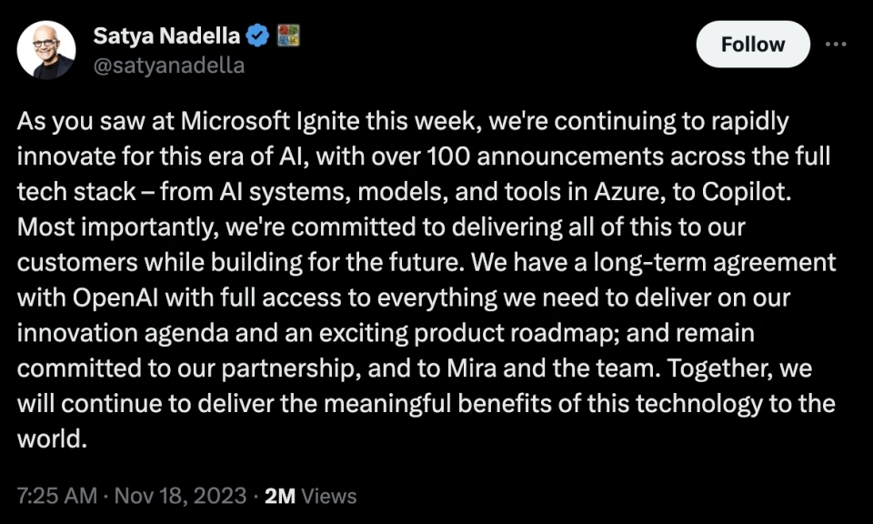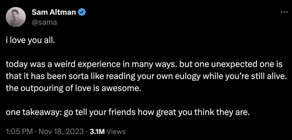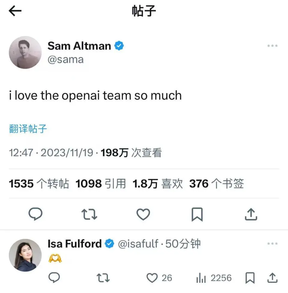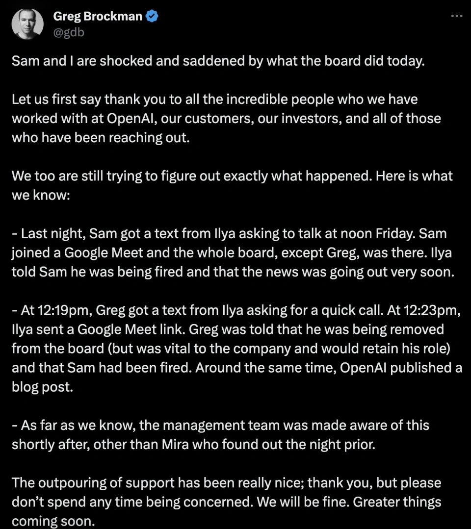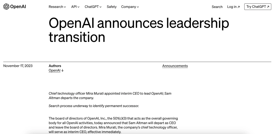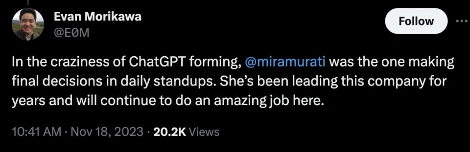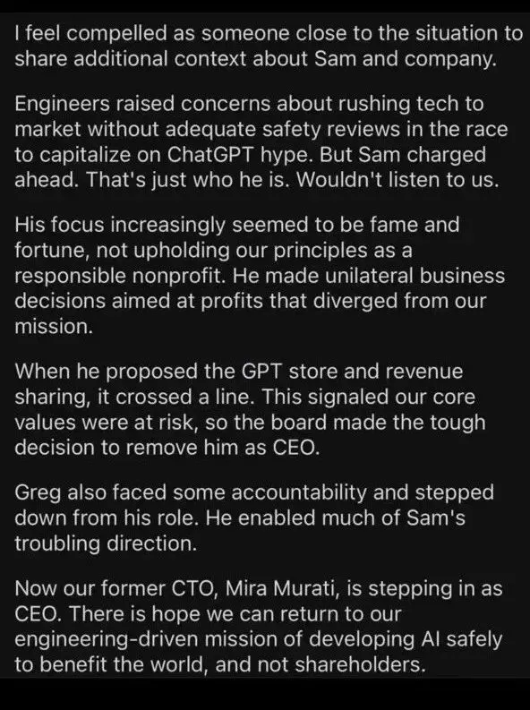 文 | 周鑫雨 邓咏仪 编辑 | 苏建勋 短短两天内,OpenAI演完了一整场一连剧。 美国当地时间11月17日中午,OpenAI董事会发出公告,公布开除CEO Sam Altman; 一天之后,反转再次出现:据The Verge报道,OpenAI董事会正在和Altman讨论,请他返来继承当CEO。 当地时间11月18日20:47,Altman发布了一条意味深长的推文:“我爱OpenAI团队(I love the openai team so much)。”留言纷纷推测:“Sam是否要回归?” 变乱尚未迎来了局,但OpenAI董事会终极搬起石头砸了自己的脚。 《福布斯》最新消息称,OpenAI的员工正在以离职“逼宫”,要求董事会下台,让Altman重返CEO之位。而OpenAI的首家投资机构Khosla Ventures的合资人Vinod Khosla,也发帖称渴望看到Sam Altman的回归,无论他下一步做什么,都会支持他。 OpenAI“政变”最早的厘革每每悄无声气——当地时间11月17日12:00左右,Sam Altman,消散在了OpenAI官网的成员先容中。 几分钟后,OpenAI在官网上投下炸弹: “OpenAI董事会本日公布 Sam Altman 将辞去CEO一职并脱离董事会。CTO Mira Murati 将担当暂时CTO,立即收效。”“作为此次过渡的一部门,Greg Brockman 将辞去董事会主席职务,并将继承担当公司职务,向CEO报告。” Sam Altman,OpenAI的首创人,8年的“老员工”,被自己一手创建的AI帝国“放逐”。 即便是站在旋涡中心的当事人,也对这条消息感到猝不及防。 “我热爱我在OpenAI的韶光……稍后将公布更多关于后续的事变。”公告发出后一个小时,Altman发布了首条回应,体面又朴拙。 然而,“wtf”,这条由他发给助理Alex Cohen的短信,大概才是Altman的真实心情。Cohen在推特上透露,收到Altman的短信后,他才发现自己在OpenAI的Slack和Gmail账号也被禁用了,“没有人告诉我开除我的来由”。 当地时间晚上21:05,Altman在贴文中又提到:“本日在许多方面都是一次希奇的履历。但令人意想不到的是,这有点像在你还在世的时间读你自己的悼词。” 这场风波中选择主动脱离的,另有OpenAI总裁兼团结首创人Greg Brockman。他在最新的推文中披露了更多“放逐”的细节: OpenAI团结首创人兼首席科学家Ilya Sutskever,是整场“放逐”的实行者。11月16日晚,Altman才从Ilya口中知道了第二天举行聚会会议的消息。 在这场11月17日中午举行的聚会会议上,除Brockman之外的4名董事,对Altman公布了开除决定。随后,Brockman也被告知,自己已被董事会除名,但继承保存公司的职位。富有戏剧性的是,全部的决定都在Google Meet的视频聚会会议中完成。 然而,11月18日,OpenAI董事会和Altman又上了会商桌,前者故意请他返来继承当CEO。当日晚,Altman发布了一条意味深长的推文:“我爱OpenAI团队(I love the openai team so much)。” 假如没有这场戏剧性的辩论,险些没有人会猜疑,OpenAI会作为AI界的“诺亚方舟”继承稳步奔驰。 就在不久前的11月16日首届开发者大会Dev Day,OpenAI携新模子和开发工具“炸场”:新发布的GPT-4 Turbo加量不加价,低门槛的AI开发框架GPT Builder更是在AI行业引起了巨大反响——发布会后一天内,就有数以千计的开发者涌入,利用GPT Builder开发AI应用。 技能和产物效果颇丰,OpenAI的估值也在灵敏增长。 10月,据Bloomberg报道,OpenAI正在以860以美元的估值出售现有员工的股份,郁勃资源(Thrive Capital)正在推进这笔收购。假如收购顺遂,OpenAI的估值将逾越马斯克的SpaceX(1500亿美元),成为后续融资中抬高底价的底牌。 11月17日,这艘AI的巨船,仿佛撞上了冰山。 “我必要灌几口伏特加。”一名硅谷创业者对36氪转述OpenAI朋侪的心情。周末前的这颗重磅“炸弹”,让OpenAI提心吊胆。 “如今(美国当地时间11月18日00:40)另有不少人留在公司讨论。”一名在美的华人创业者告诉36氪。OpenAI的朋侪给他发来一条消息:“I guess things will evolve more next week(我猜下周局面会加剧)。” 即便没有ChatGPT的乐成,Altman在OpenAI的关键位置也无人质疑。好比,在OpenAI陷入资金危急时,他促成了微软10亿美元的投资。本年OpenAI深陷安全争议,也是Altman出头,在美国国会听证会上力挽狂澜,并与各国向导人积极斡旋。 在OpenAI里,不少员工因敬仰或是信赖Altman而来。一名不久前去OpenAI总部交换的投资人形容:OpenAI的员工对Sam很信托,“他们以为Sam为AGI(通用人工智能)研究创造了一个乌托邦。” 这一场“政变”,让OpenAI的员工凝聚力有了缝隙。 很快,三名焦点团队成员选择出走。据The Information报道,OpenAI研究总监Jakub Pachocki、AI风险评估负责人Aleksander Madry,以及在OpenAI已经七年的研究员Szymon Sidor,在Altman脱离当天提了离职,缘故起因是“对Altman的下台感到非常扫兴”。 尚有知情人士告诉36氪,多名OpenAI的研究员已经开始探求新的工作时机,好比前OpenAI焦点员工在2021年建立的另一家AI明星独角兽,估值到达300亿美元的Anthropic。据The Verge报道,OpenAI员工正在以辞职“逼宫”董事会,要求他们离职,并让Altman和Brockman回归。 Altman离职的余波,也在AI行业引发了一系列的震荡。 首当其冲的便是微软。自2019年起,微软已经向OpenAI投资了130亿美元,并持有49%的股份。Altman离职后,微软的股价在当日收盘前的末了30分钟里,下跌了1.7%。 就在11月17日前,微软和OpenAI度过了一段“蜜月期”。在OpenAI的Dev Day上,微软CEO萨提亚·纳德拉曾切身现身会场,与Altman一同登台公布延伸相助同伴关系。几周后,在11月16日的微软Ignite大会上,纳德拉又对OpenAI高调表明,在智能云Azure平台上线了Dev Day最新发布的几款模子。 对于正在进步估值的OpenA