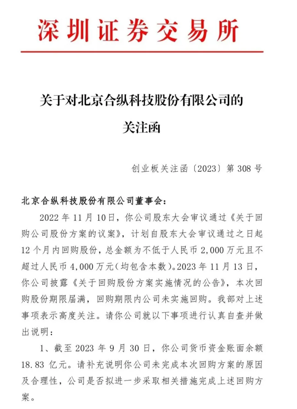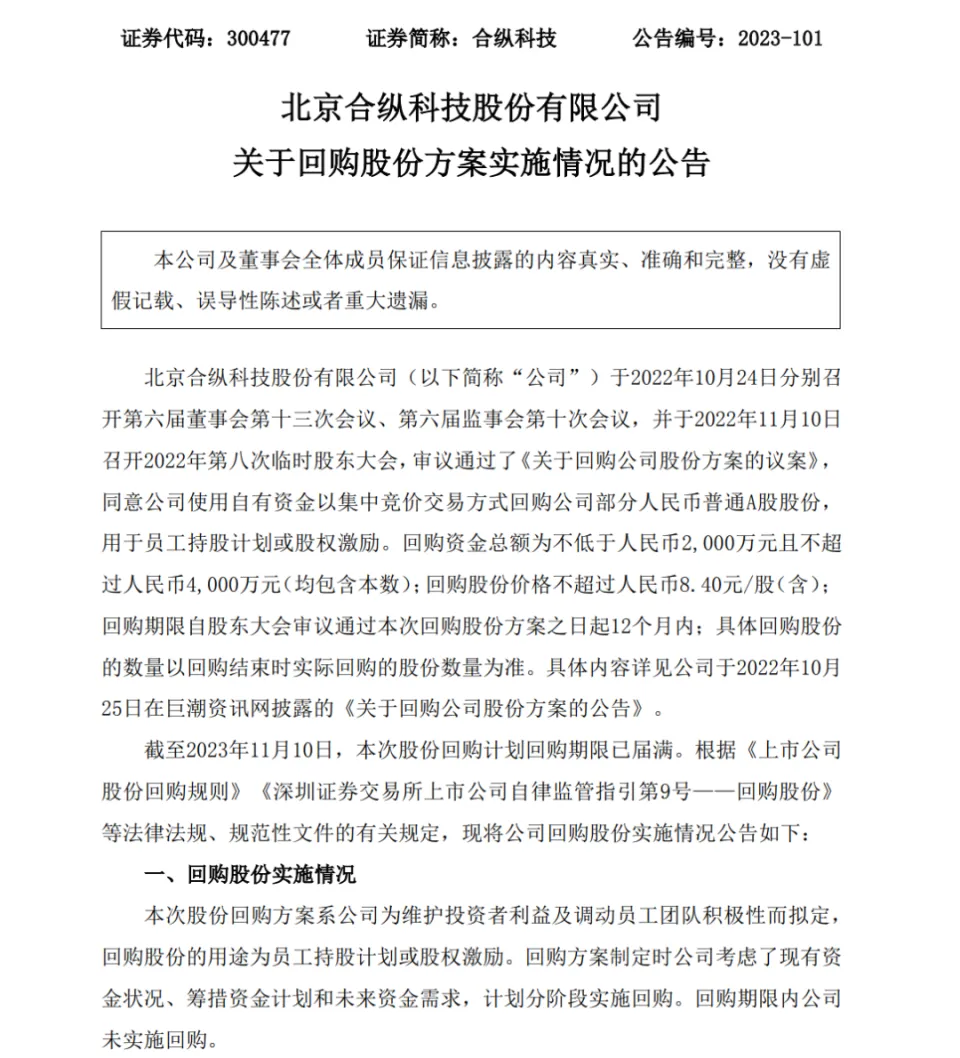 每经编辑:黄胜 11月17日,合纵科技(300477.SZ,股价4.29元,市值45.99亿元)连发两份公告,内容均涉及公司答应回购却未实行。 合纵科技此前曾答应回购2000万元至4000万元回购股份,然而时隔一年却未实行。值得留意的是,制止本年三季度末,公司货币资金账面余额为18.83亿元。 对此,厚交所、北京证监局灵敏采取了羁系举措。 曾答应回购股份2023年11月13日,合纵科技发布关于回购股份方案实行情况的公告。 根据公告,公司于2022年10月24日分别召开第六届董事会第十三次聚会会议、第六届监事会第十次聚会会议,并于2022年11月10日召开2022年第八次暂时股东大会,审议通过了《关于回购公司股份方案的议案》,同意公司使用自有资金以会合竞价交易业务方式回购公司部分人民币平凡A股股份,用于员工持股筹划或股权鼓励。回购资金总额为不低于2000万元且不凌驾4000万元(均包罗本数);回购股份代价不凌驾8.40元/股(含);回购限期自股东大会审议通过本次回购股份方案之日起12个月内。 合纵科技体现,本次股份回购方案系公司为维护投资者长处及变动员工团队积极性而制定,回购股份的用途为员工持股筹划或股权鼓励。回购方案订定时公司思量了现有资金状态、筹措资金筹划和未来资金需求,计分别阶段实行回购。 但是在回购限期内,公司并未实行回购。 对此,公司表明称,回购限期内,一方面,公司重点开辟并实行风电、光伏、储能等智慧能源干系的EPC业务及干系装备制造,公司现实资金使用及储备需求有所增大;另一方面,回购限期内,特殊是2023年以来受产业情况、市场代价下跌等因素影响,公司锂电池正极质料板块业务的收入、毛利大幅降落,造成公司业绩大幅下滑,公司融资难度增长,造成肯定的运动资金压力。为保障公司业务正常开展,优先满足生产谋划资金需求,公司未能完资本次回购。 羁系灵敏脱手11月17日,厚交所向合纵科技下发关注函。厚交所指出,制止2023年9月30日,公司货币资金账面余额18.83亿元。要求公司增补分析未完资本次回购方案的缘故原由及公道性,以及是否拟进一步采取干系步伐完成上述回购方案。 别的,厚交所要求公司团结订定回购方案的目标、公司财务状态等,增补分析公司在订定回购方案时的决定是否充足审慎,回购代价、回购限期等干系安排的设置是否公道;公司及发起人是否存在使用回购方案炒作公司股价、误导投资者的情况。 同日,北京证监局向合纵科技下发《关于对北京合纵科技股份有限公司采取责令改正行政羁系步伐的决定》。 根据行政羁系步伐决定书,回购限期内公司未实行回购,合纵科技违反了《上市公司股份回购规则》第三十六条的规定。 根据规定,北京证监局现对公司采取责令改正的行政羁系步伐,并将干系违规举动记入诚信档案。别的,公司应充实汲取教导,切实进步信息披露质量,包管信息披露信息的真实、准确、完备,信息披露实时、公平,制止雷同题目再次发生。公司应当在收到决定书之日起10个工作日内报送书面整改陈诉,并按照整改限期完成干系回购事项。 据中国证券报,回购可以彰显企业代价,向市场通报企业代价被低估的信号,加强投资者信心。但有的公司却借回购之名,行炒作公司股价之实,到期未按答应实行回购。 对此,证监会干系负责人此前体现,对“忽悠式回购”露头就打。以此防范上市公司和干系主体借助回购实行使用股价、内幕交易业务等违法举动,也就是防范“忽悠式回购”举动。 逐日经济消息综合公开信息、中国证券报 |