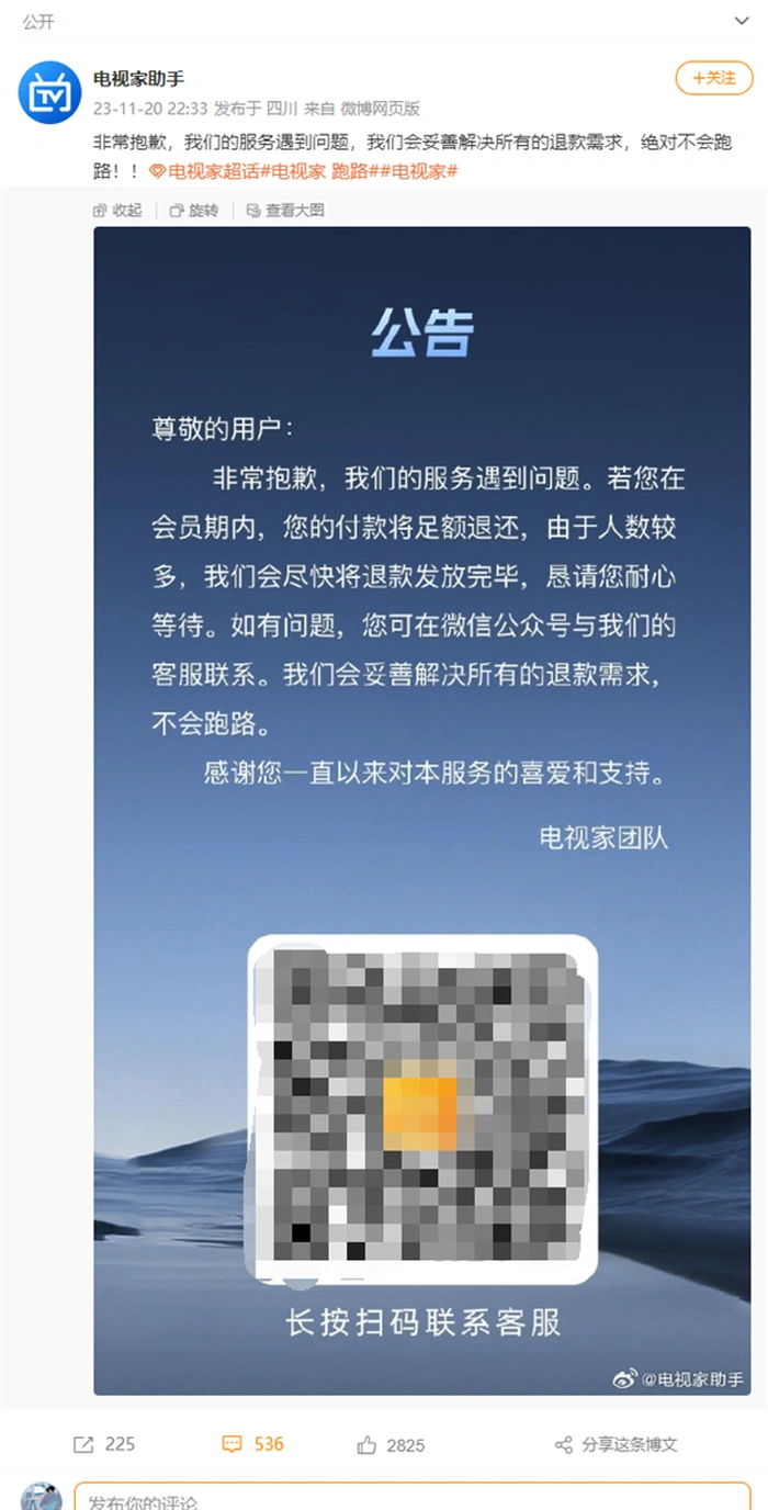 11月20日,着名电视直播类APP“电视家”一系列动作引起网友关注。 今后,连续有网友发现,其电视端的电视家APP已经无法利用,启动后体现如下公告: 图片泉源:微博网友 页面公告体现:根据广电总局对互联网电视直播业务的规范要求,本产物从克日起停息服务。我们对此决定深感遗憾,并对给您带来的未便深感歉意。感谢您的明白和支持,并一起服从干系法律规定。 20日22时30分左右,其微博@电视家助手和微信“电视丰数”先后发布公告,称“服务碰到标题”“您的付款将足额退还”“绝对不跑路”。 其微信阅读量很快高出10万+,“电视家跑路”的话题也冲上微博热搜。 21日,电视家苹果和安卓的手机端,各频道都卡顿在节目封面,无法播放。 记者试图咨询官方客户克制服务的缘故起因,发现各渠道客服均自动复兴同样内容。 “电视家”是一款看电视直播的视频播放器,其在华为商城的官方先容说,提供央视、卫视、地方台超2000个电视频道在线直播观看。电视家在华为商城的安装到达2887万次,其VIP会员一年代价约60-90元。11月21日,其官网也为无法访问状态。 企查查体现,电视家背后为北京家视通科技有限公司,创建时间2017年,员工2人,注册资源仅8万元。2023年9月21日,该公司因“登记策划场合无法接洽”被石景山区市场羁系局列入“策划非常名录”。实在控人彭亚明有8条被限定高消耗的纪录,该公司涉及26个司法案件,此中57.69%案由为“陵犯作品信息网络传播权纠纷”。 泉源:企查查 本年10月,国家广播电视总局办公厅发布了《国家广播电视总局办公厅关于规范电视直播频道业务秩序的关照》(以下简称《关照》),《关照》明白指出,当前,电信运营商与互联网电视集成平台违规相助、电视机厂商与地方有线电视网络公司违规相助,通过开放的公共互联网渠道开展“互联网电视直播”等业务,一些地方已发生了巨大播出安全事故,直播节目源泉源不明、非法插播风险高、公共互联网传输节点多易受攻击等已构成对电视安全播出的巨大风险,严峻影响广播电视意识形态安全。 《关照》指出,为深化管理电视“套娃”收费工作,规范广播电视传播秩序,要按照“遏制增量、管理存量”的原则,果断遏制“互联网电视直播”业务增量,确保电视业务的意识形态阵地安全。 |