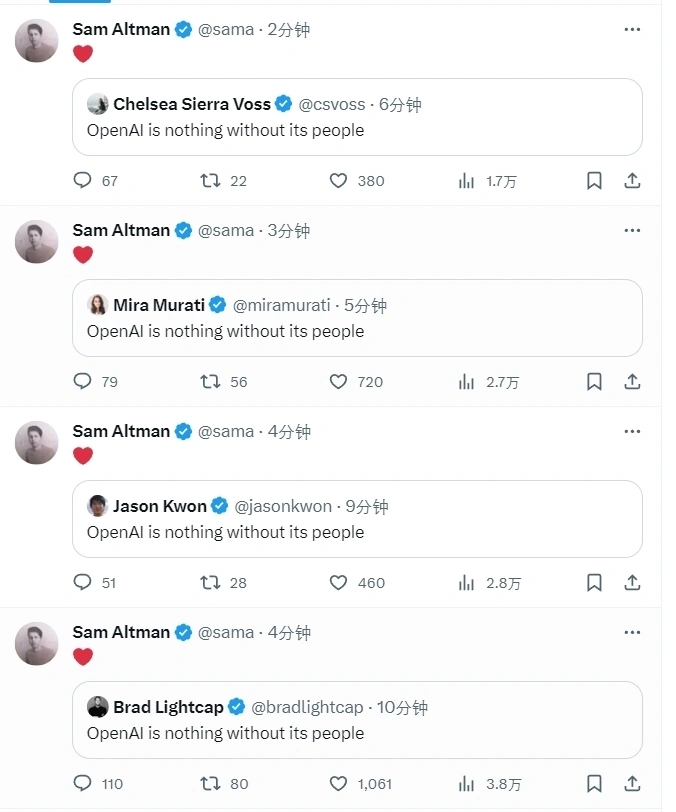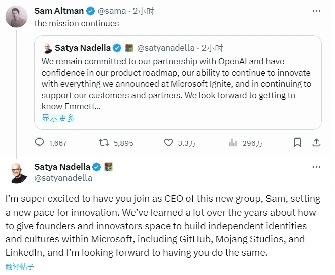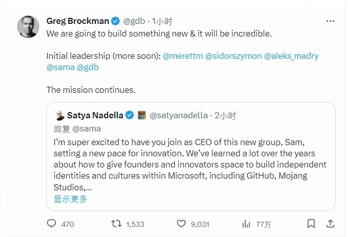 每经记者:李孟林每经编辑:兰素英 OpenAI的“宫斗”大戏好像迎来一个临时的节点:阿尔特曼重掌CEO的远景幻灭,转投微软。OpenAI新任命的临时CEO则深夜发推,公布自己未来三十天要办的三件大事。 北京时间11月20日下战书约4点,微软CEO萨蒂亚·纳德拉公布,阿尔特曼以及跟随他一起辞职的OpenAI前董事会主席兼总裁格雷格·布罗克曼将参加微软,向导一个新创建的“先辈AI研究团队”,并将“快速办法,为他们的乐成提供所需的资源”。 不外,纳德拉并未透露新AI团队的详细信息。阿尔特曼转发表现:“使命继续”。 另一边,OpenAI新的临时CEO,前Twitch CEO 埃米特希尔(Emmett Shear)发推,对自己的临危奉命表达了坐卧不宁之意,并公布将彻查阿尔特曼被开除的颠末,形成陈诉。他还将听取各方意见,并改造向导层团队,以期尽快稳固军心,规复外界对公司的信托。 然而,包罗首席技能官和首席运营官在内的OpenAI高管则公开发推,表达了对阿尔特曼的支持,在AI范畴毫无着名度的希尔恐难以服众。 阿尔特曼转投微软据The Information北京时间11月20日早间报道,OpenAI董事会掉臂微软等大股东和一众高管的压力,不乐意让阿尔特曼回归,而是约请了亚马逊公司旗鄙俚戏流媒体网站Twitch连合首创人、前CEO埃米特希尔继承临时CEO。 OpenAI的技能魂魄人物——首席科学家及董事伊尔亚·苏茨克维——表现,他和其他三名董事表现,他们对峙开除阿尔特曼,由于这是守卫OpenAI远景的“唯一起径”。苏茨克维还表现,阿尔特曼的活动以及他与董事会的互动情况,陵犯了董事会监视公司AI开发的本领。 另一边,微软CEO纳德拉公布,阿尔特曼和“密切战友”布罗克曼将参加微软,向导一个新创建的“先辈AI研究团队”,并将“快速办法,为他们的乐成提供所需的资源”。阿尔特曼转发表现:“使命继续”。 不外,纳德拉并未透露新AI团队的详细信息。他复兴阿尔特曼表现:“你来继承新团队的CEO让我超等高兴,设定了新的创新步调。” 图片泉源:X.com 布罗克曼的推文透露了些许详细信息。他表现:“我们将打造新的东西,它将难以置信”,他还公布了开端的向导团队,除自己和阿尔特曼外,还包罗别的三名OpenAI的高管:OpenAI原研究总监雅各布·帕奇科(Jakub Pachocki)、人工智能潜伏风险评估团队原负责人亚历山大·麦得利(Aleksander Madry),以及在OpenAI工作七年的研究员西蒙·西德(Szymon Sidor)。这三人均跟随布罗克曼一道从OpenAI辞职。 图片泉源:X.com OpenAI临时CEO上任“三把火”纳德拉言语之间好像已经继承了OpenAI任命新的临时CEO的实际。他表现,微软仍然服从和OpenAI的互助搭档关系,对自己的产物蹊径图布满信心,同时“等候熟悉埃米特希尔和OpenAI的新向导团队”,并与之共事。 北京时间11月20日,希尔在X平台上“官宣”了消息,并提出了未来三十天将推出的三项使命。从行文中可以看出,希尔也是接到电话那一刻才知道这个决定。他还澄清道,董事会开除阿尔特曼并非出于AI安全上的详细分歧,但毕竟是什么缘故原由仍然成谜。别的,董事会对OpenAI的模子商业化是支持态度的。 以下为希尔的推特原文翻译: “本日我接到一个电话,约请我思量一个千载一时的时机:成为 OpenAI 的临时CEO。在与家人探讨并颠末几小时的思索后,我继承了。由于儿子(现在已经9个月大了)的出生,我辞去了Twitch CEO的职务。与他共度韶光就像我预想的那样充实,我很乐意克制全职工作。我之以是继承这份工作是由于我信赖OpenAI是现在存在的最紧张的公司之一。当董事会分享了情况并要求我继承这个脚色时,我没有容易做出决定。终极,我感到我有使命在力所能及的情况下提供资助。 本日我不停在积极地消化这个消息,与董事会、少数紧张互助搭档交谈,并谛听员工的意见。我们与微软的互助仍然牢固,我未来几周的重点将确保我们将继续为全部客户提供优质服务。正如您大概猜到的那样,OpenAI员工非常令人印象深刻,而且非常以使命为导向。很显着,围绕Sam(阿尔特曼)去职的过程和沟通处理处罚得非常糟糕,这严肃陵犯了我们的信托度。 我为未来30天订定了一个三点筹划: 1. 约请独立观察员深入观察整个导致这一变乱的过程,并天生一份完备陈诉。 2. 继续与尽大概多的员工、互助搭档、投资者和客户交谈,做好记录并分享关键要点。 3. 鉴于近来的去职情况,将管理和向导团队改革为一支有效的力气,以推动为客户创造结果。 根据我们从这些方面学到的统统,我将推动构造厘革,包罗须要时鼎力大肆推动庞大管理厘革。我将在30天内渐渐推出这些厘革,由于它们变得清晰起来。OpenAI的稳固和乐成太紧张了,不能让如许的动荡扰乱。我会积极办理关键题目,只管在很多情况下,我信赖取得真正盼望大概必要凌驾一个月的时间。 我对Sam和整个OpenAI团队所创建的统统只有恭敬。这不但是一个令人难以置信的研究项目和软件产物,而且是一个令人难以置信的公司。我继承任命正是由于我清晰这一点,而且我想尽我所能掩护它并使它进一步发展。 现在破晓1点,我未来日诰日不屈不挠。 别的:我在这里发布此消息是由于我以为在这种情况下,这种做法符合公众的长处,但请不要盼望全部未来的内部沟通都通过公共渠道举行。 别的:在我继承这份工作之前,我检视了变动背后的缘故原由。董事会不是由于任何关于安全性的详细分歧而罢免阿尔特曼,他们的来由与之完全