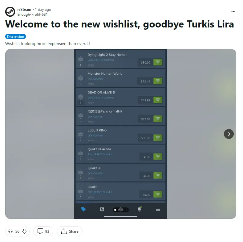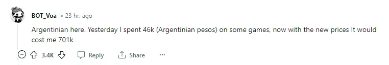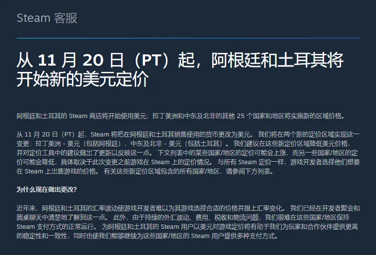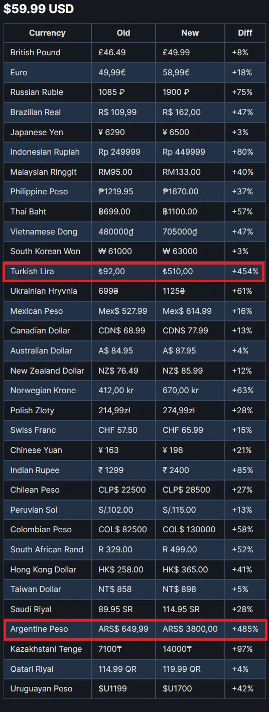 低价区的夕阳。 北京时间11月22日破晓2点,Steam秋季促销活动如约而至。这次特卖连续一周,又有上万款游戏打折。 但在又一次举世范围内的玩家狂欢中,阿根廷和土耳其的玩家们完全高兴不起来。他们刚在一夜之间从低价区来到了高价区,平台上大多数游戏的代价飙升,远非扣头所能赔偿。 近一个月前,Steam发布公告,筹划对阿根廷和土耳其的订价举行调解,作为订价基准的阿根廷比索和土耳其里拉同等改成美元。 这本质上相当于取消了阿根廷和土耳其区。原有的两个区将被分别并入两个“地区订价”的大区,分别是“拉丁美洲”(LATAM)和“中东及北非”(MENA)。两个大区加起来有25个发展中国家/地域,这些国家/地域的游戏订价尺度同一使用美元,而非本地货币。 公告称,这一改动是为了办理“汇率颠簸”题目,游戏开辟者很难为这两个区选择符合的代价并跟上汇率变革。 思量到比年来阿根廷和土耳其这对一丘之貉的货币大幅贬值,这两个区之外的玩家还时不时跨区过来白嫖低价区福利,“汇率颠簸”大概只是G胖的一种“规矩用语”。 早在2021年,V社就故意办理题目,遣返跨区的Steam用户。2022年10月,Steam又发布了一份新的开辟者订价工具,资助开辟者们同一差异地域的订价尺度。 按这一尺度重新订价,一款订价60美元的游戏,放到土耳其区的涨幅高达454%,而阿根廷区的发起订价上涨了485%。 开辟者订价工具姑且只是一种没有束缚力的发起。而修改订价单位,则是一种告知。11月20日、秋促开启两天前,V社兑现了允许,用美元为阿根廷和土耳其区订价。 从这一天起,在Reddit的Steam子版块,涌现出大量的阿根廷和土耳其玩家,对上涨了数倍以致数十倍的订价表现愤怒和伤心。 一则帖子标题写道:“对于土耳其和阿根廷人而言,本日是Steam的末日(The End of Steam)。” 以阿根廷区为例,根据SteamDB网站的汗青数据,不少着名游戏都涨了价。 本年新发布的作品涨价幅度相对较小。《博德之门3》的代价从28.25美元(比索折算代价)上涨至35美元,《星空》从折算后的33.91美元上涨至42美元,《任务召唤:当代战役3》从折算后的56.52美元上涨至70美元。这三款游戏的订价涨幅均在24%左右。 而一些自觉布以来多次贬价的老游戏,涨到了令阿根廷玩家们不可继承的地步。比方,《孤岛惊魂5》的代价从折算后的14.12美元涨至48美元,力度高达240%。《星露谷物语》的环境更浮夸一些,从折算后的0.5美元涨到了15美元——原先的30倍。 顺带一提,《暗黑粉碎神4》似乎是个反例,从折算后的79.13美元,降落到了尺度的70美元订价。不外,这很大概是由于暴雪此前从未认真思量过部门国家的具体订价。 V社在那则公告的Q&A环节表现,开辟者可以手动修改“拉丁美洲”和“中东及北非”大区的订价,从而不使用默认的美区订价。以《黑帝斯》为例,美区订价为25美元;“拉丁美洲”大区的订价则被手动调解至4.99美元,相较原阿根廷区的折算后订价,只贵了5%。 虽说V社存在推卸责任的猜疑,但开辟者/发行商都收到了明确的关照。在11月20日之后,凡是在那25个国家/地域的订价上涨至(或下跌至)美区原价的游戏,要么是开辟者/发行商忘记了或还没来得及修改订价,要么,就是他们不在乎这些国家/地域的市场。 何况以上的讨论均忽略了一个条件:Steam的市肆订价均为税前代价。仍以阿根廷为例,在2023年买游戏的税率高达100%,意味着现在的阿根廷玩家,购买一部订价未经修改的游戏,要耗费两倍于美区订价的代价。 至少在开辟者/发行商志愿给出一份更低的订价之前,阿根廷和土耳其玩家们绝对无法继承新的订价尺度。 只管具体的数据很难确定,但据外媒相干报道与本文截稿时的汇率,土耳其的月度最低工资为11402里拉(2023年6月数据,折合约483美元);阿根廷为69500比索(2023年3月数据,折合约195.25美元)。 很难想象,一个阿根廷人乐意省吃俭用攒出140美元,只为购买一部《任务召唤》。 在可预见的未来,阿根廷和土耳其的经济形势不会得到明显改善。美区订价加额外税收构成的天文数字,令正版游戏变成了一种奢侈品,超出了这两个国家里多数玩家的蒙受范围,无异于逼迫性的斲丧降级。 阿根廷和土耳其玩家眼下面对的处境剪不绝理还乱,其责任无法单独归咎于政府、V社、开辟者/发行商、“精力阿根廷/土耳其人”中的任何一方。 Reddit上有批评以为,这次订价尺度的修改,将会让这两国的PC玩家们告别正版数字游戏,大概说至少是Steam上的正版游戏,转而投入Epic、微软市肆,以致盗版资源的度量。这起事故很大概成为两国游戏市场走向畸形发展的开端,但唯偶然间可以或许验证这一点。 |